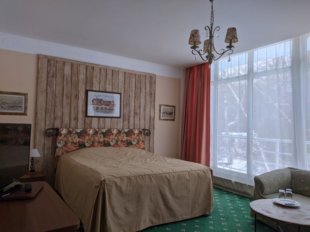 Уютный однокомнатный номер с большой высокой кроватью с балдахином, панорамным остеклением, балконом с видом на парк отеля, большой ванной комнатой 10 кв.м.