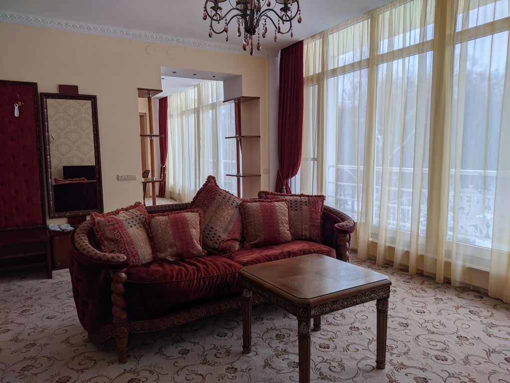 Люкс оформлен в классическом стиле, имеет кухню-гостиную с роскошным кухонным гарнитуром (встроен холодильник, раковина и электроплита), СВЧ-печью, чайником, круглым столом и 4 стульями, ТВ-зоной с диванчиком и электрокамином. В спальне кровать king-size, 2 кресла, шкаф, сейф. И в гостиной, и в спальне панорамные окна и балконы с видом на парк. В санузле ванная с гидромассажем, раковина, туалет, биде.