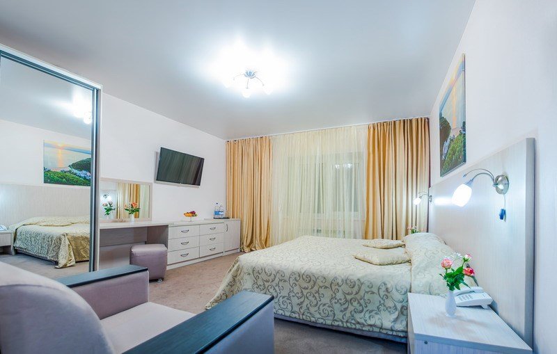 двуспальная либо две 1,5-спальные кровати, санузел с душем, кондиционер, ТВ, холодильник, сейф