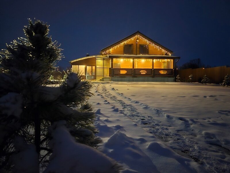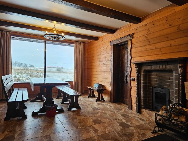 База находится в живописном уединенном месте. До ближайшего дома около 300 м, поэтому гостей не беспокоит посторонний шум. Подъездные пути удобные и после снегопада дорогу оперативно чистят дорожники. На территории есть парковка, рассчитанная на 25 автомобилей.