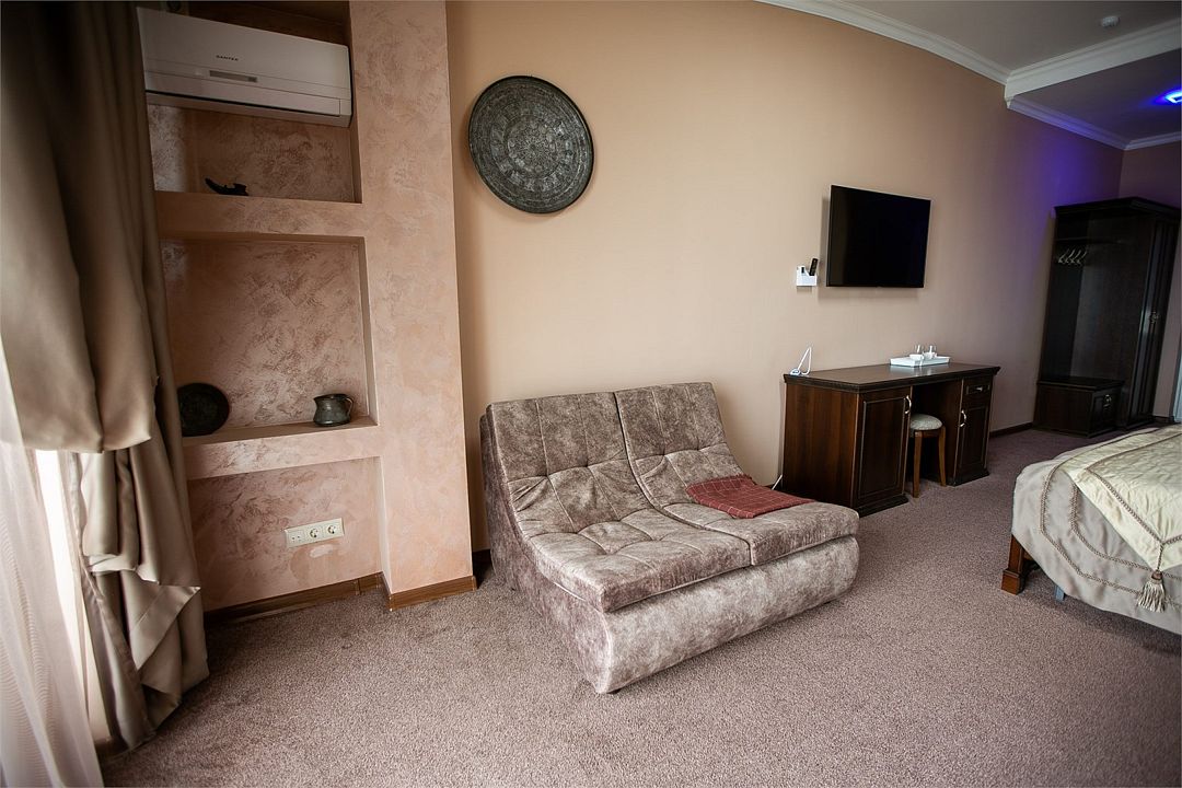 Путешествие в одиночкуКавказское гостеприимство и современные удобстваГостеприимный персонал и со вкусом обставленные ресепшен, коридоры и одноместный номер. В ванной: зубная щетка, гель и шампунь в саше, мыло твердое и жидкое, тапочки халат. В номере: отлично работающий кондиционер, большой телевизор, чайник, холодильник. Отель выходит прямо к морю и расположен достаточно далеко от центра в тихом районе.