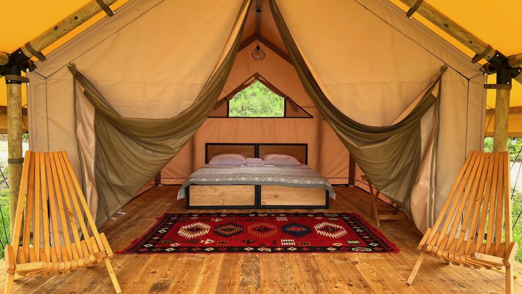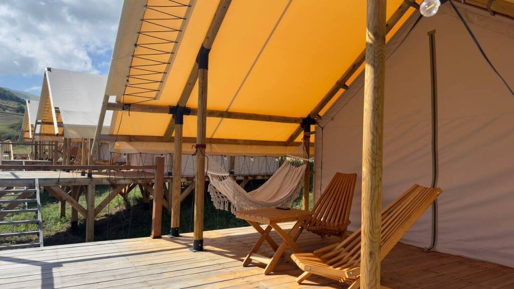 «Caspian Camp» — место для вдохновения и единения с горами. Глэмпинг расположен в Аймаумахи, в зеленой долине возле горной речки. Искусно организованное пространство с отдельно стоящими глэмпингами дает одновременно и нужное чувство уединенности, ценное для момента отдыха, и ощущение пребывания в «своей» компании. Все бунгало расположены так, чтобы их террасы были видовыми и гости могли наслаждаться природой без помех.