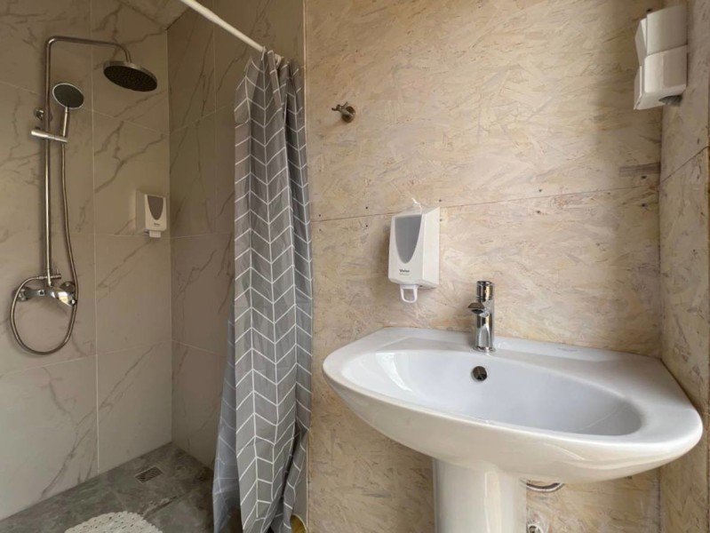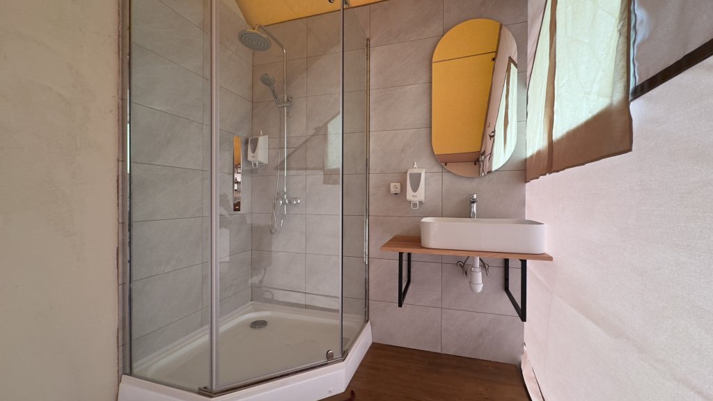 Глэмпинг с большой двуспальной кроватью 160x200 или двумя раздельными кроватями 80x200. Кресло-кровать раскладывается в дополнительное спальное место 80x200. Санблок с душевой кабиной в отдельном здание, при заселение дается ключ от персонального блока.