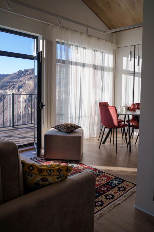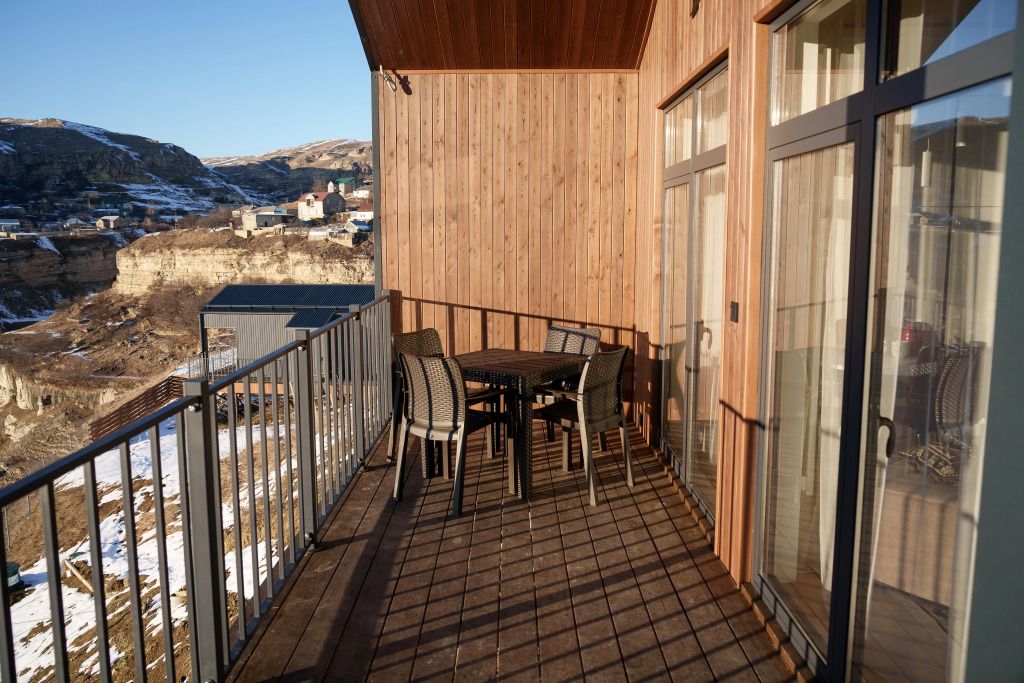 В домике с террасой могут расположиться от 2-х до 4-х человек. Интерьер и все убранство оборудовано необходимым для комфортного отдыха и проживания: санузел, спальня, кухня-гостиная, набор посуды, плита, холодильник, посудомоечная машина. На территории работает бесплатный Wi-Fi. Специально для автопутешественников организована бесплатная забетонированная парковка. Магазин есть в ближайшем селе в шаговой доступности. Ближайшая аптека находится в с. Муги в 13 км.