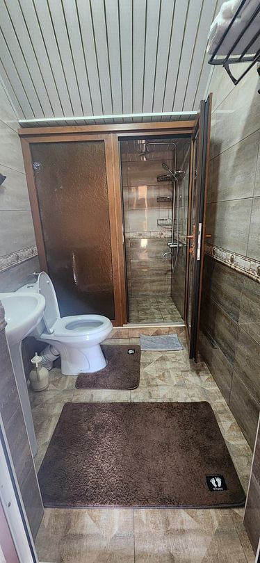 Индивидуальная ванная комната: душ, раковина, туалет.
