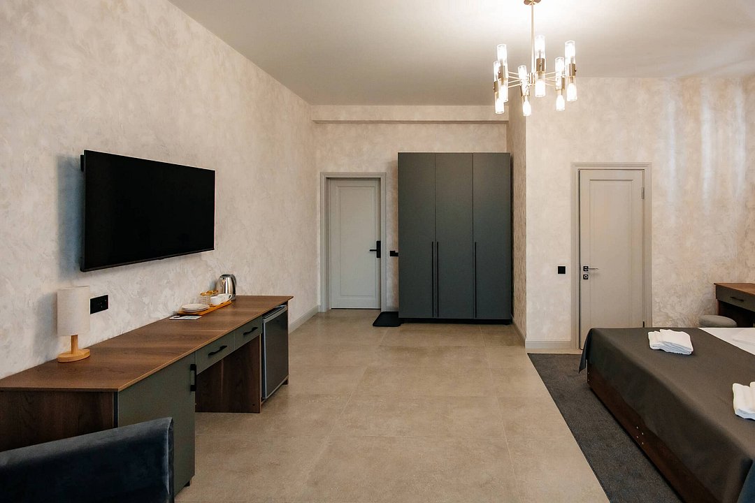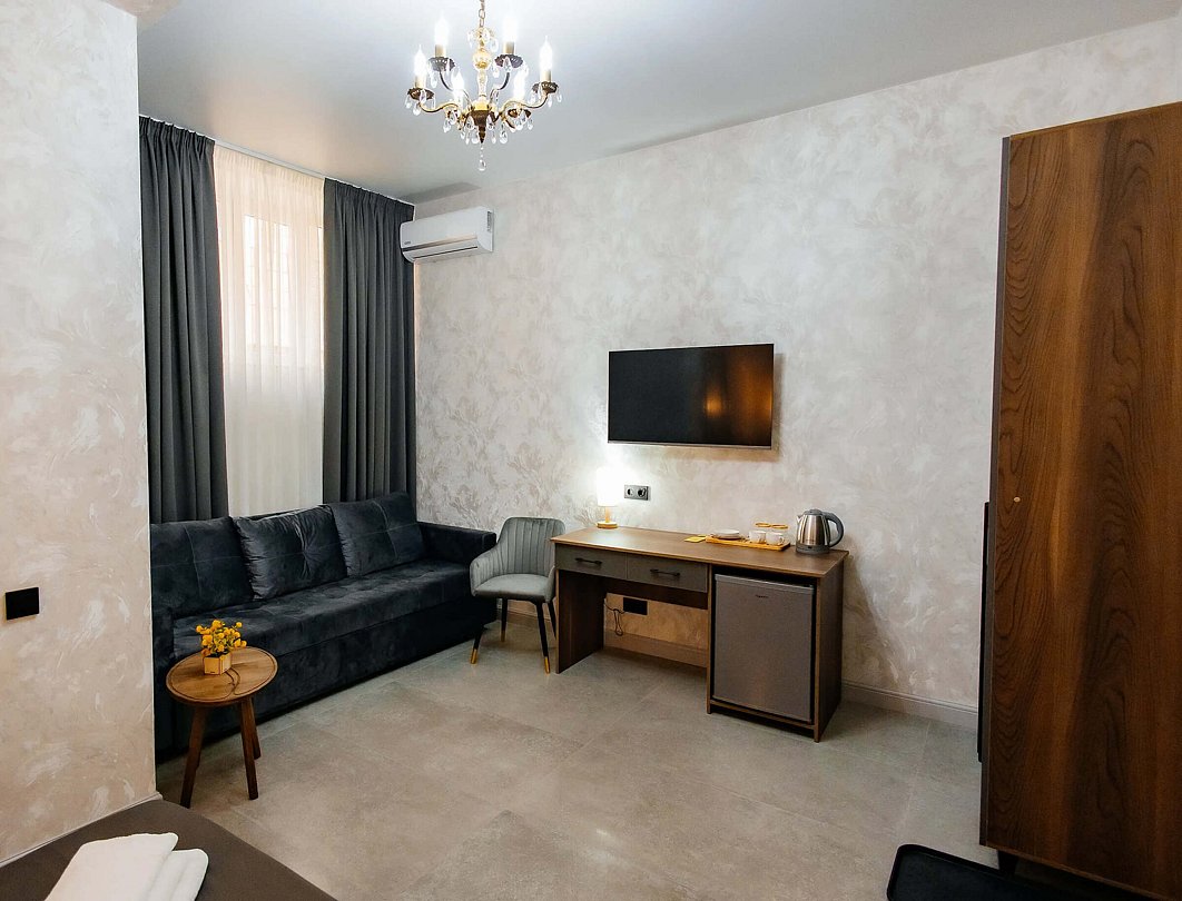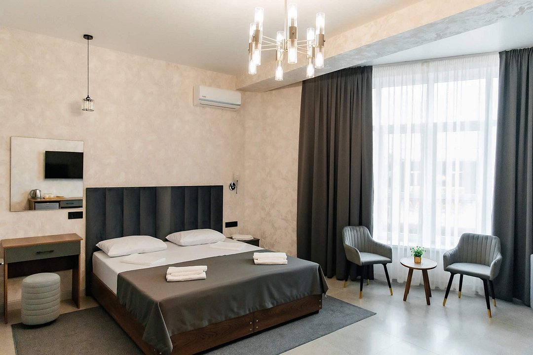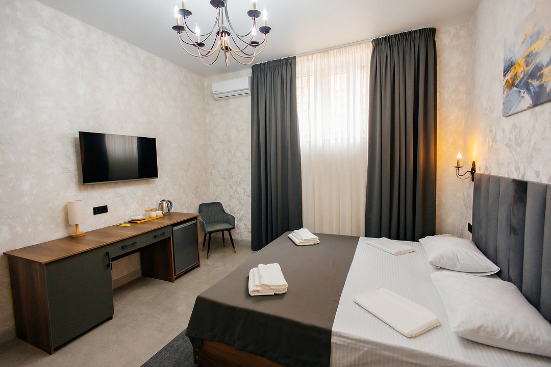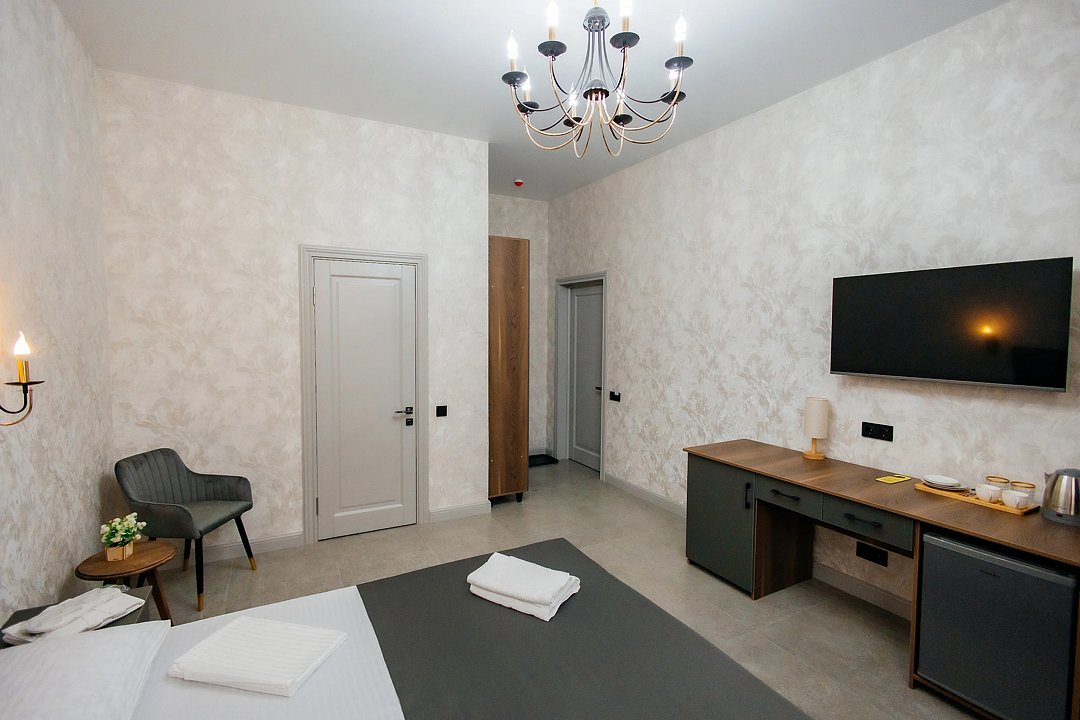 Номер оснащен всем необходимым для комфортного проживания: удобная мебель, современная техника, стильный интерьер. Большие окна пропускают много света, создавая атмосферу лёгкости и простора. Гости оценят качество постельного белья и полотенец, а также чистоту и порядок. Из окон открывается вид на древнейший город.