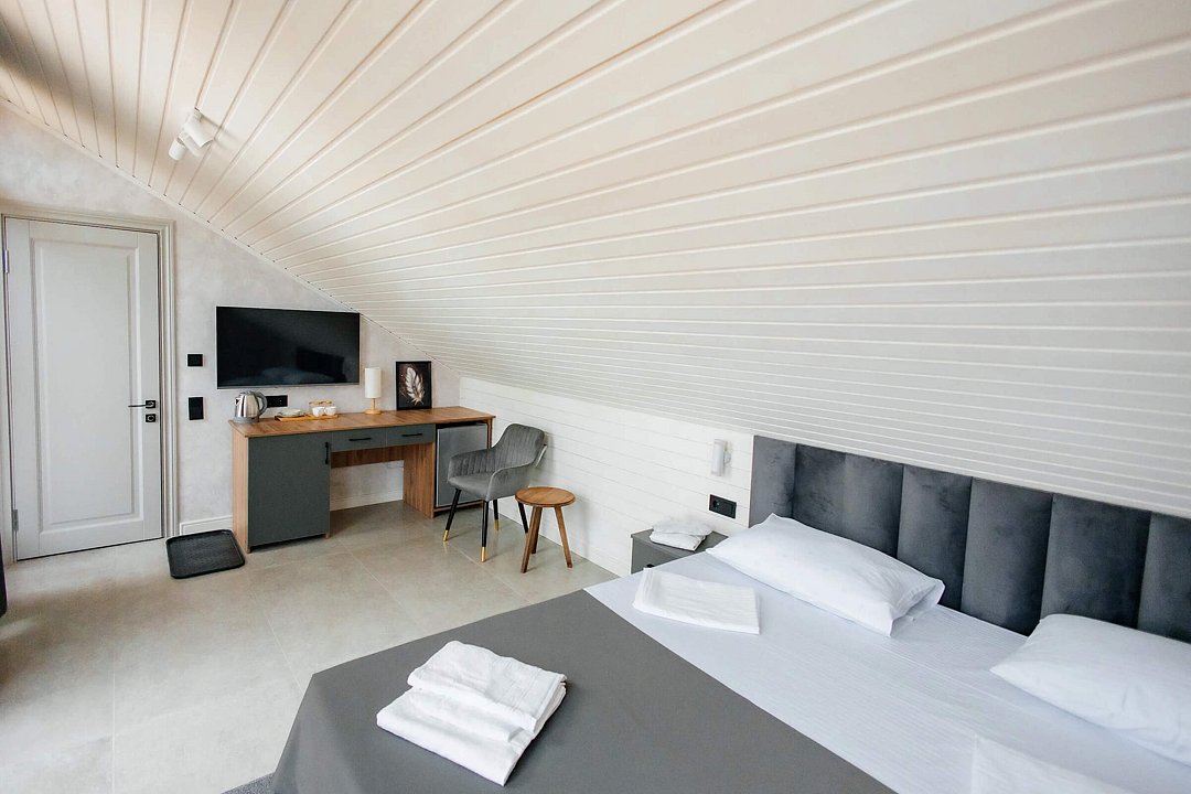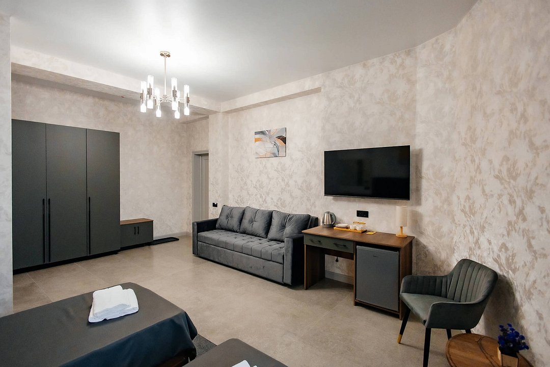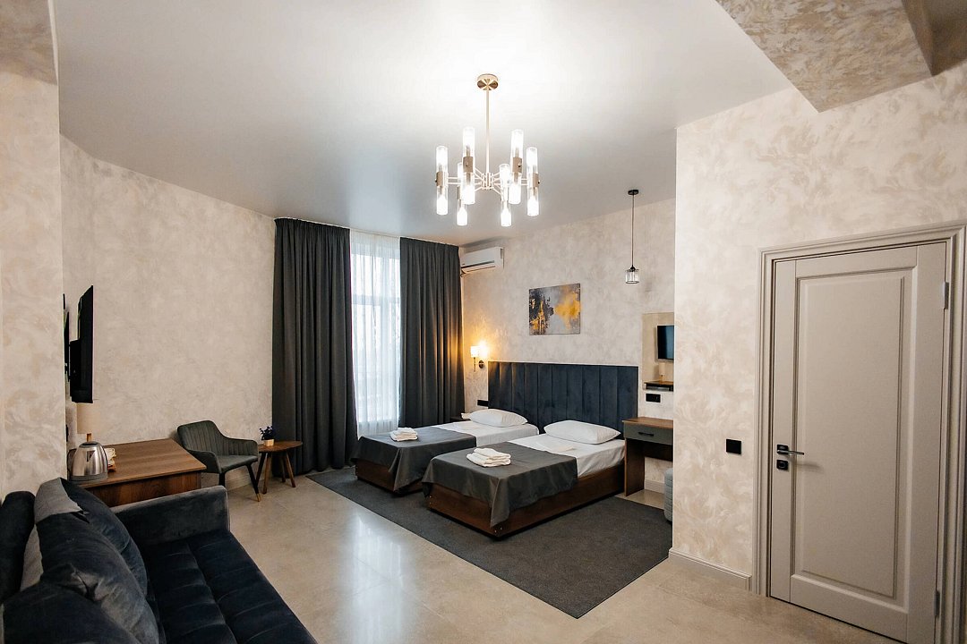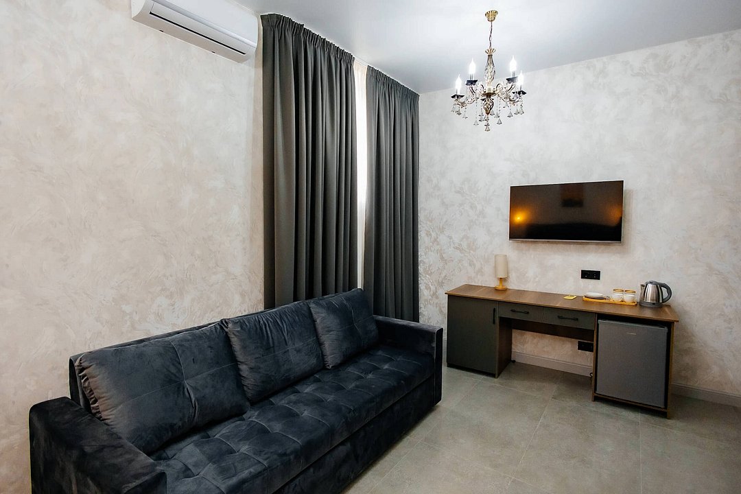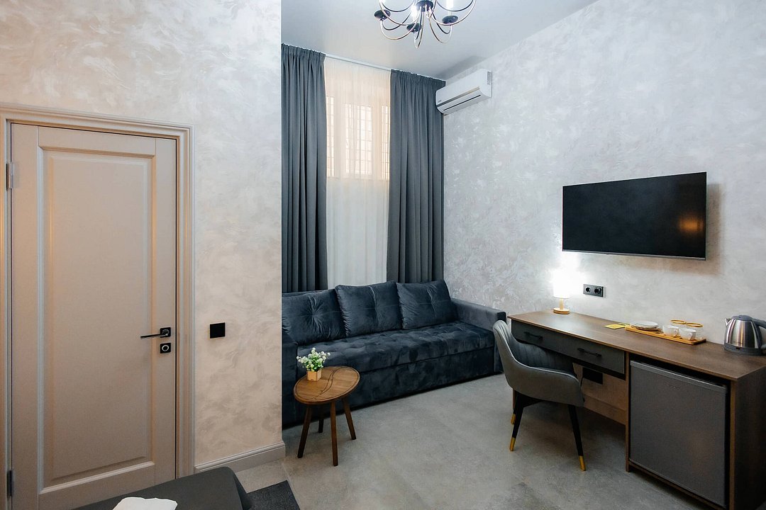 Номер оснащен всем необходимым для комфортного проживания: удобная мебель, современная техника, стильный интерьер. Большие окна пропускают много света, создавая атмосферу лёгкости и простора. Гости оценят качество постельного белья и полотенец, а также чистоту и порядок. Из окон открывается вид на древнейший город.