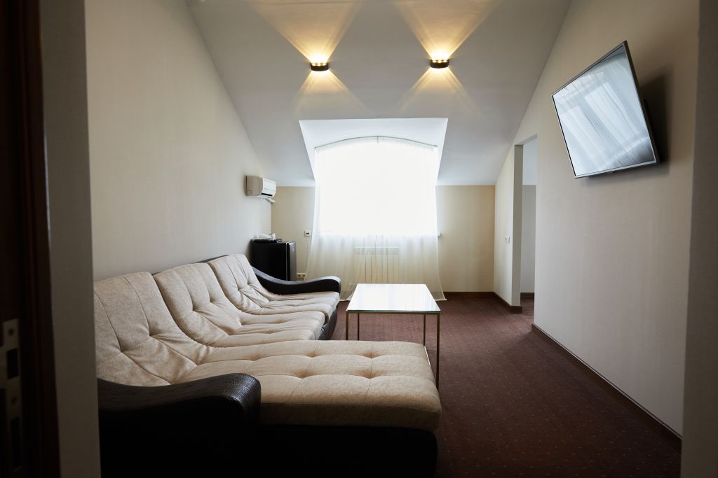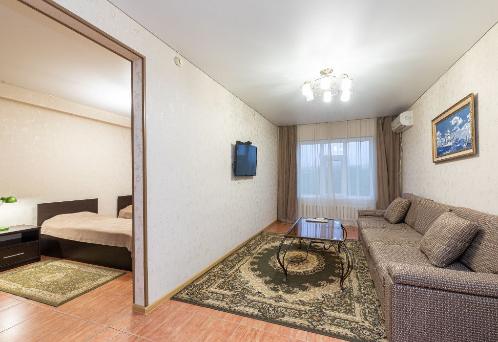 Очень уютный и просторный двухкомнатный номер с кроватью размера queen-size в спальне и диваном в гостиной. Также в этот номер можно поставить дополнительную кровать. Номер отлично подходит для размещения с семьей и долгосрочного проживания.
