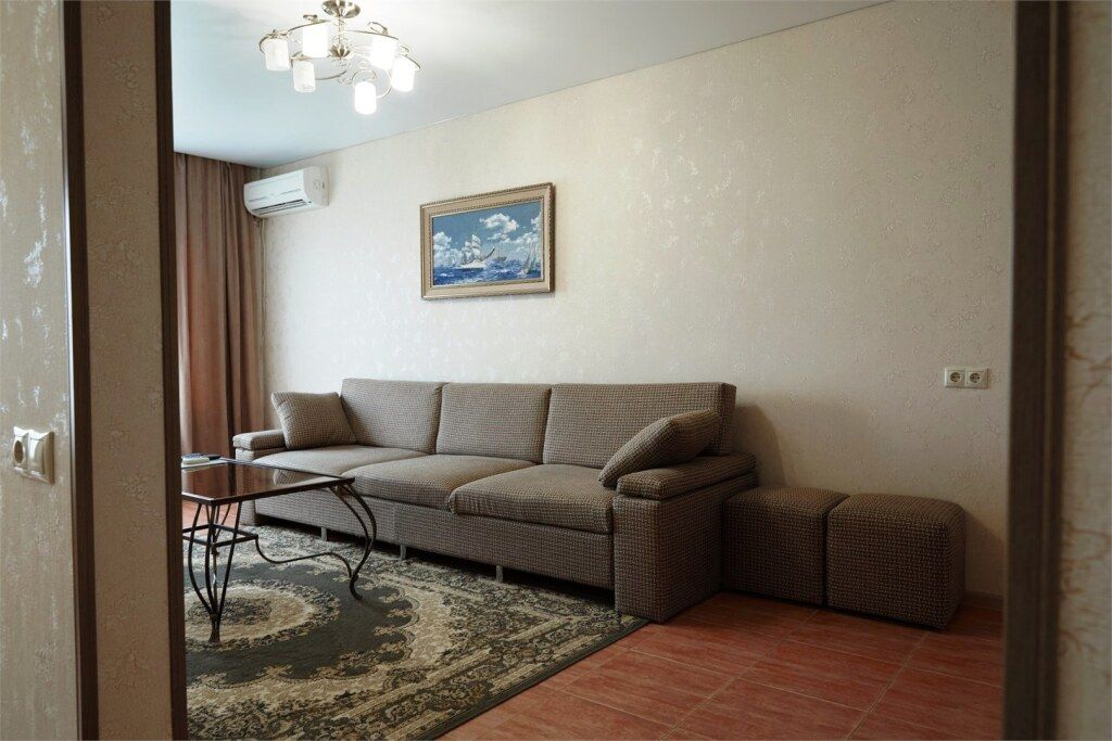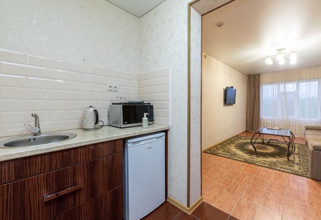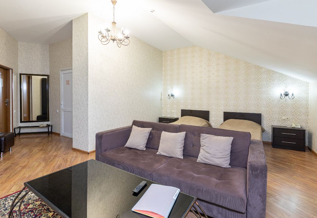 Просторный двухкомнатный номер с двумя раздельными кроватями и диваном. Также в этот номер можно поставить дополнительную кровать. Ванная комната оборудована ванной. Номер отлично подходит для размещения с семьей и долгосрочного проживания. Оборудован мини-кухней.