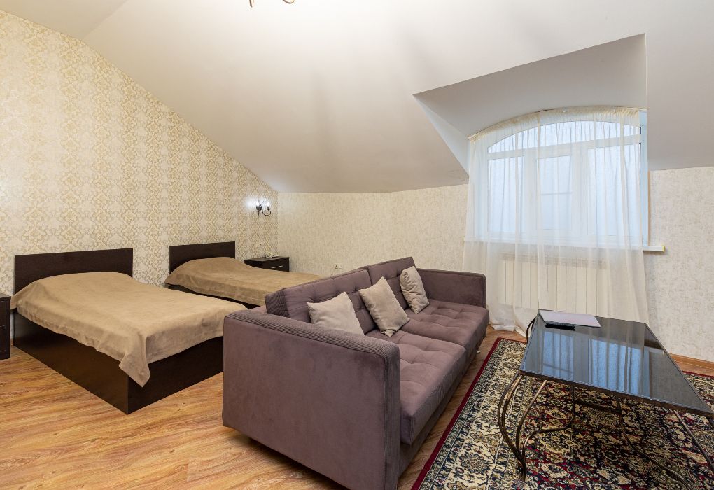 Просторный двухместный номер с двумя раздельными кроватями и диваном. Также в этот номер можно поставить дополнительную кровать. Ванная комната оборудована ванной. Номер отлично подходит для размещения с семьей.