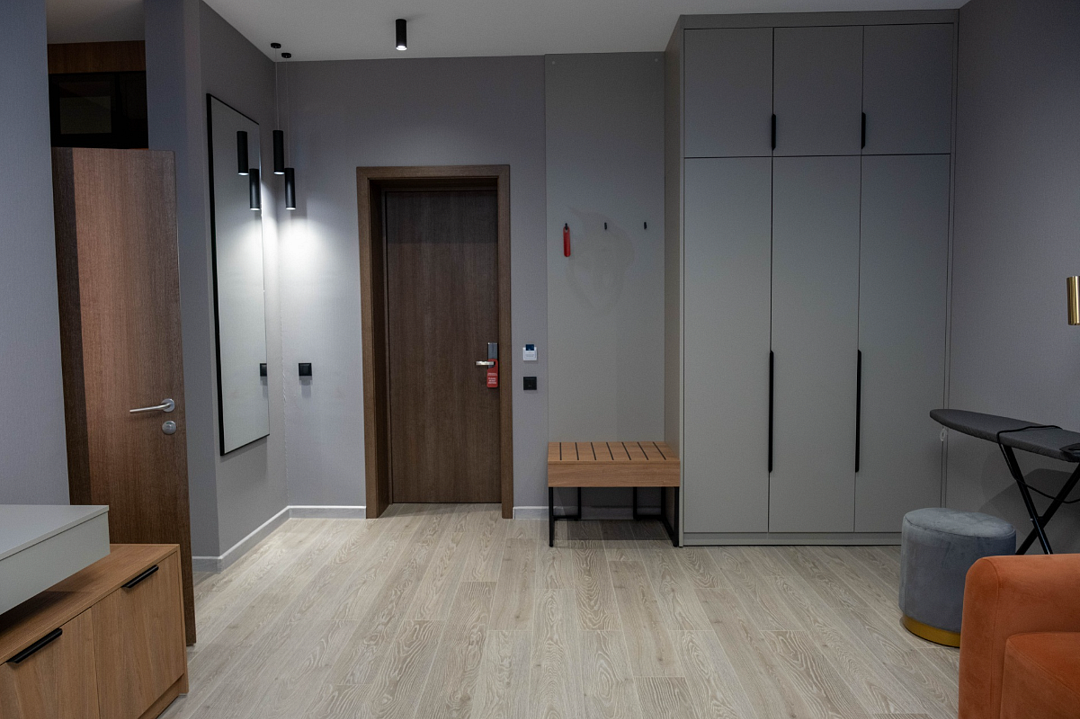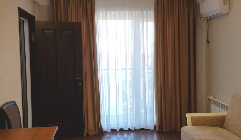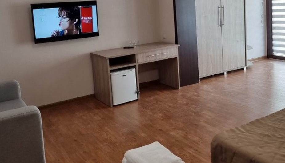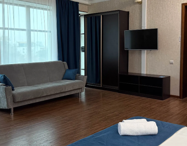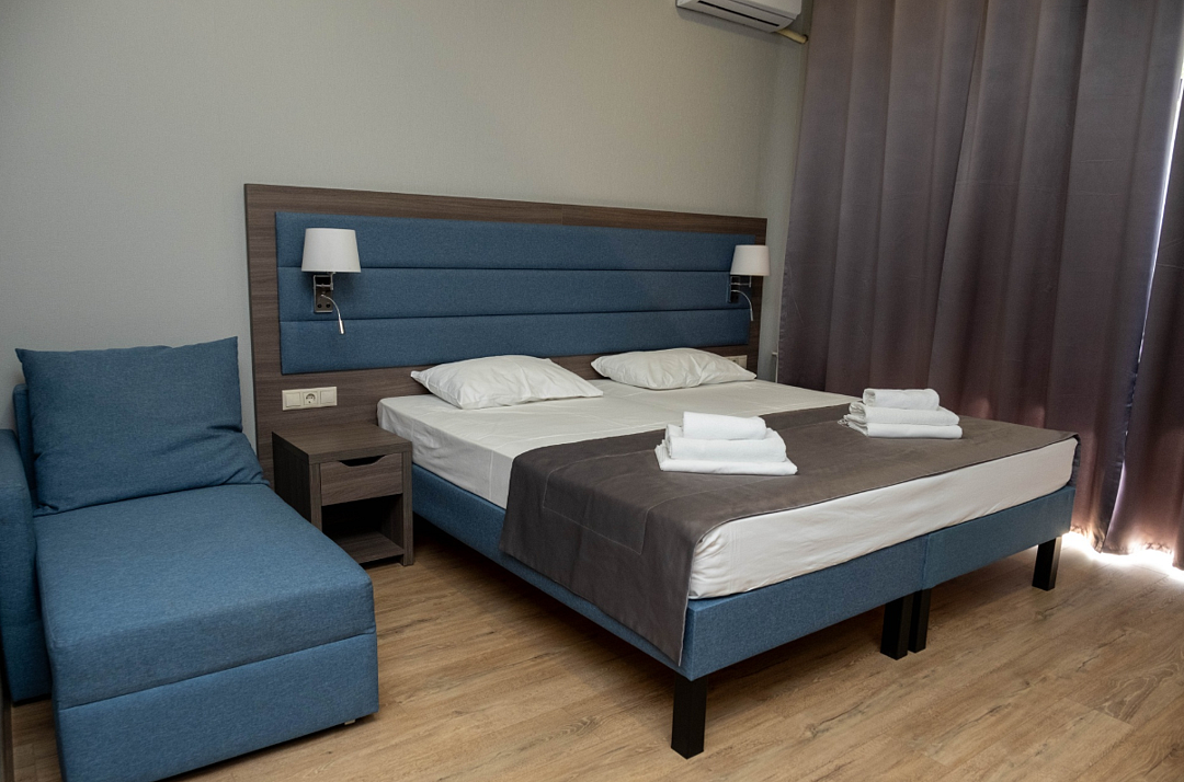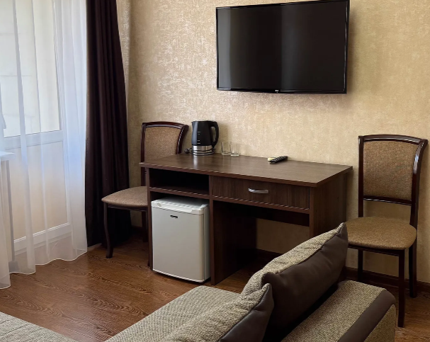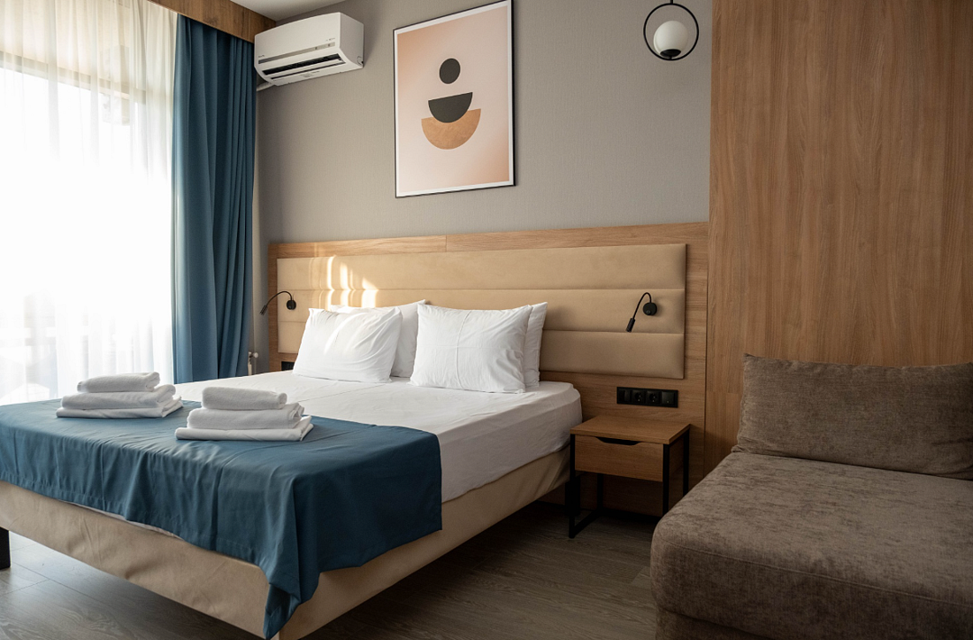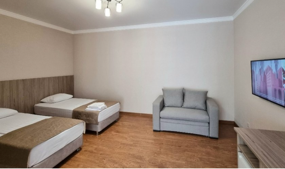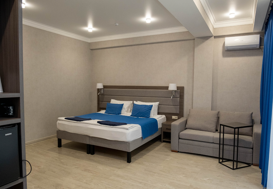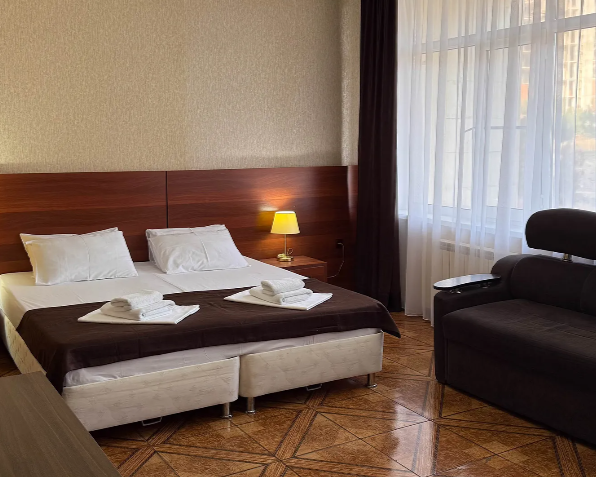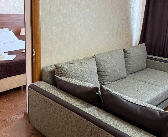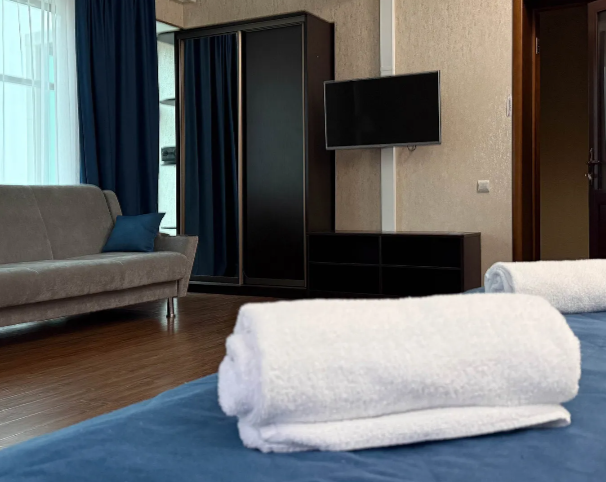 Однокомнатный номер подходит для размещения 2 гостей на основных местах и 1 гостя на доп. месте (диван).