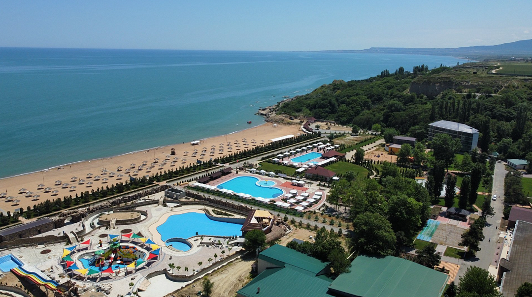 От пляжа 800 метров, корпуса построены на пригорке.