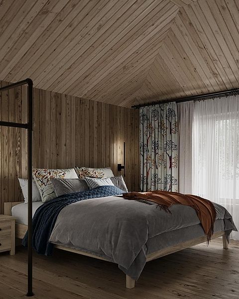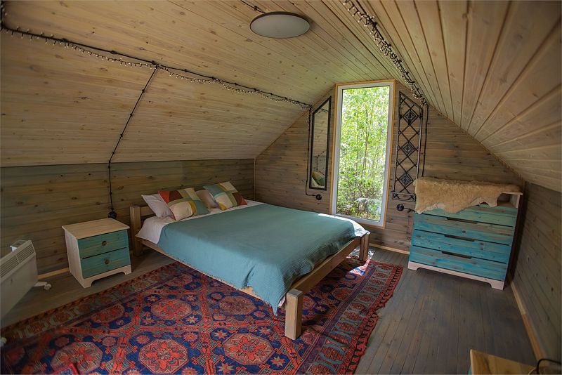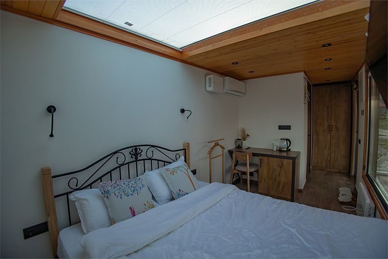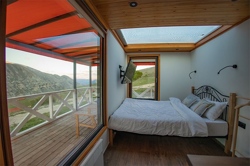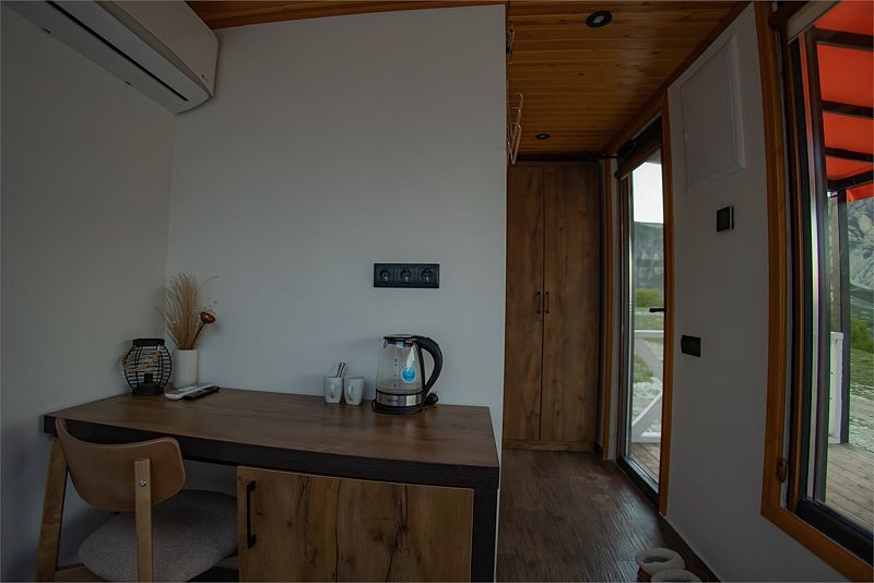 Уютный двухместный домик с видом на горы и лесистую местность. Оснащен двуспальной кроватью.