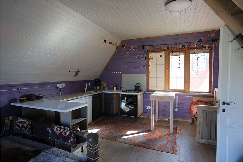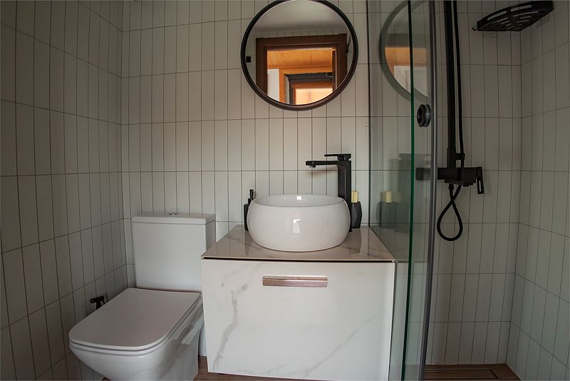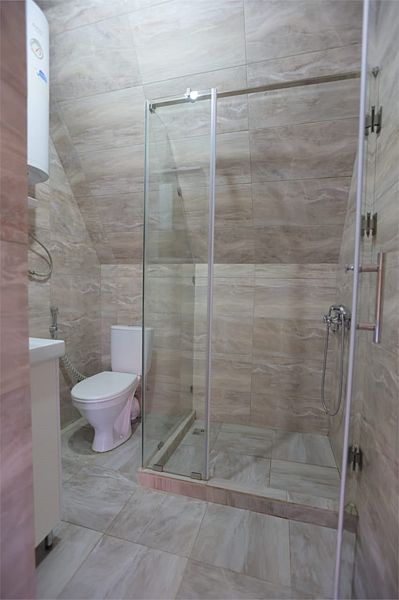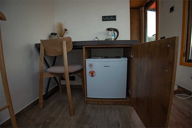 Душ и уборная в другом помещении, на то оно и глэмпинг. Хотя строятся новые домики сейчас, где сказали будут уже прямо в них удобства.
