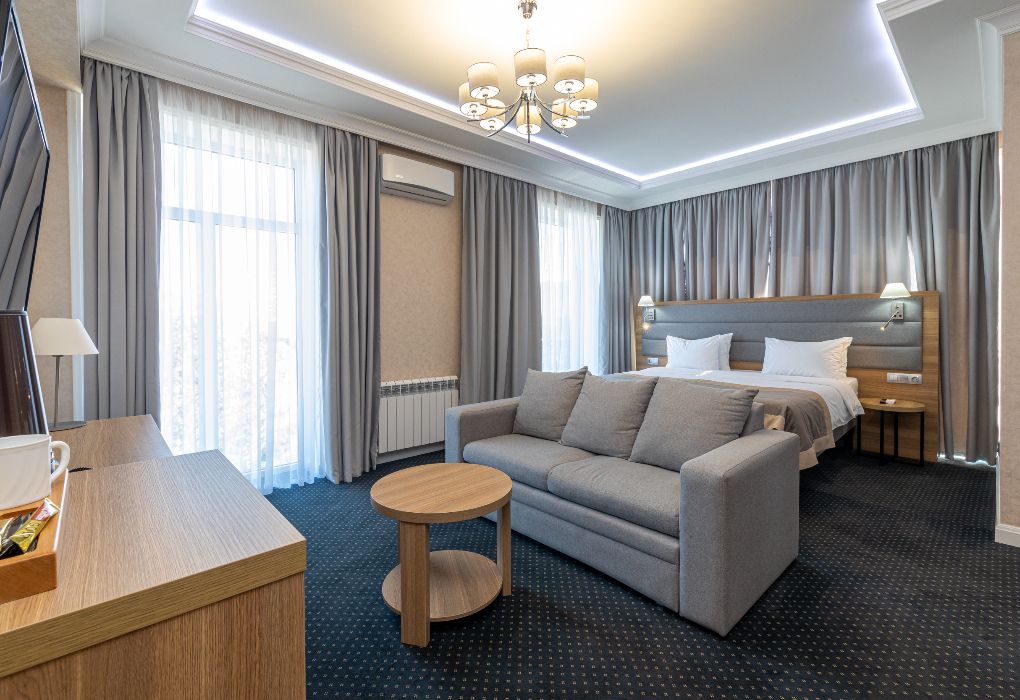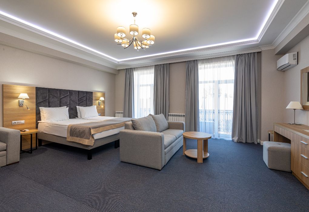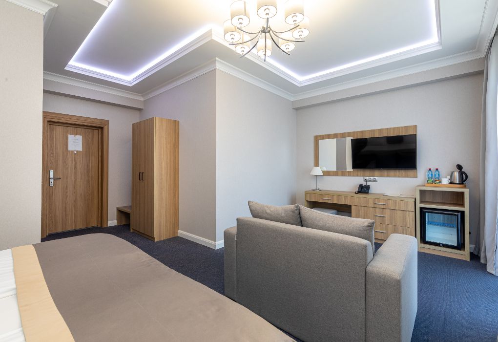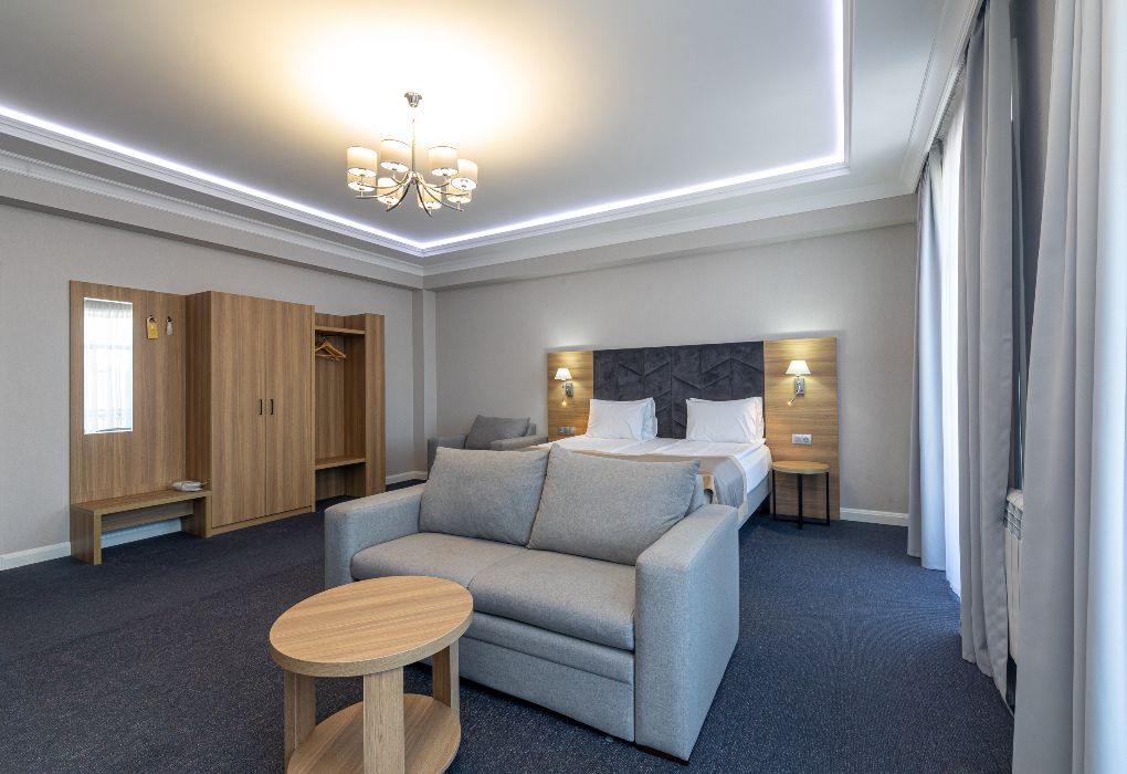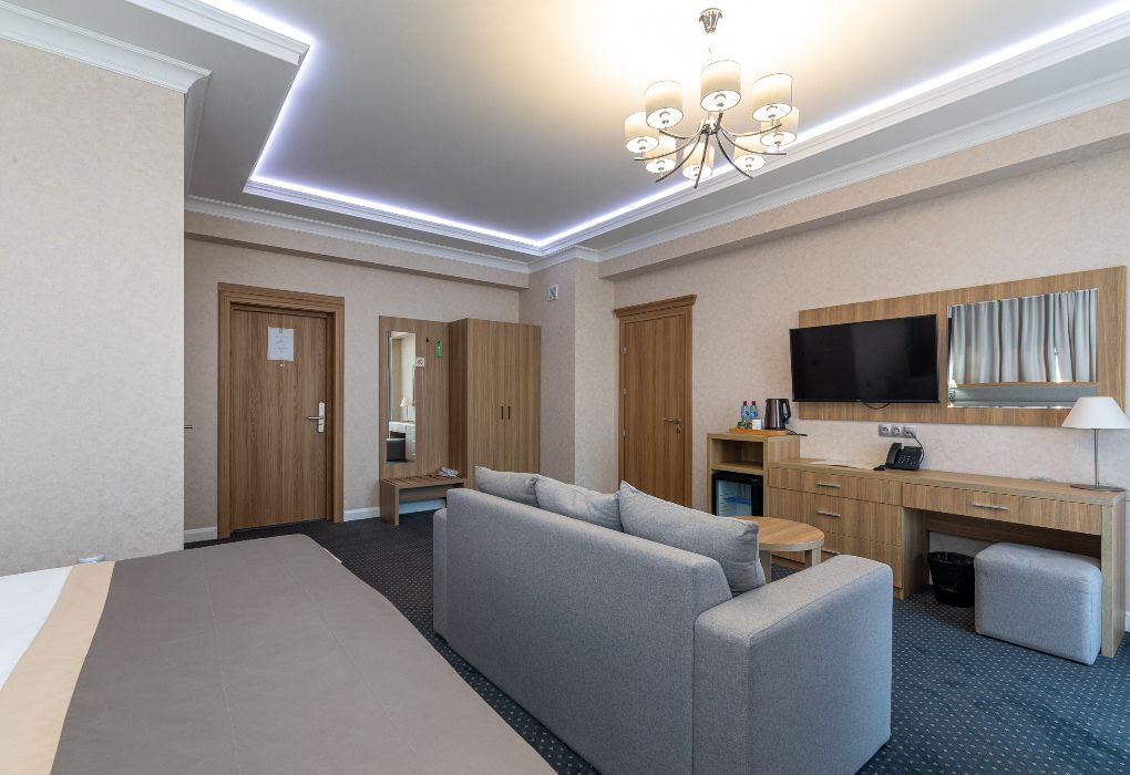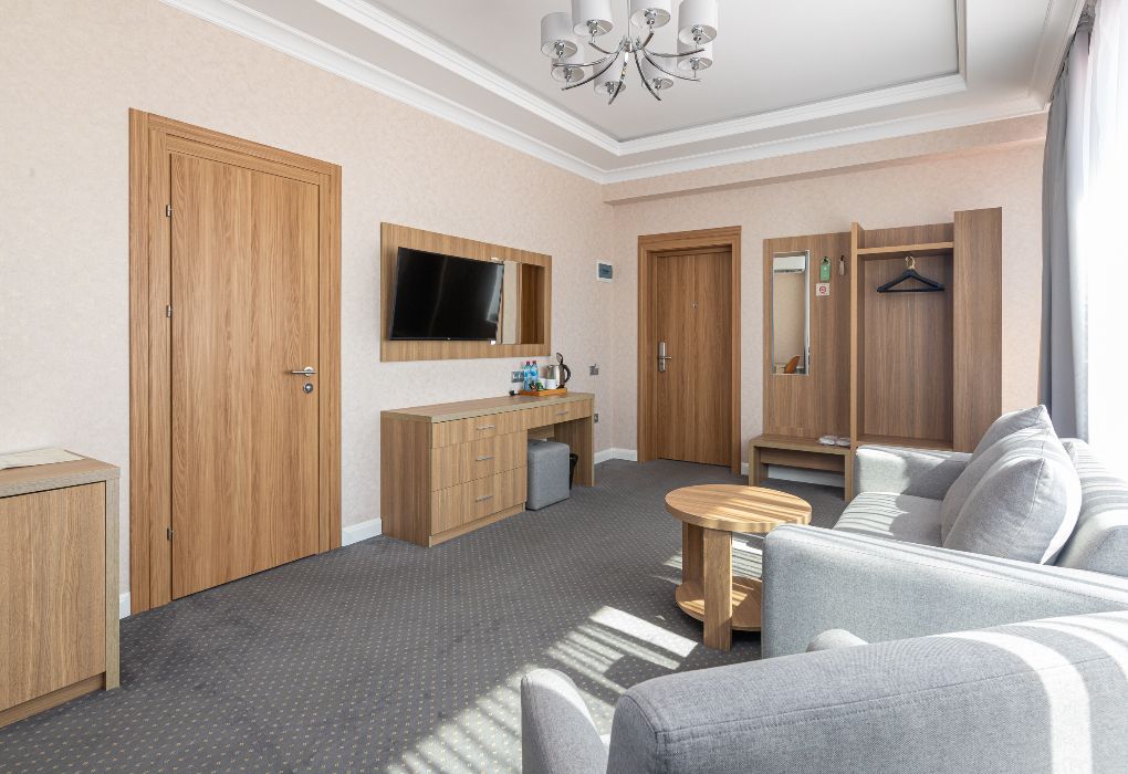 Просторный и элегантный номер площадью 34 м² — идеальный выбор для тех, кто ценит комфорт, стиль и атмосферу уединения. «Джуниор Сюит» сочетает современный дизайн, зонированное пространство и удобства премиум-класса, создавая идеальные условия как для отдыха, так и для работы. Интерьер выполнен в спокойных светлых тонах с мягким освещением и качественной мебелью, а панорамные окна наполняют комнату естественным светом. Наполнение номера: двуспальная кровать или две раздельные кровати с ортопедическими матрасами; раскладной диван или кресло-кровать — возможность дополнительного размещения; Smart TV; мини-холодильник; чай, кофе, чайные принадлежности и бутилированная вода; фен, сейф, телефон; халаты, полотенца, тапочки; теплый пол, душевая кабина или джакузи; ежедневная уборка. В стоимость проживания входит: завтрак по системе «Шведский стол»; посещение SPA-зоны; крытый бассейн 25×12 м; тренажёрный зал; парковка на территории отеля; детский центр “Дворец мечты”. Дополнительные услуги (за отдельную плату): ресторан на территории (обслуживание по меню); хаммам-зона с отдельным бассейном и зоной релакса; массажный кабинет; конференц-зал; трансфер; услуги прачечной; заказ экскурсий и туров. Отель Derbent Premium Hotel&SPA 4★ расположен в уникальной локации — между Каспийским морем и горами, всего в 5 минутах от набережной. Это пространство, где комфорт и эстетика создают идеальные условия для отдыха, вдохновения и восстановления. Забронируйте номер “Джуниор Сюит” уже сегодня — окунитесь в атмосферу уюта, пространства и безупречного сервиса уровня 4★!Услуги и удобства