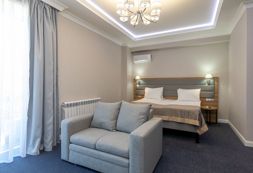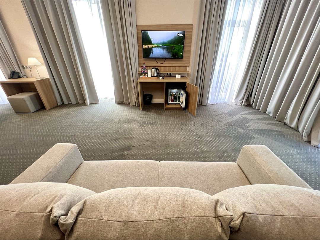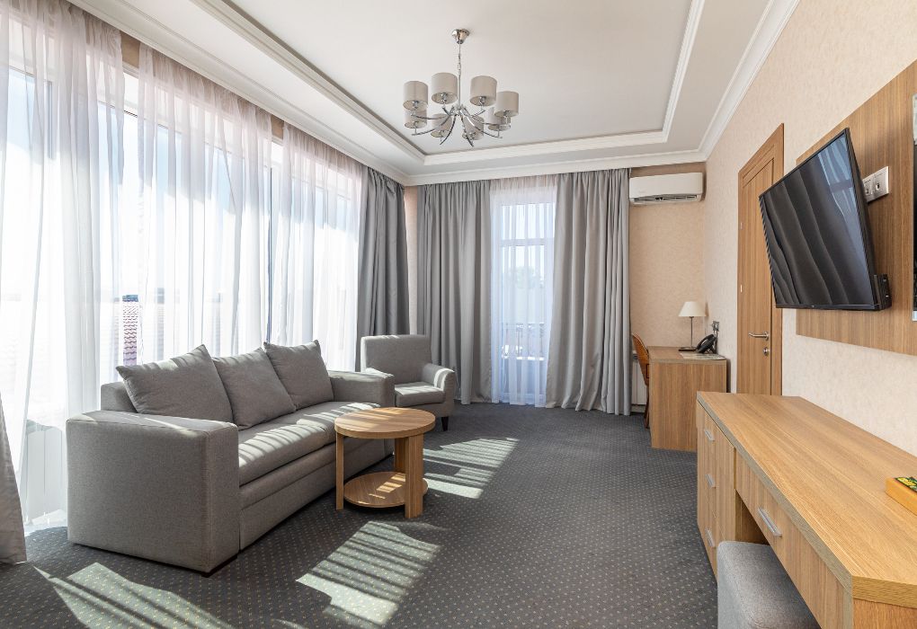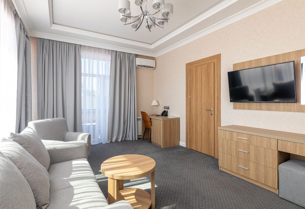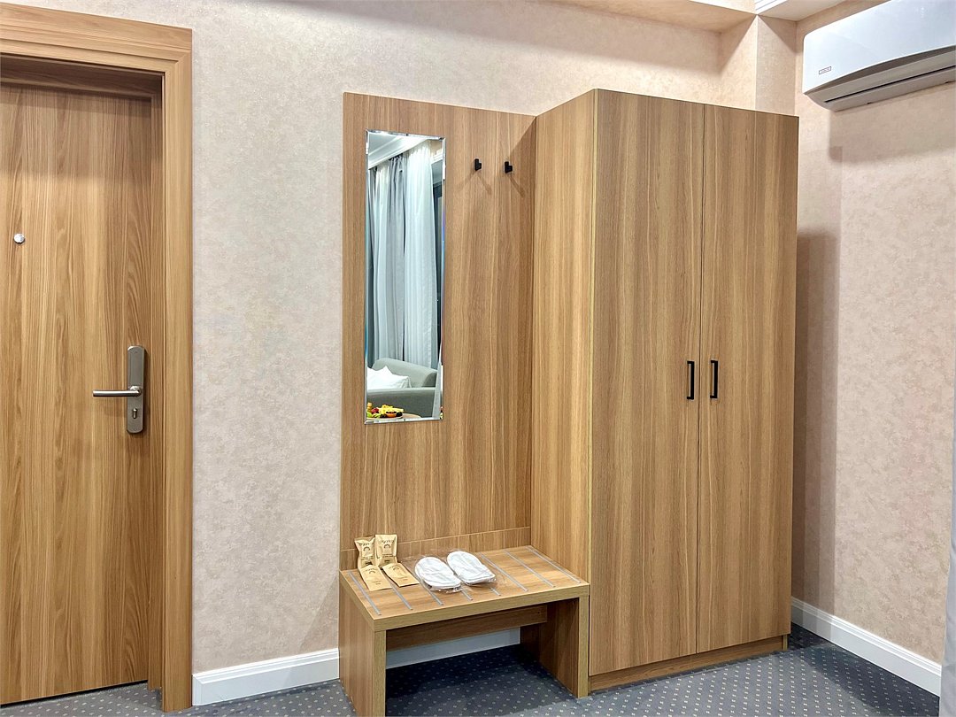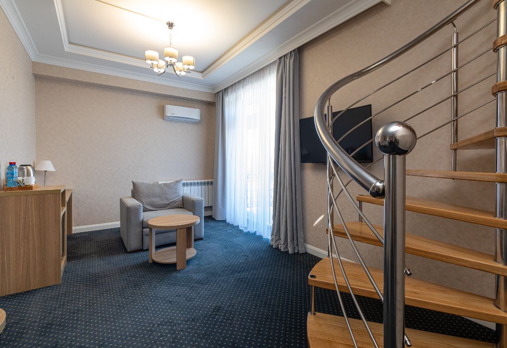 Просторный и элегантный номер площадью 34 м² — идеальный выбор для тех, кто ценит комфорт, стиль и атмосферу уединения. «Джуниор Сюит» сочетает современный дизайн, зонированное пространство и удобства премиум-класса, создавая идеальные условия как для отдыха, так и для работы. Интерьер выполнен в спокойных светлых тонах с мягким освещением и качественной мебелью, а панорамные окна наполняют комнату естественным светом. Наполнение номера: двуспальная кровать или две раздельные кровати с ортопедическими матрасами; раскладной диван или кресло-кровать — возможность дополнительного размещения; Smart TV; мини-холодильник; чай, кофе, чайные принадлежности и бутилированная вода; фен, сейф, телефон; халаты, полотенца, тапочки; теплый пол, душевая кабина или джакузи; ежедневная уборка. В стоимость проживания входит: завтрак по системе «Шведский стол»; посещение SPA-зоны; крытый бассейн 25×12 м; тренажёрный зал; парковка на территории отеля; детский центр “Дворец мечты”. Дополнительные услуги (за отдельную плату): ресторан на территории (обслуживание по меню); хаммам-зона с отдельным бассейном и зоной релакса; массажный кабинет; конференц-зал; трансфер; услуги прачечной; заказ экскурсий и туров. Отель Derbent Premium Hotel&SPA 4★ расположен в уникальной локации — между Каспийским морем и горами, всего в 5 минутах от набережной. Это пространство, где комфорт и эстетика создают идеальные условия для отдыха, вдохновения и восстановления. Забронируйте номер “Джуниор Сюит” уже сегодня — окунитесь в атмосферу уюта, пространства и безупречного сервиса уровня 4★!Услуги и удобства