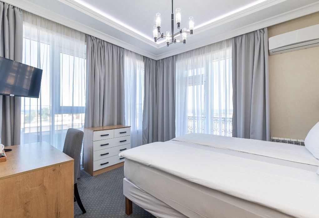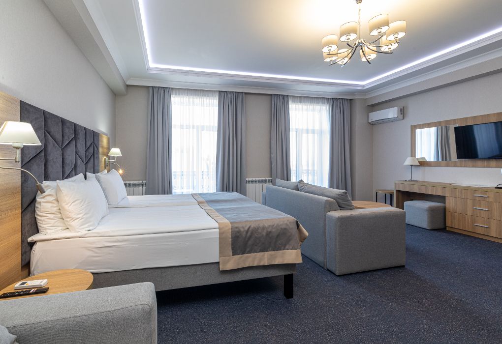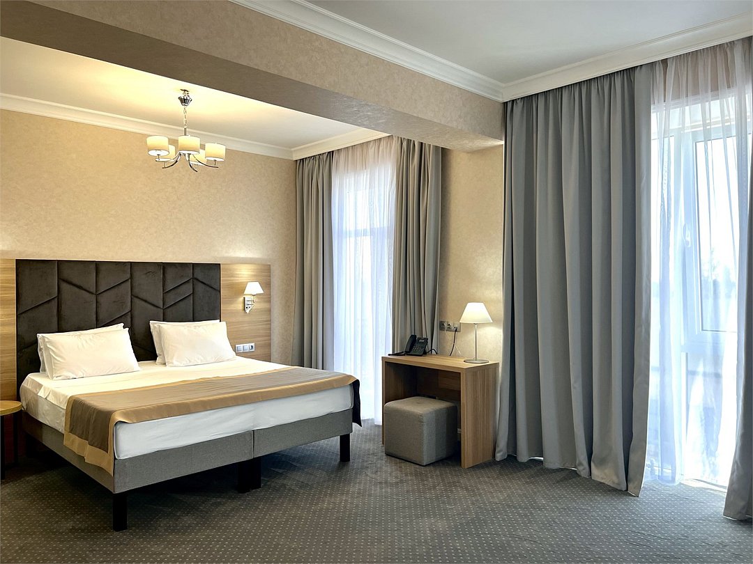 Люкс Просторный и изысканный номер площадью 38 м², созданный для гостей, ценящих комфорт, стиль и атмосферу премиального отдыха. Категория «Люкс» сочетает элегантный дизайн, функциональность и продуманные детали, обеспечивая безупречный комфорт проживания в отеле уровня 4★ Derbent Premium Hotel&SPA. Интерьер выполнен в современном стиле с мягкой цветовой палитрой и зоной отдыха, где приятно провести вечер после насыщенного дня. Благодаря панорамным окнам и гармоничной обстановке, в номере царит атмосфера уюта и спокойствия. Наполнение номера: двуспальная кровать или две раздельные кровати с ортопедическими матрасами; раскладной диван или кресло-кровать — возможность дополнительного размещения; Smart TV; мини-холодильник; чай, кофе, чайные принадлежности и бутилированная вода; фен, сейф, телефон; халаты, полотенца, тапочки; теплый пол, душевая кабина; ежедневная уборка. В стоимость проживания входит: завтрак по системе «Шведский стол»; посещение SPA-зоны; крытый бассейн 25×12 м; тренажёрный зал; парковка на территории отеля; детский центр “Дворец мечты”. Дополнительные услуги (за отдельную плату): ресторан на территории (обслуживание по меню); хаммам-зона с отдельным бассейном и зоной релакса; массажный кабинет; конференц-зал; трансфер; услуги прачечной; заказ экскурсий и туров. Отель Derbent Premium Hotel&SPA 4★ расположен в живописной части города — между морем и горами, всего в 5 минутах от набережной Дербента. Это место, где комфорт, спокойствие и внимание к деталям создают идеальные условия для отдыха и вдохновения. Забронируйте номер “Люкс” уже сегодня — насладитесь пространством, уединением и сервисом уровня 4★ у побережья Каспийского моря!Услуги и удобства