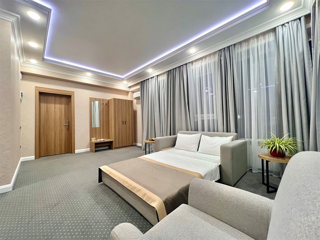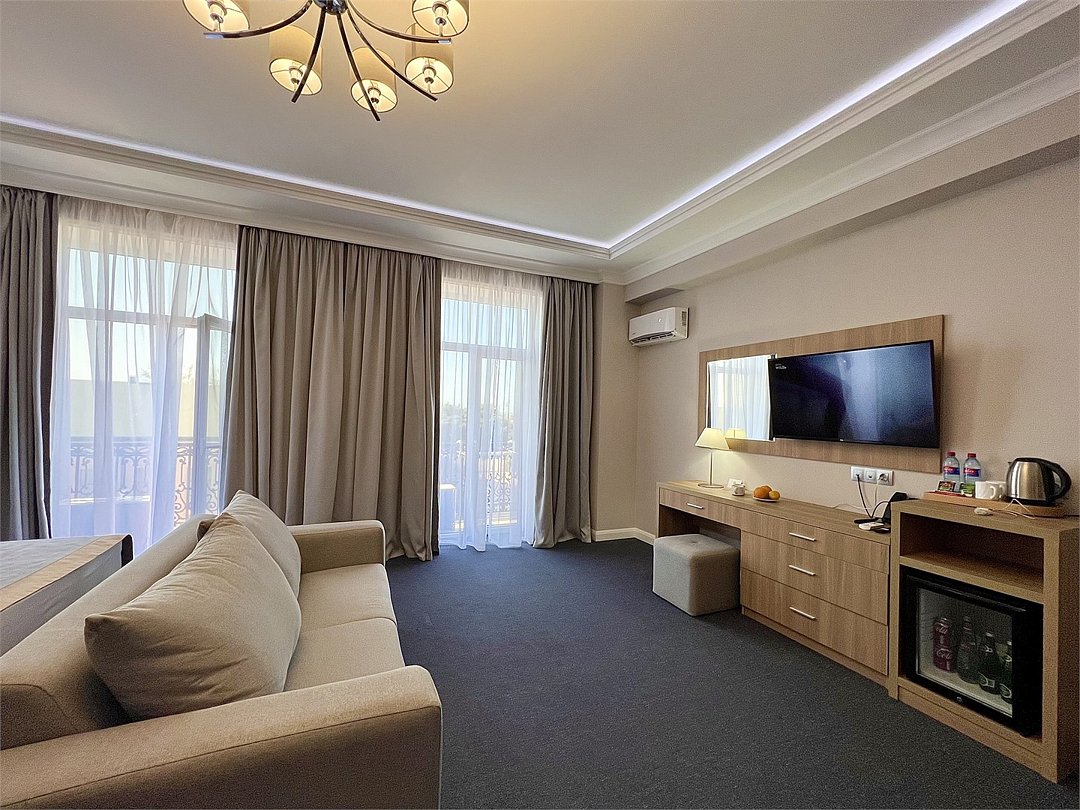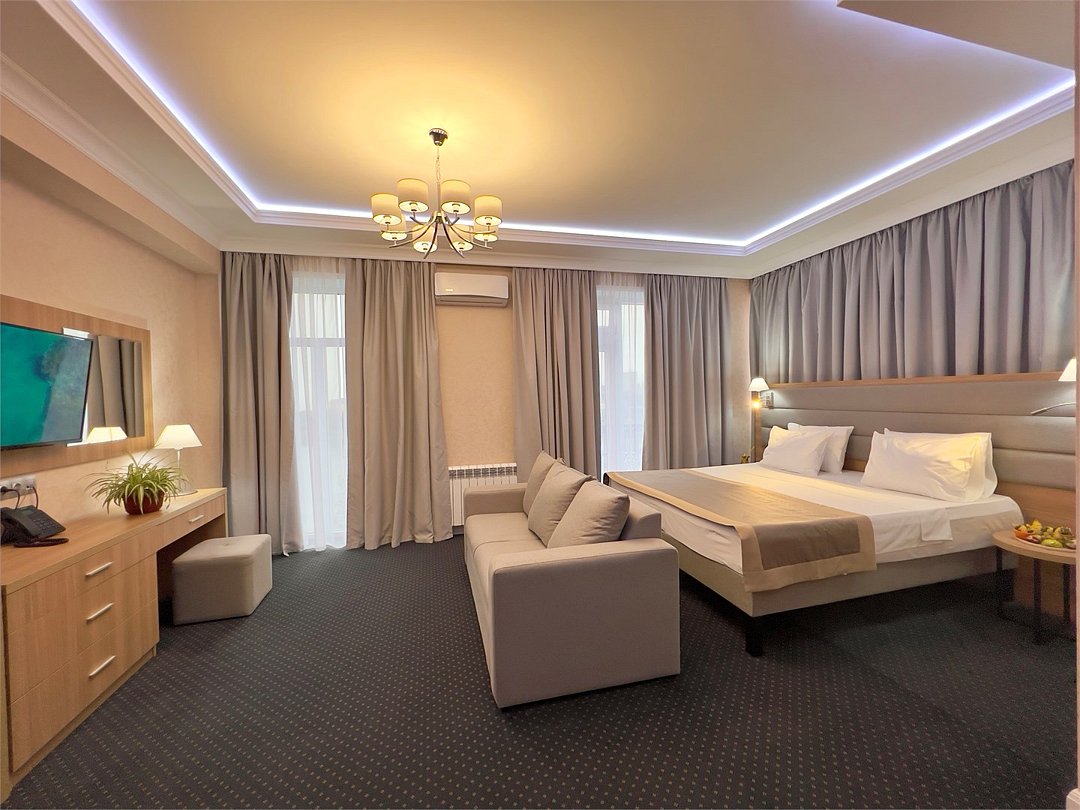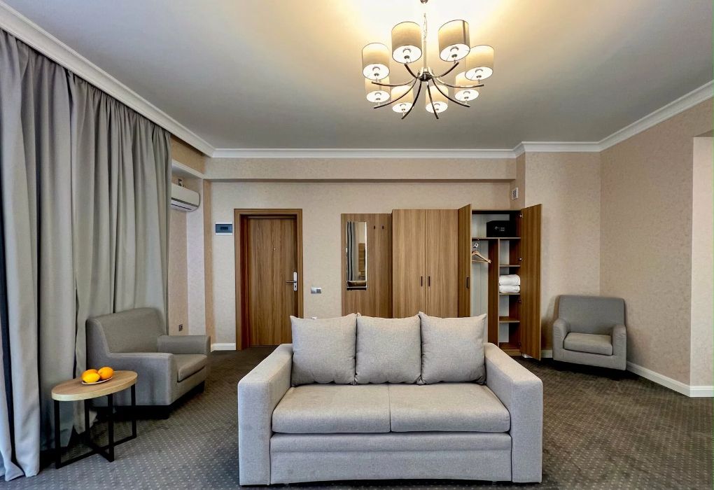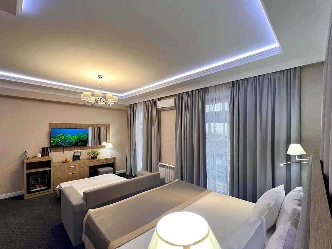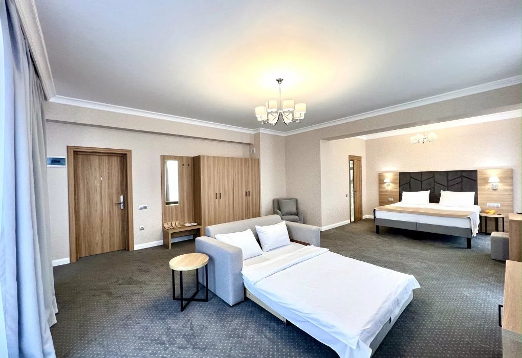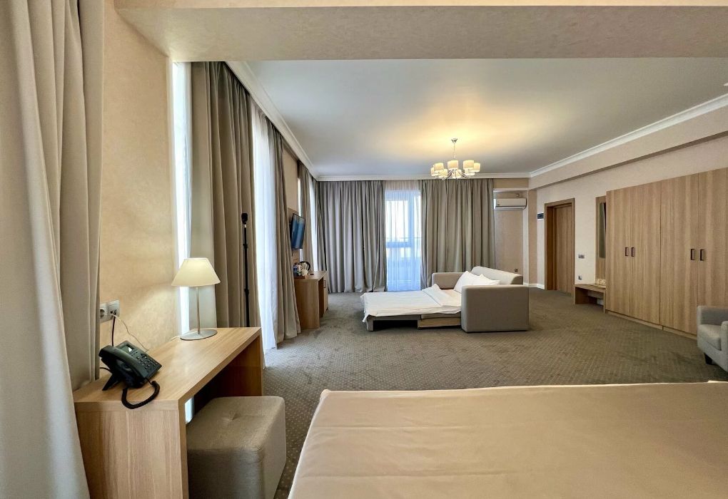 Джуниор Сюит Плюс Роскошный номер площадью 48 м², созданный для гостей, которые ценят пространство, элегантность и атмосферу полного отдыха. Категория «Джуниор Сюит Плюс» сочетает современный дизайн, изысканные детали и высокий уровень комфорта, соответствующий стандартам 4★ отеля Derbent Premium Hotel&SPA. Интерьер выполнен в светлых благородных тонах с зоной отдыха и панорамными окнами, наполняющими комнату естественным светом. Номер идеально подойдёт для семейного отдыха, романтического путешествия или длительного проживания. Наполнение номера: двуспальная кровать или две раздельные кровати с ортопедическими матрасами; раскладной диван и кресло-кровать — возможность комфортного размещения до 3–4 гостей; Smart TV; мини-холодильник; чай, кофе, чайные принадлежности и бутилированная вода; фен, сейф, телефон; халаты, полотенца, тапочки; теплый пол, душевая кабина; ежедневная уборка. В стоимость проживания входит: завтрак по системе «Шведский стол»; посещение SPA-зоны; крытый бассейн 25×12 м; тренажёрный зал; парковка на территории отеля; детский центр “Дворец мечты”. Дополнительные услуги (за отдельную плату): ресторан на территории (обслуживание по меню); хаммам-зона с отдельным бассейном и зоной релакса; массажный кабинет; конференц-зал; трансфер; услуги прачечной; заказ экскурсий и туров. Отель Derbent Premium Hotel&SPA 4★ расположен в живописной зоне — между Каспийским морем и горами, всего в 5 минутах от набережной Дербента. Это идеальное место для тех, кто ищет гармонию, простор и отдых в атмосфере настоящего премиального комфорта. ✨ Забронируйте номер “Джуниор Сюит Плюс” уже сегодня — насладитесь пространством, тишиной и сервисом уровня 4★ у самого моря!Услуги и удобства