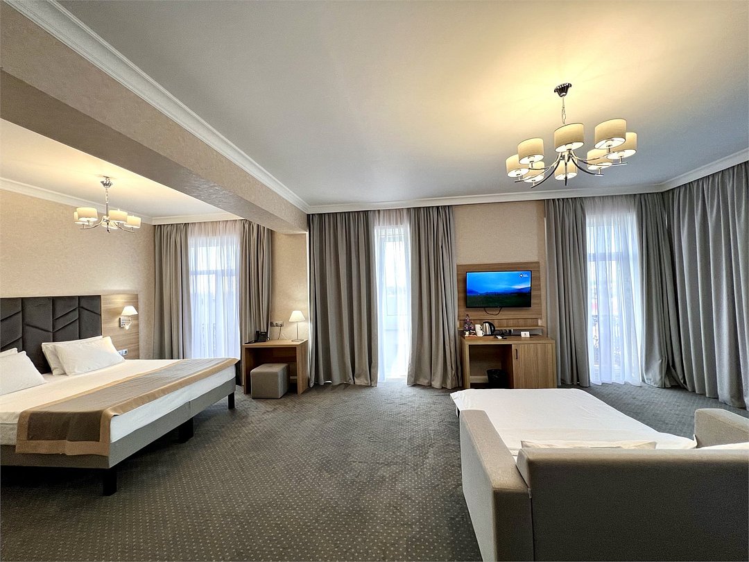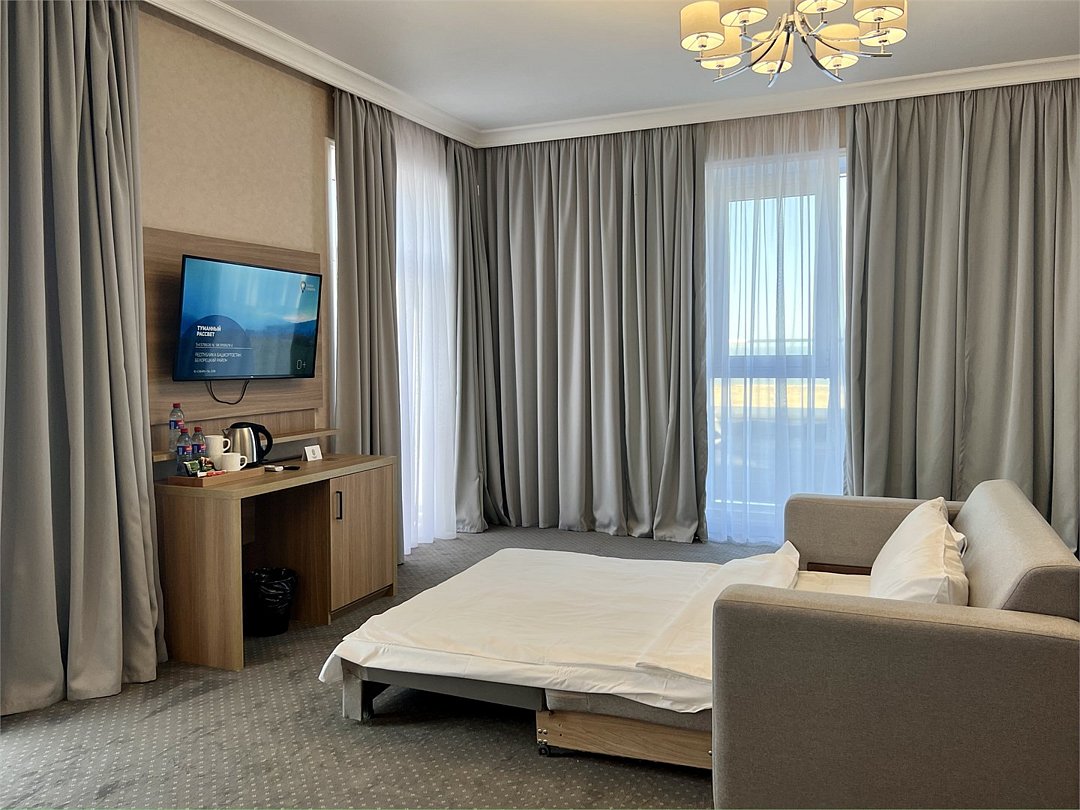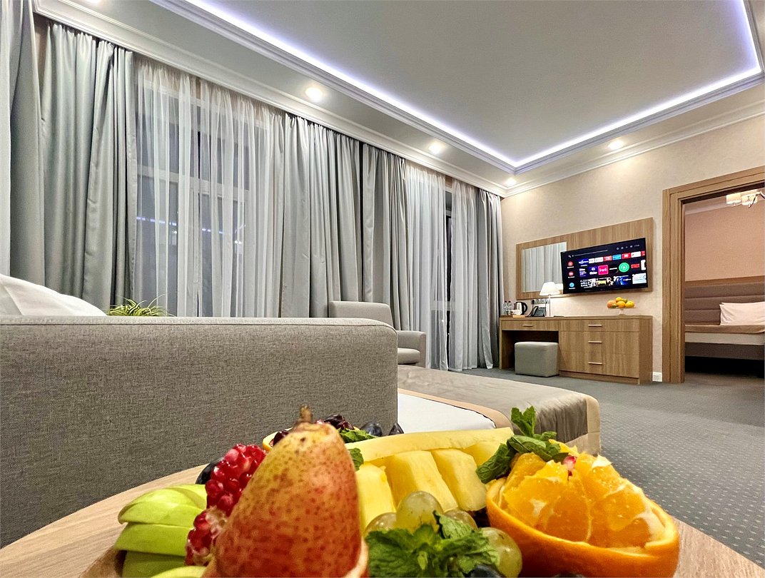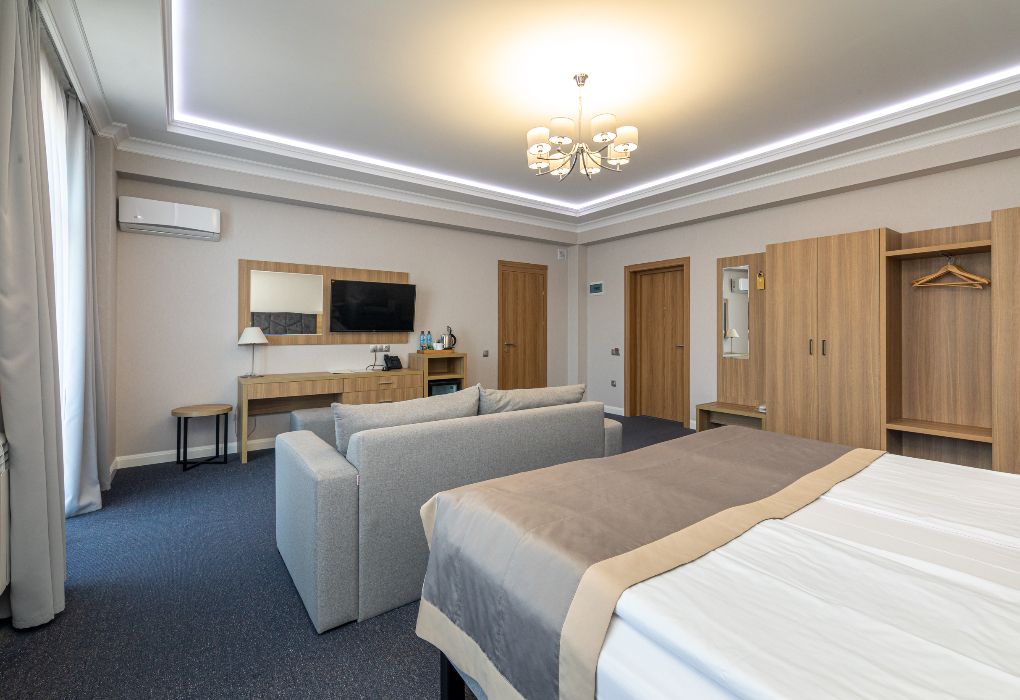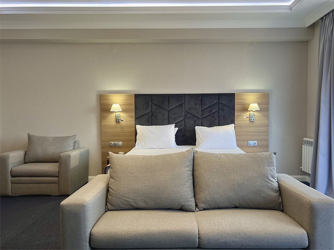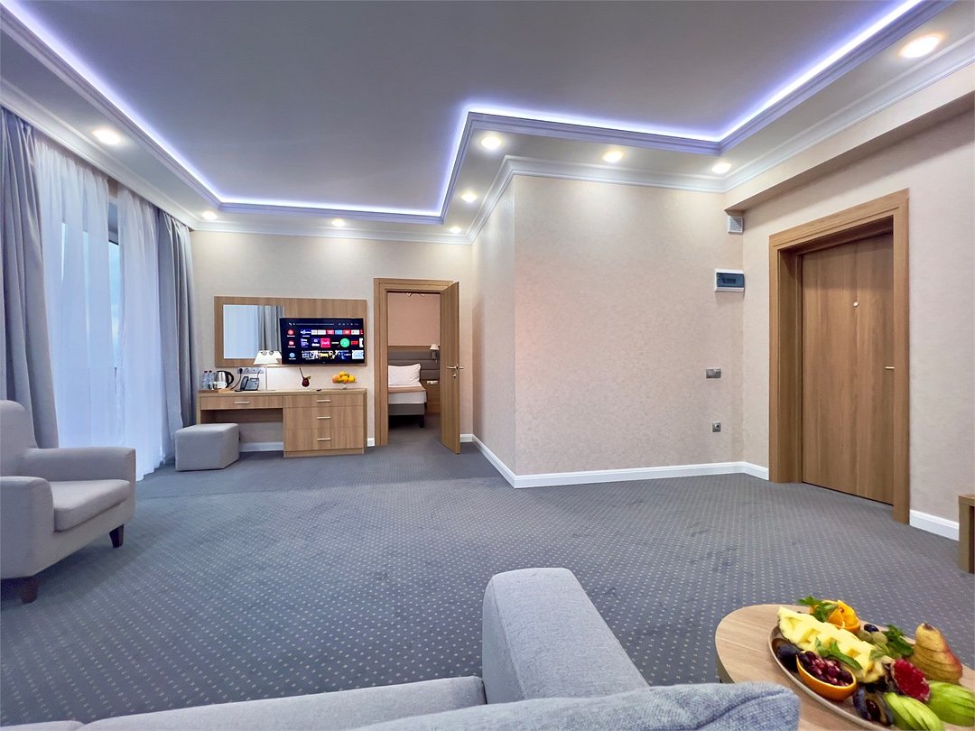 Джуниор Сюит Плюс Роскошный номер площадью 48 м², созданный для гостей, которые ценят пространство, элегантность и атмосферу полного отдыха. Категория «Джуниор Сюит Плюс» сочетает современный дизайн, изысканные детали и высокий уровень комфорта, соответствующий стандартам 4★ отеля Derbent Premium Hotel&SPA. Интерьер выполнен в светлых благородных тонах с зоной отдыха и панорамными окнами, наполняющими комнату естественным светом. Номер идеально подойдёт для семейного отдыха, романтического путешествия или длительного проживания. Наполнение номера: двуспальная кровать или две раздельные кровати с ортопедическими матрасами; раскладной диван и кресло-кровать — возможность комфортного размещения до 3–4 гостей; Smart TV; мини-холодильник; чай, кофе, чайные принадлежности и бутилированная вода; фен, сейф, телефон; халаты, полотенца, тапочки; теплый пол, душевая кабина; ежедневная уборка. В стоимость проживания входит: завтрак по системе «Шведский стол»; посещение SPA-зоны; крытый бассейн 25×12 м; тренажёрный зал; парковка на территории отеля; детский центр “Дворец мечты”. Дополнительные услуги (за отдельную плату): ресторан на территории (обслуживание по меню); хаммам-зона с отдельным бассейном и зоной релакса; массажный кабинет; конференц-зал; трансфер; услуги прачечной; заказ экскурсий и туров. Отель Derbent Premium Hotel&SPA 4★ расположен в живописной зоне — между Каспийским морем и горами, всего в 5 минутах от набережной Дербента. Это идеальное место для тех, кто ищет гармонию, простор и отдых в атмосфере настоящего премиального комфорта. ✨ Забронируйте номер “Джуниор Сюит Плюс” уже сегодня — насладитесь пространством, тишиной и сервисом уровня 4★ у самого моря!Услуги и удобства
