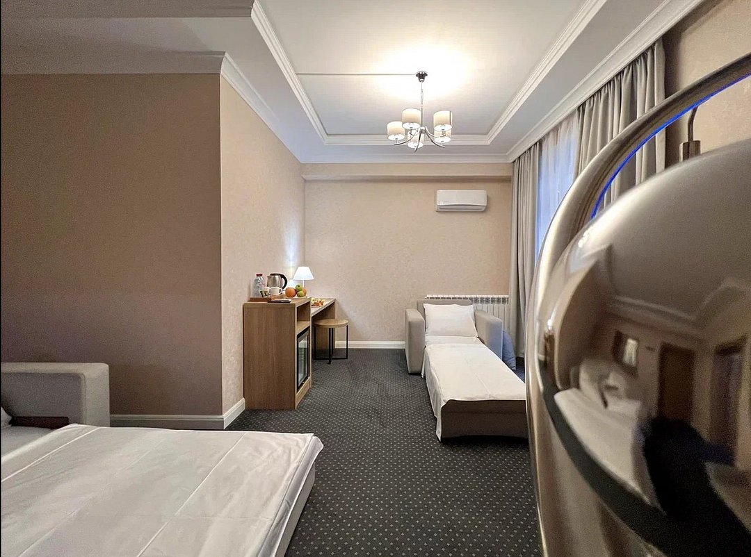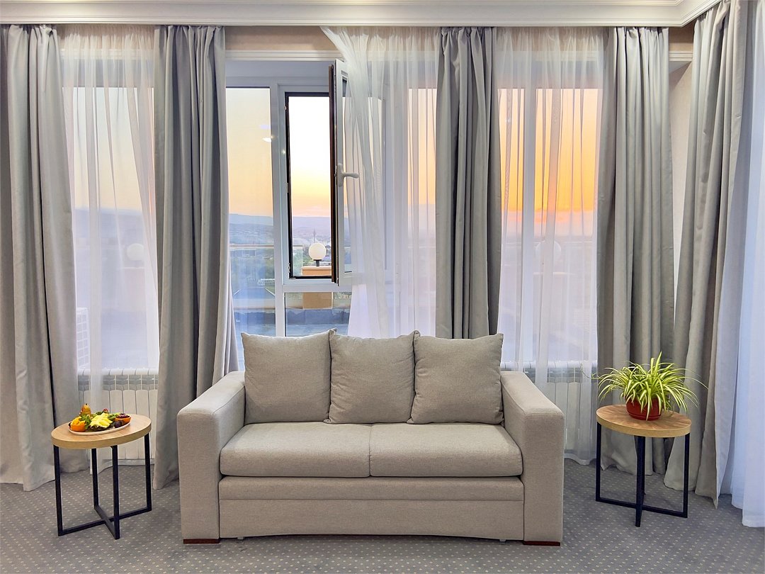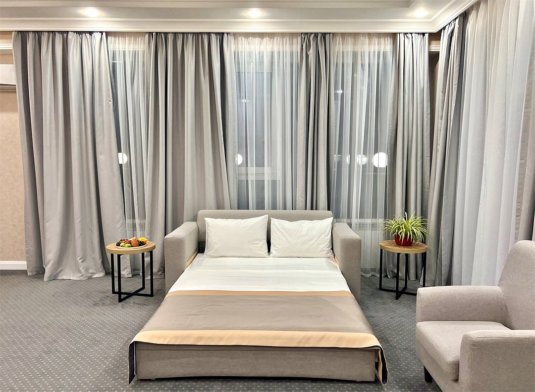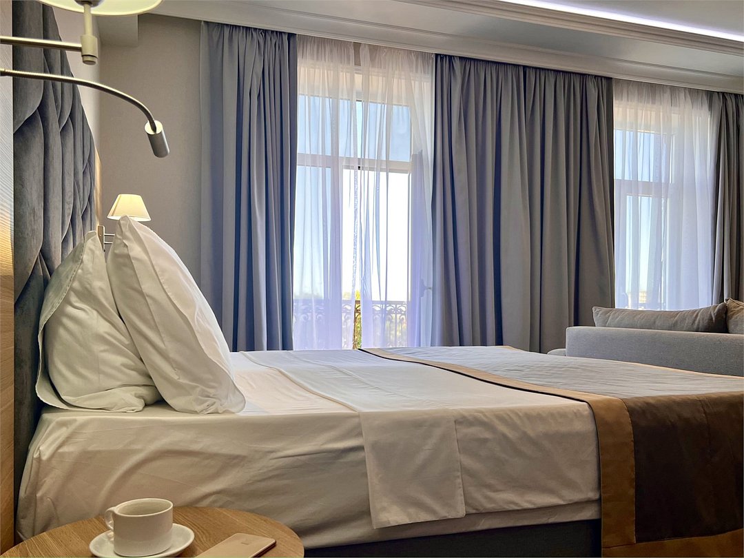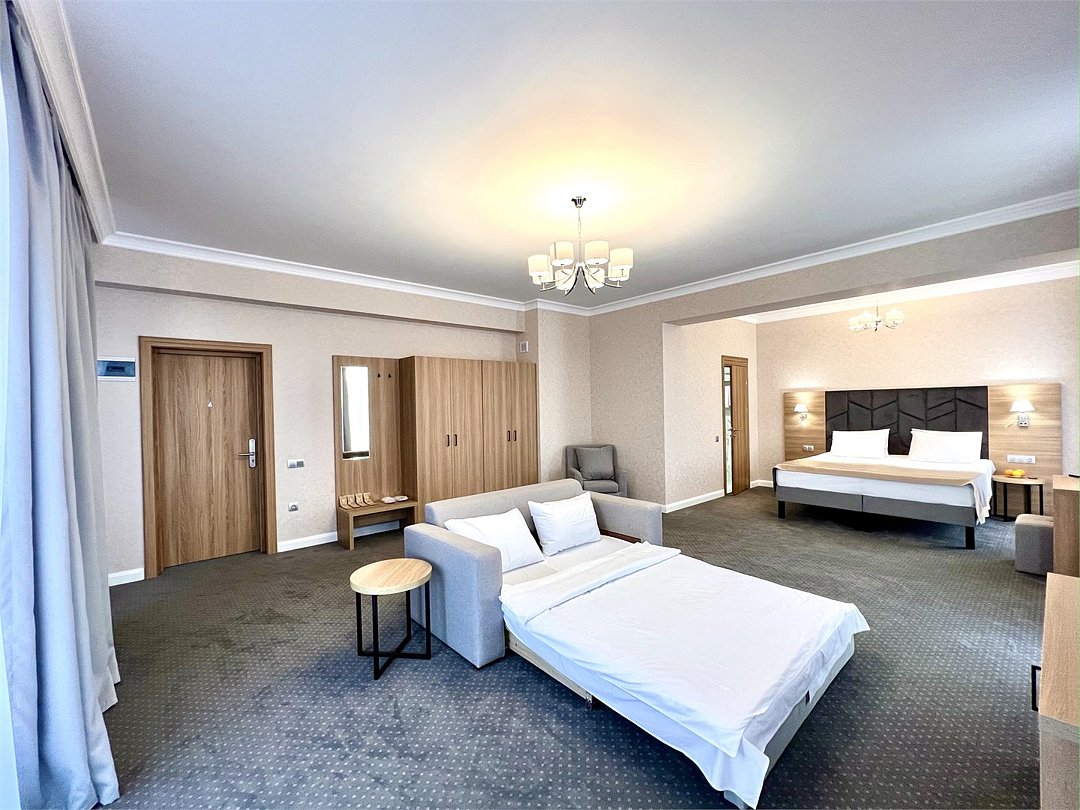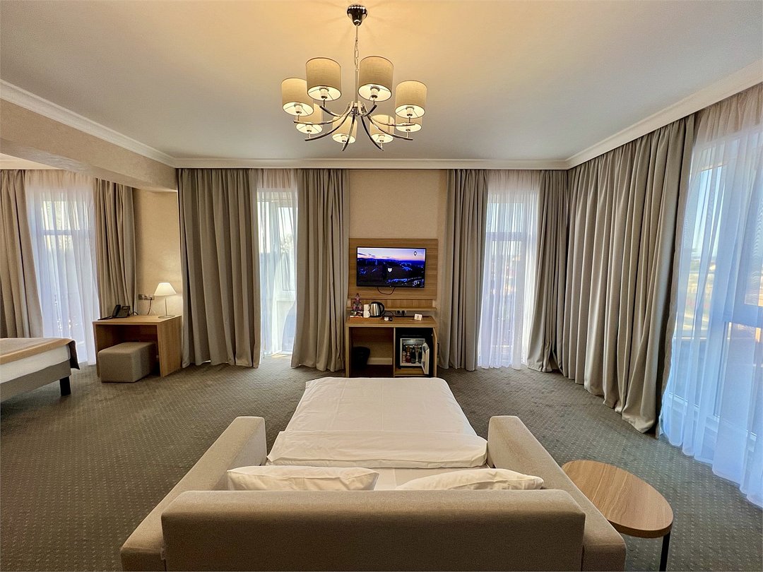 Джуниор Сюит Плюс Роскошный номер площадью 48 м², созданный для гостей, которые ценят пространство, элегантность и атмосферу полного отдыха. Категория «Джуниор Сюит Плюс» сочетает современный дизайн, изысканные детали и высокий уровень комфорта, соответствующий стандартам 4★ отеля Derbent Premium Hotel&SPA. Интерьер выполнен в светлых благородных тонах с зоной отдыха и панорамными окнами, наполняющими комнату естественным светом. Номер идеально подойдёт для семейного отдыха, романтического путешествия или длительного проживания. Наполнение номера: двуспальная кровать или две раздельные кровати с ортопедическими матрасами; раскладной диван и кресло-кровать — возможность комфортного размещения до 3–4 гостей; Smart TV; мини-холодильник; чай, кофе, чайные принадлежности и бутилированная вода; фен, сейф, телефон; халаты, полотенца, тапочки; теплый пол, душевая кабина; ежедневная уборка. В стоимость проживания входит: завтрак по системе «Шведский стол»; посещение SPA-зоны; крытый бассейн 25×12 м; тренажёрный зал; парковка на территории отеля; детский центр “Дворец мечты”. Дополнительные услуги (за отдельную плату): ресторан на территории (обслуживание по меню); хаммам-зона с отдельным бассейном и зоной релакса; массажный кабинет; конференц-зал; трансфер; услуги прачечной; заказ экскурсий и туров. Отель Derbent Premium Hotel&SPA 4★ расположен в живописной зоне — между Каспийским морем и горами, всего в 5 минутах от набережной Дербента. Это идеальное место для тех, кто ищет гармонию, простор и отдых в атмосфере настоящего премиального комфорта. ✨ Забронируйте номер “Джуниор Сюит Плюс” уже сегодня — насладитесь пространством, тишиной и сервисом уровня 4★ у самого моря!Услуги и удобства