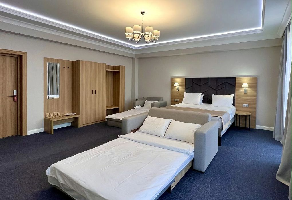 Люкс Премиум Роскошный двухкомнатный номер площадью 71 м², созданный для ценителей простора, стиля и индивидуального отдыха. Категория «Люкс Премиум» — это сочетание современной эстетики, функциональности и атмосферы приватности, соответствующей уровню 4★ отеля Derbent Premium Hotel&SPA. Номер идеально подойдёт для гостей, предпочитающих повышенный комфорт, романтическое проживание или длительный отдых у моря. Интерьер выполнен в элегантных пастельных тонах с акцентами уюта и света. Наполнение номера: двуспальная кровать или две раздельные кровати с ортопедическими матрасами; раскладной диван и кресло-кровать — возможность комфортного размещения до 4 гостей; Smart TV; мини-холодильник; чай, кофе, чайные принадлежности и бутилированная вода; фен, сейф, телефон; халаты, полотенца, тапочки; теплый пол, душевая кабина; ежедневная уборка. В стоимость проживания входит: завтрак по системе «Шведский стол»; посещение SPA-зоны; крытый бассейн 25×12 м; тренажёрный зал; парковка на территории отеля; детский центр “Дворец мечты”. Дополнительные услуги (за отдельную плату): ресторан на территории (обслуживание по меню); хаммам-зона с отдельным бассейном и зоной релакса; массажный кабинет; конференц-зал; трансфер; услуги прачечной; заказ экскурсий и туров. Отель Derbent Premium Hotel&SPA 4★ расположен в уникальной локации — между Каспийским морем и горами, всего в 5 минутах от набережной Дербента. Здесь сочетаются элегантность, простор и внимание к каждой детали, создавая атмосферу уединённого отдыха премиального уровня. ✨ Забронируйте номер “Люкс Премиум” уже сегодня — насладитесь эксклюзивным комфортом, безупречным сервисом и вдохновляющими видами Каспийского моря!Услуги и удобства