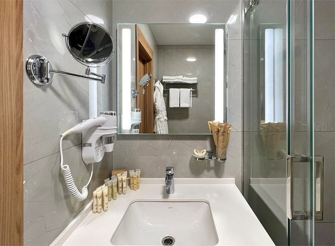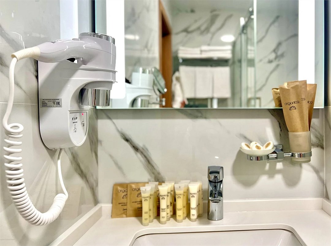 Wi-Fi, кондиционер, светильник, настольные лампы, фен, электронные замки, душевая кабина, теплый пол, банные принадлежности, халаты, банные полотенца, пляжные полотенца, тапочки, гигиенические средства, две односпальные или большая двуспальная кровать, гладильная доска, шкаф для одежды, вешалки, багажная тумба, зеркало, пуфики, чайный набор, сейф, чайник, унитаз, раковина, отопление, кулер на этаже, кресло, вид во двор, тумба, туалет, внутренний телефон, мини-холодильник, вид на озеро, телевизор со Smart TV, теплые полы, собственный бассейн, антибактериальное средство для рук, джакузиВ гостиничном номере