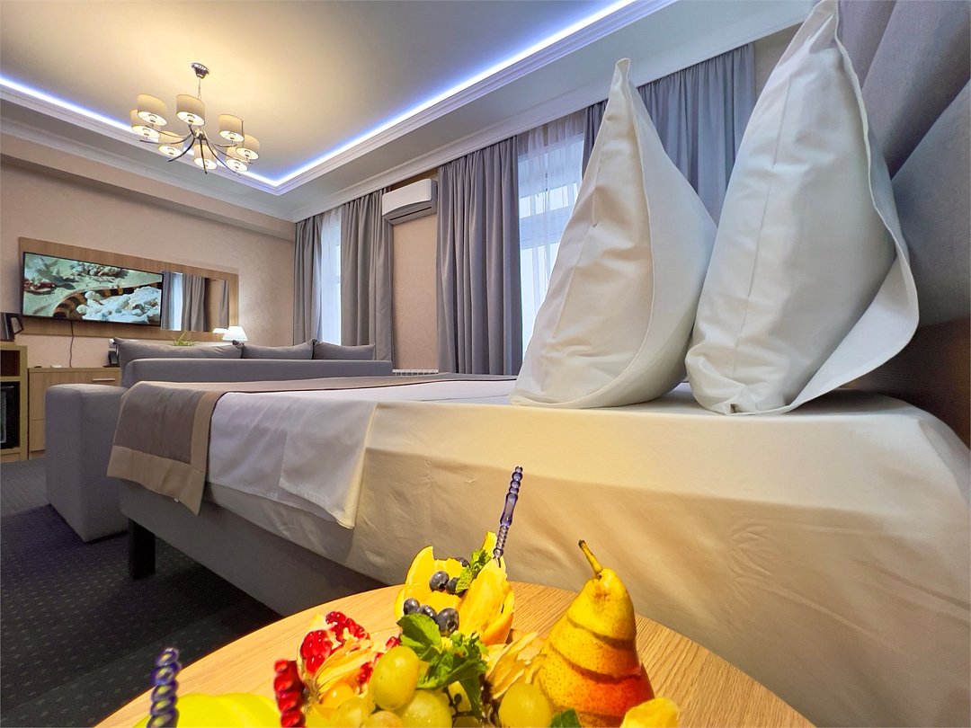 Путешествие с семьейотличное место для остановки после путешествия в горахОстанавливались в этом отеле на 1 ночь 2 взр + 14 лет. Брали стандартный номер с доп кроватью для сына. Номер чистый, аккуратный есть все необходимое - тапочки, халаты, принадлежнлсти. По первой просьбе поменяли доп кровать для ребёнка на большую. После поездок по горном Дагестану получили полное удовольствие! Матрасы на кроватях удобные, отель новый, все чистое, есть большой бассейн, очень комфортный, народу не много, очень приятно было поплавать после путешествия. Хороший ресторан, можно вкусно поесть, помогли вызвать такси в аэропорт, персонал приветливый. Все понравилось. Рекомендую.