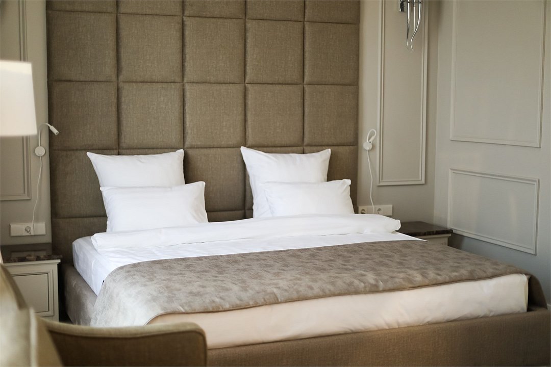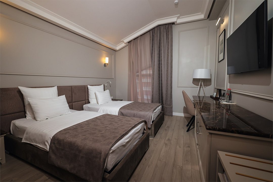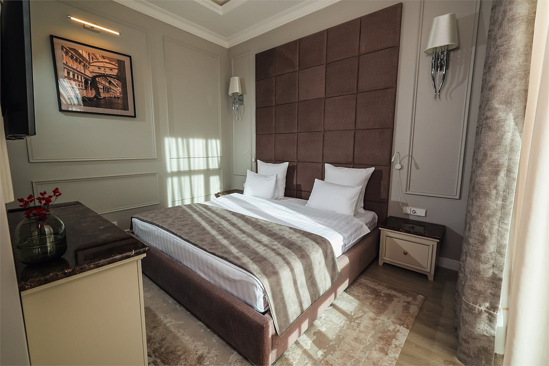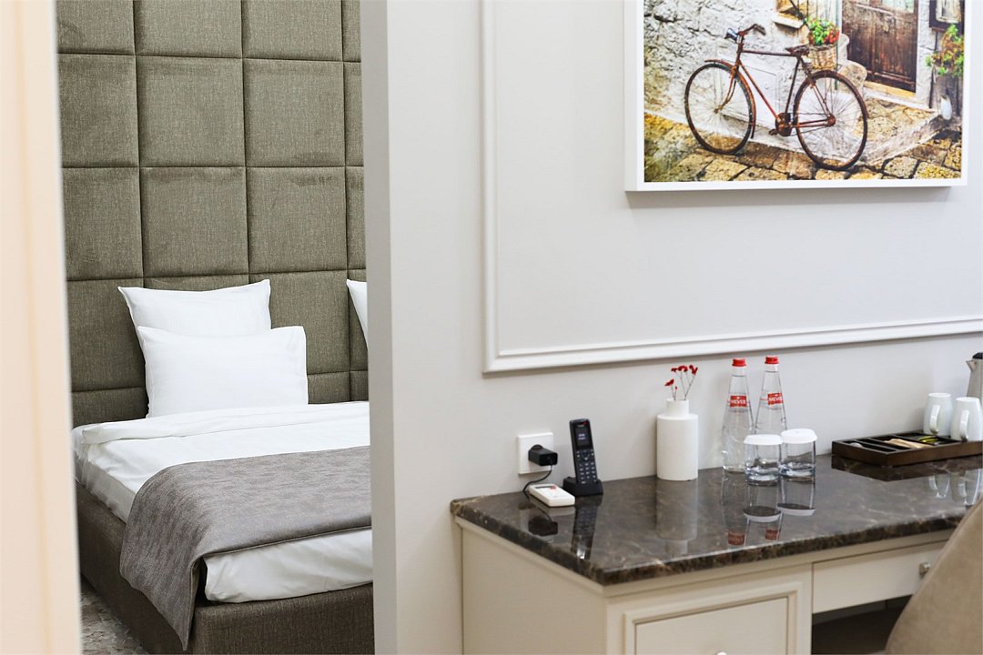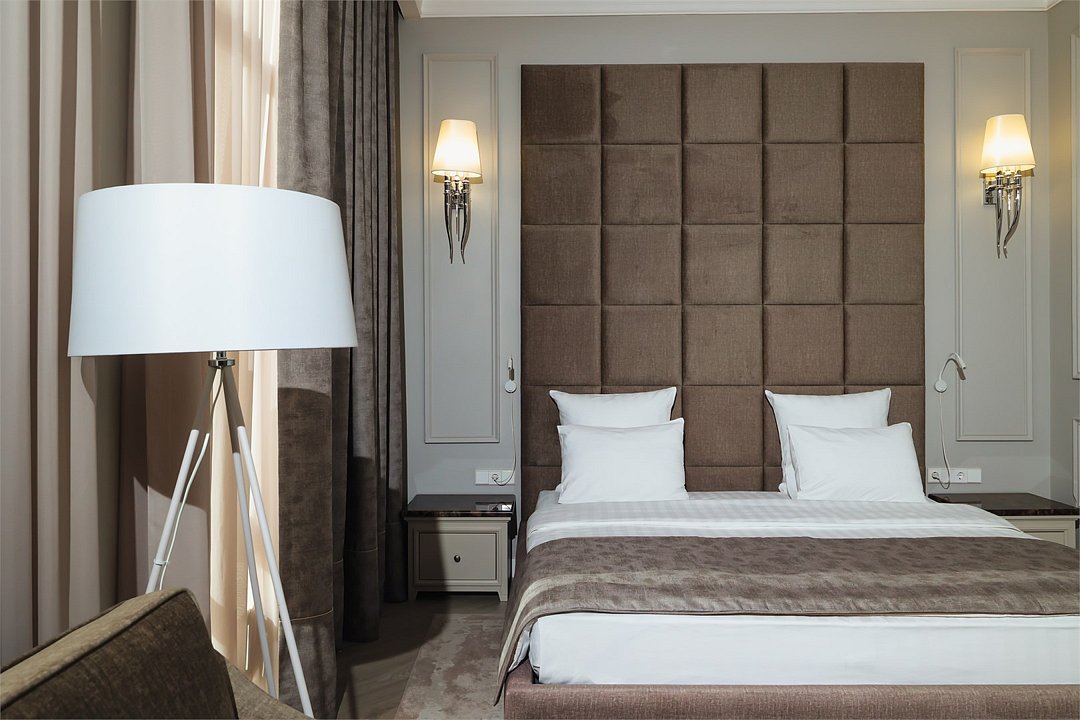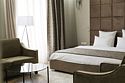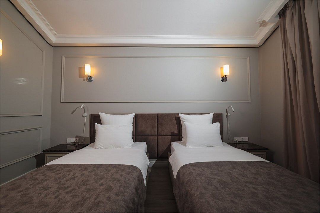 Стандарт Твин – комфорт и функциональность на 20 м² Элегантный номер площадью 20 м² с двумя отдельными кроватями (90 × 200 см) идеально подойдёт как для деловых поездок, так и для комфортного отдыха. Интерьер выполнен в светлых тонах с элементами современной классики, создавая атмосферу уюта и спокойствия. В номере: • Просторная рабочая зона • Интерактивное ТВ • Быстрый Wi-Fi • Чайная станция с двумя сортами чая • Сейф • Фен • Премиальная косметика • Мягкие халаты и тапочки Каждое утро для гостей подаётся завтрак по системе «шведская линия» в лобби-баре отеля.Услуги и удобства