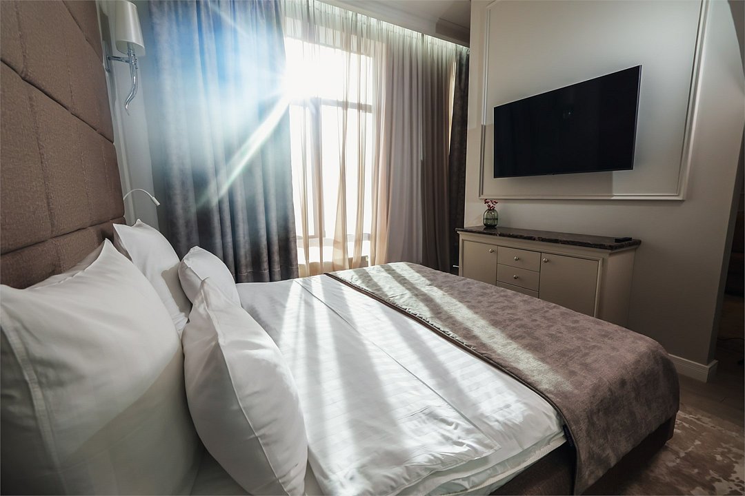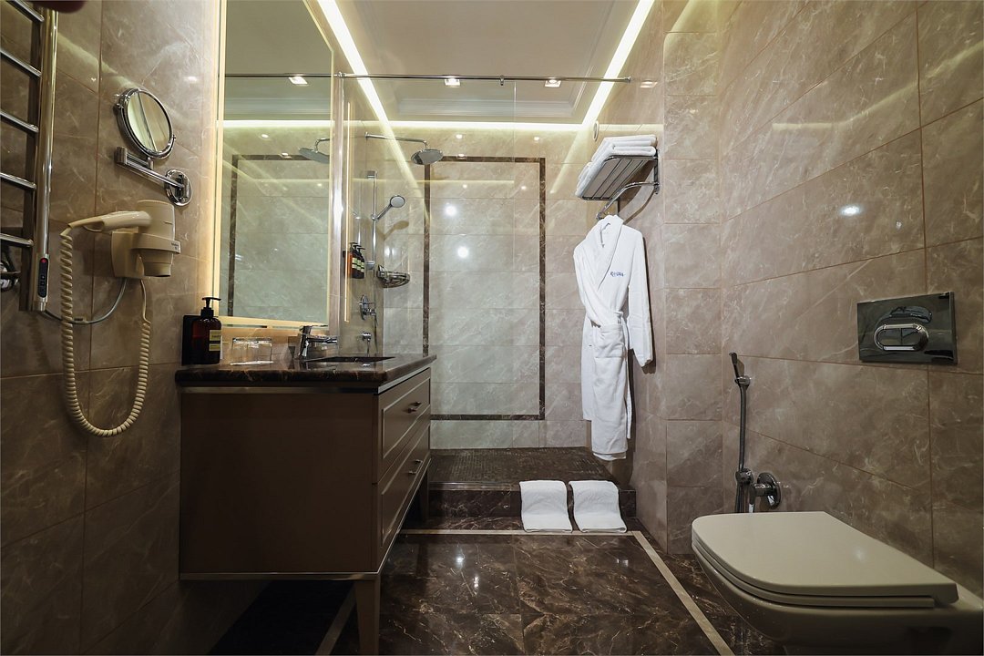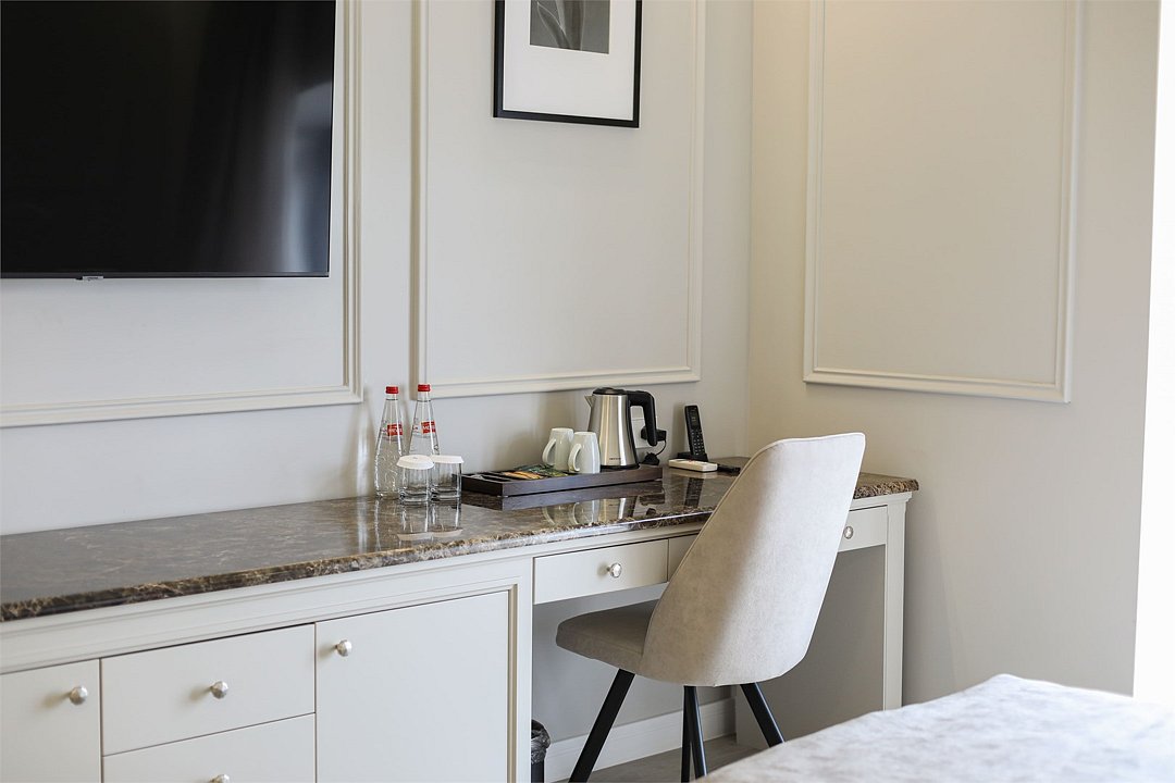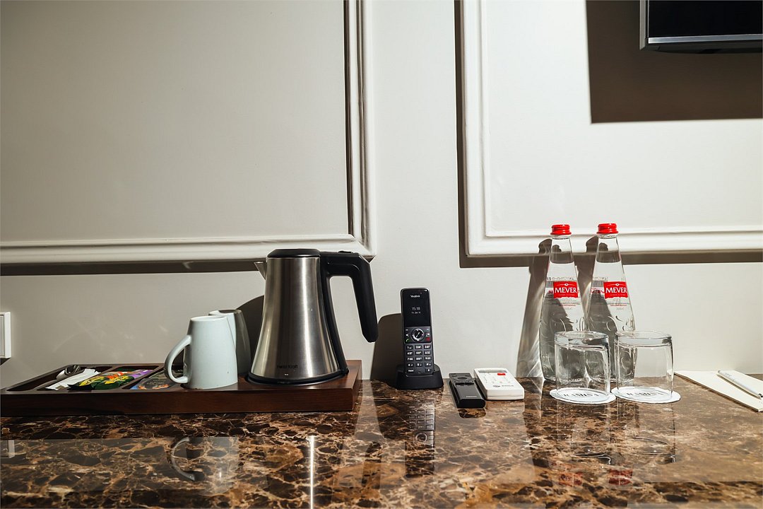 спутниковое телевидение, Wi-Fi, интернет, телефон, кондиционер, система климат-контроля, светильник, настольные лампы, фен, будильник, электронные замки, утюг, ванная комната, санузел, теплый пол, банные принадлежности, халаты, банные полотенца, тапочки, гигиенические средства, косметические средства, гипоаллергенное белье, гладильная доска, ортопедический матрас, кресла, стулья, письменный стол, багажная тумба, зеркало, ковер, звуконепроницаемые стены и окна, мини-бар, письменные принадлежности, чайный набор, набор посуды, информационная карта, меню, сейф, чайник, унитаз, раковина, мягкая мебель, косметическое зеркало, питьевая вода, отопление, душ, вид на город, кресло, вид во двор, ламинат, высокие потолки, стаканы, туалетный столик, туалетные средства, туалет, сплит-система, панорамные окна, сушилка для белья, цифровое тв, раскладной диван, внутренний телефон, телевизор с плоским экраном, мини-холодильник, шкаф-купе, гостиничная парфюмерия, телевизор со Smart TV, номер для некурящих, USB-порт, рабочий стол, гигиенический душ, кровать «Super king size», чайная станция, без питомцевВ гостиничном номере