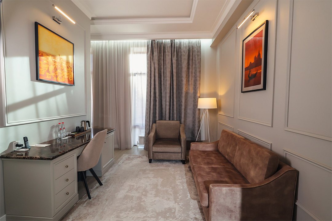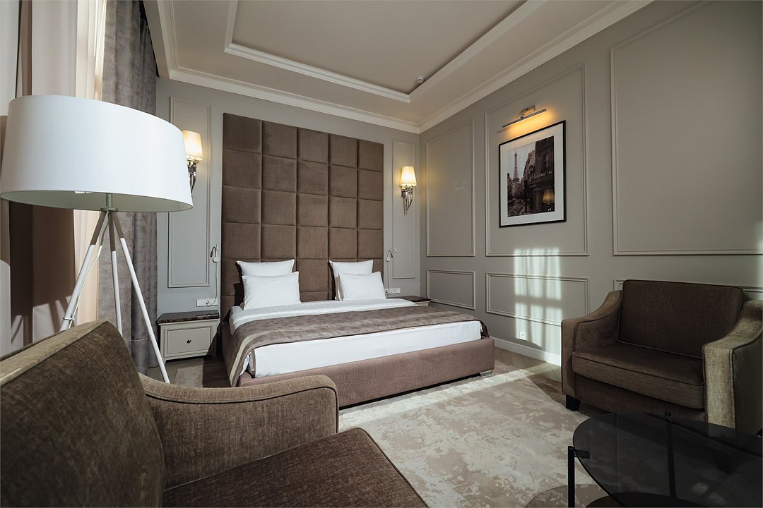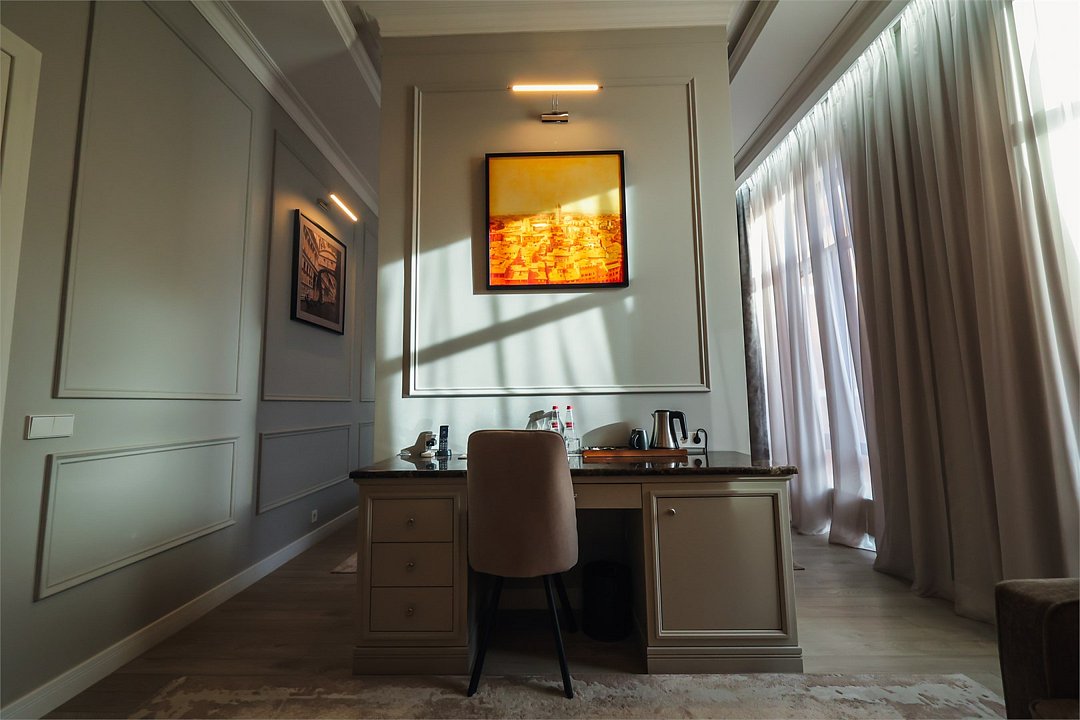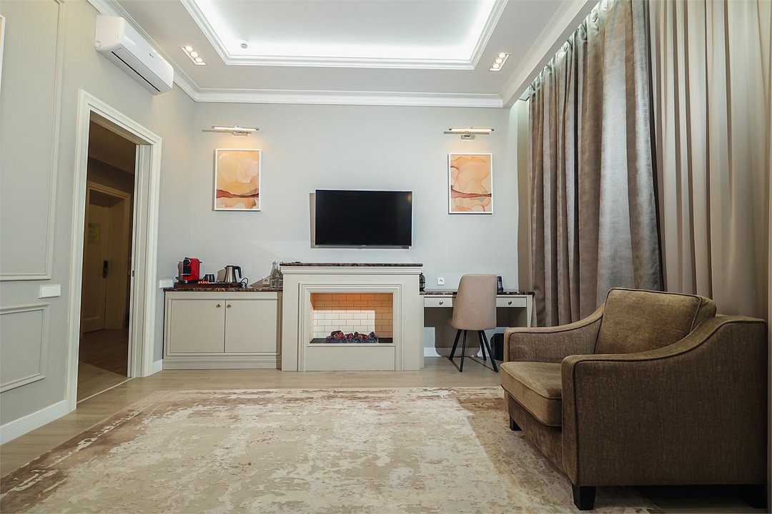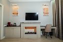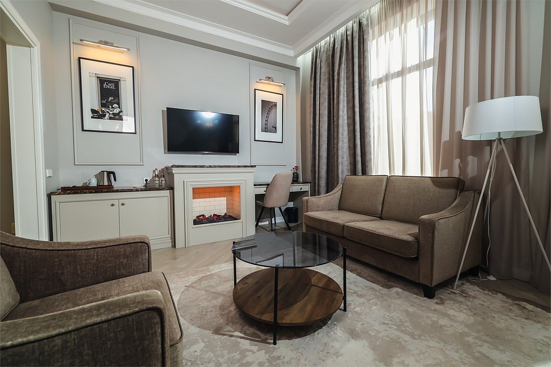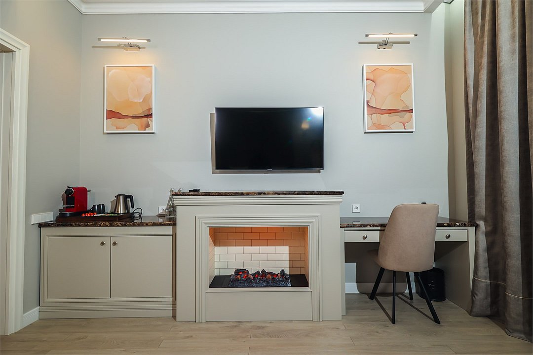 Делюкс – стиль, комфорт и уют живого огня Просторный номер Делюкс площадью 40 м² сочетает в себе три функциональные зоны: уютную спальню, комфортабельную гостиную и удобное рабочее место. Особую атмосферу создаёт декоративный камин – деталь, которая превращает отдых в настоящее удовольствие. В вашем распоряжении: • Телевизор с плоским экраном и интерактивное ТВ • Чайная станция с двумя сортами чая • Быстрый Wi-Fi • Сейф • Фен • Премиальная косметика • Мягкие халаты и тапочки Каждое утро для гостей сервируется завтрак по системе «шведская линия» в лобби-баре отеля.Услуги и удобства