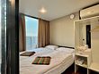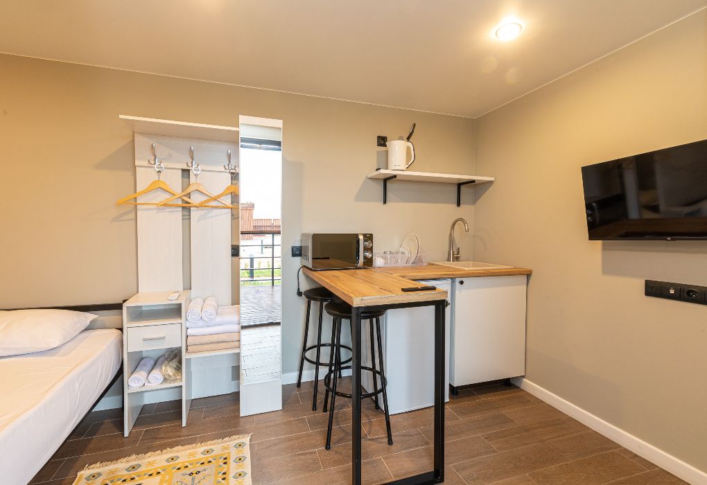 Уютный номер площадью 18 м² расположен на первом этаже современного модульного корпуса и подойдёт для пары или семьи с ребёнком. В номере установлены две односпальные кровати (с возможностью трансформации в одну двуспальную) и дополнительное место в виде удобного кресла-кровати. Также в распоряжении гостей современный санузел с душем, феном и полным набором банных и пляжных полотенец. В номере есть чайная станция с электрическим чайником, чашками, а также наборами чая и кофе. Мини-бар подойдёт для хранения напитков и лёгких закусок. Для досуга – телевизор с функцией Smart TV. Балкон с видом на море и уютной зоной отдыха станет любимым местом, где можно провести вечер или насладиться тишиной утром.Услуги и удобства
