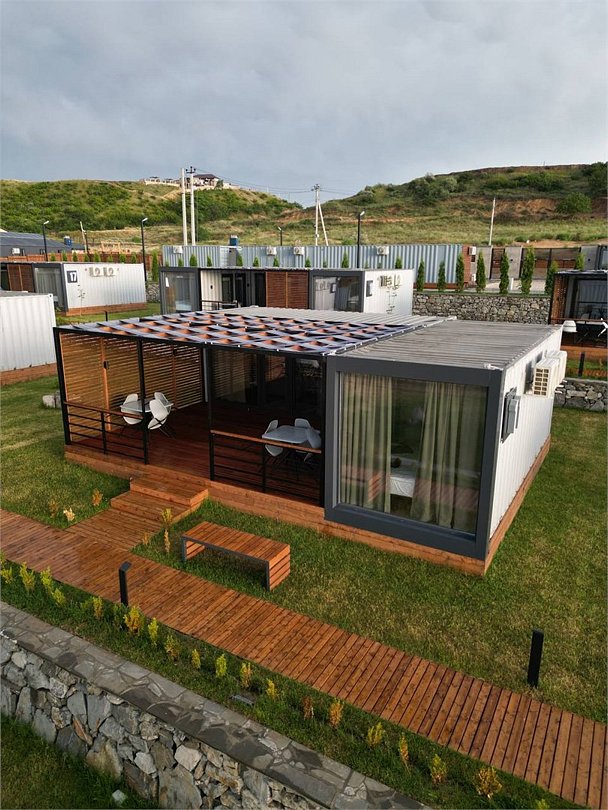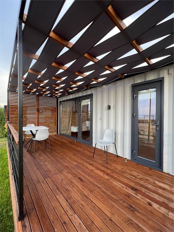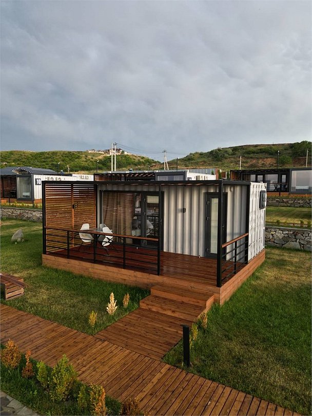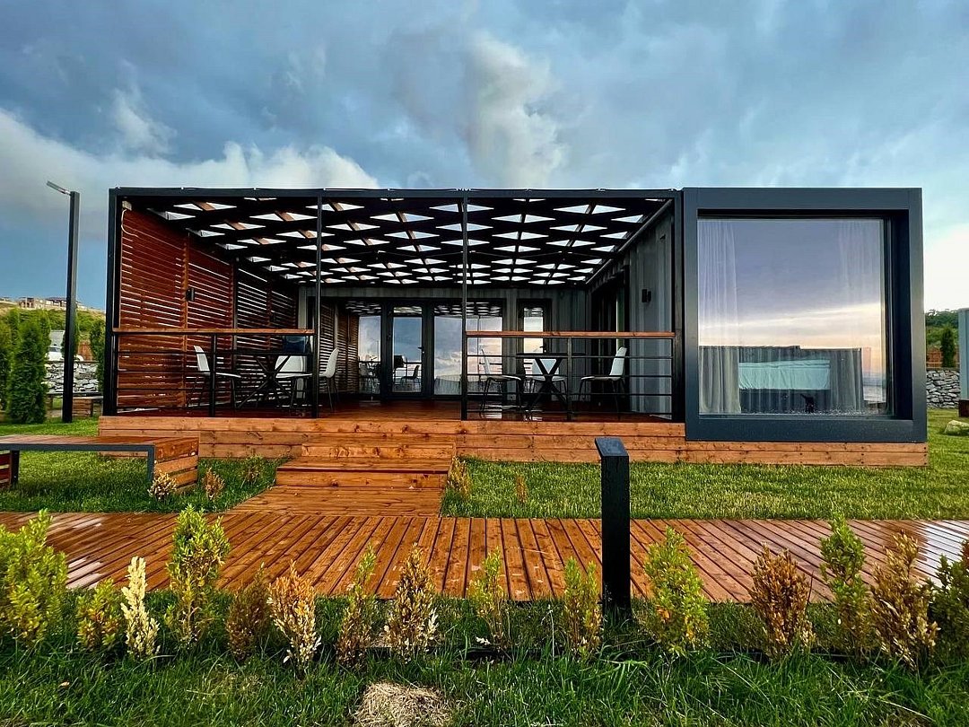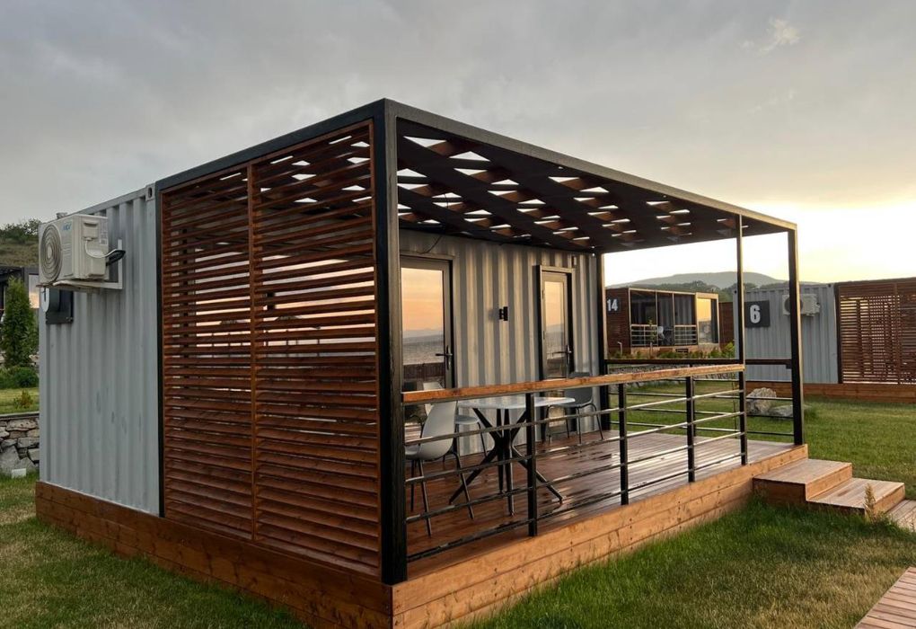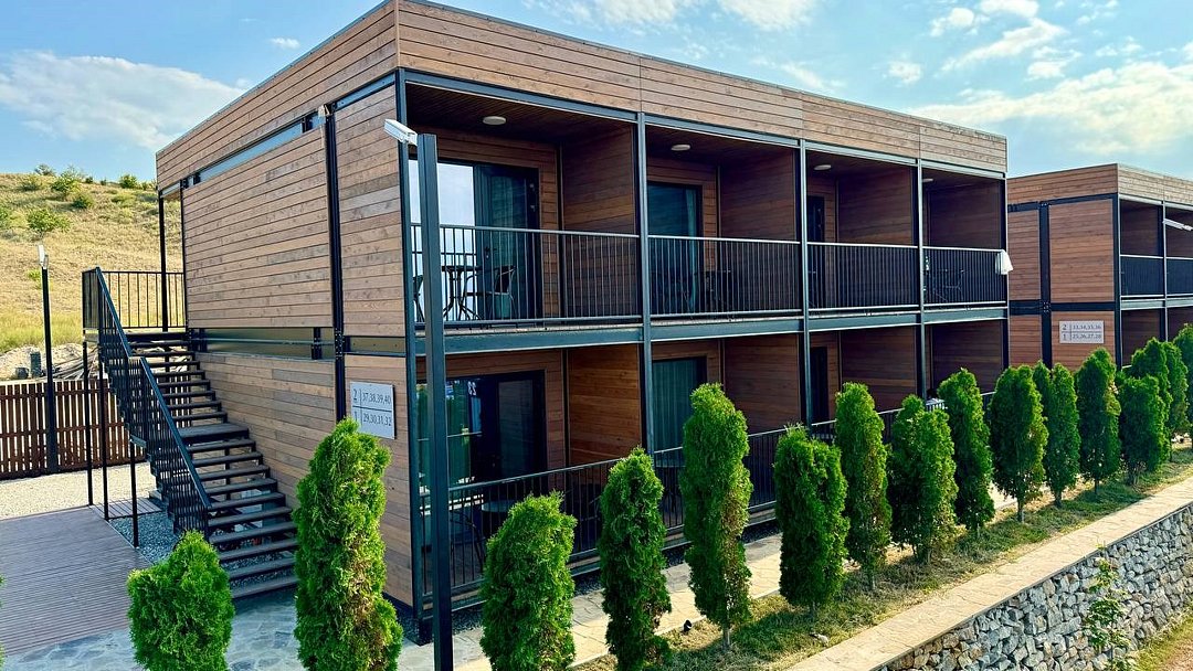 Комплекс включает в себя уютные модульные домики, разместившиеся на благоустроенной территории площадью 1 гектар. В домиках, способных вместить от 2-х до 9 гостей, светлые современные интерьеры, оборудована кухня, есть санузел с душем или ванной.