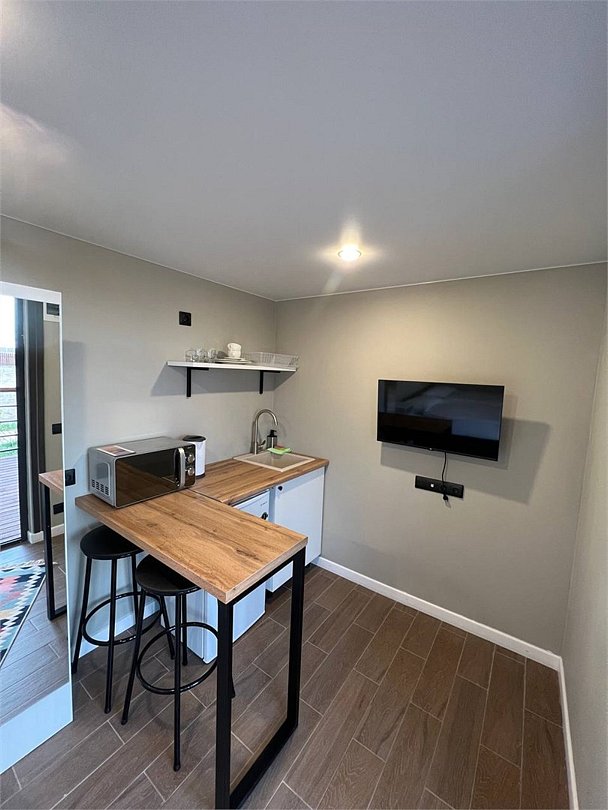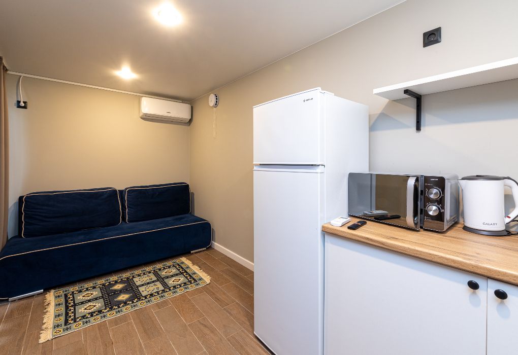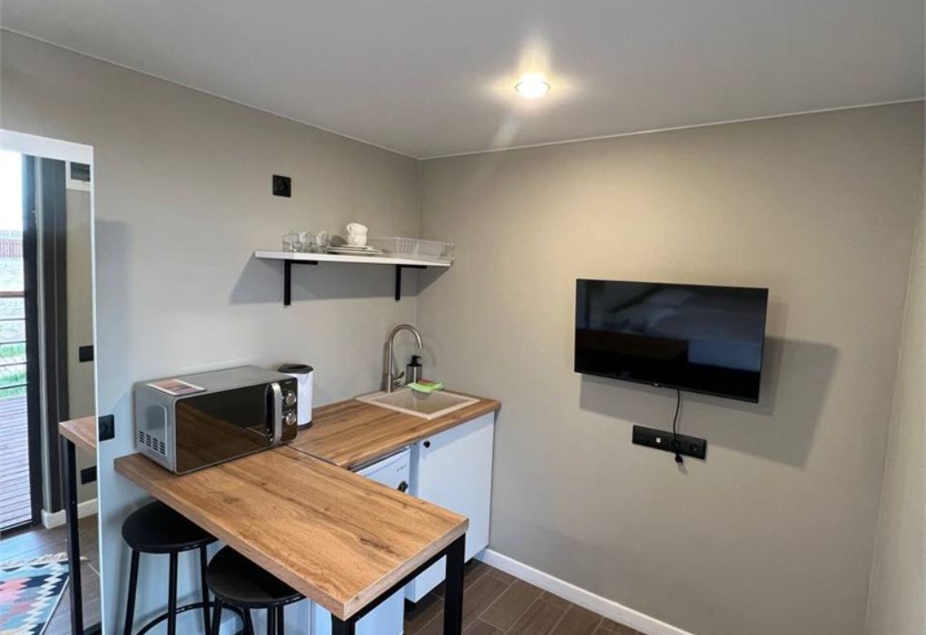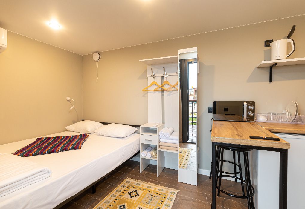 Уютный домик площадью 13 м² – идеальный выбор для пары, ценящей уединение и функциональность. Пространство продумано до мелочей: двуспальная кровать, сплит-система, Smart TV, а также мини-кухня с холодильником, микроволновой печью, чайником и посудой. В вашем распоряжении отдельный санузел с душем, феном и комплектом полотенец, включая пляжное. Собственная терраса с видом на море – приятный бонус для тех, кто любит встречать рассветы и провожать закаты на свежем воздухе.Услуги и удобства