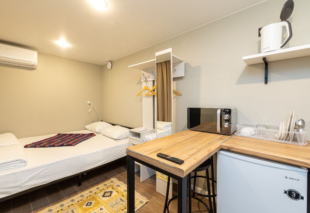 Кухня, двуспальная кровать, телевизор, кондиционер, чайник сан узел.