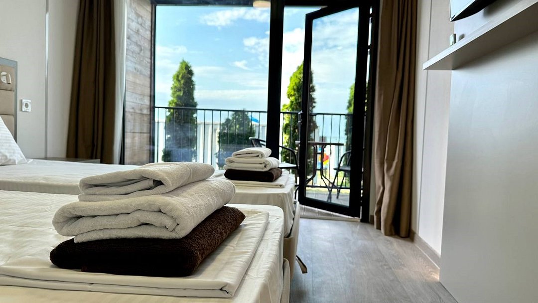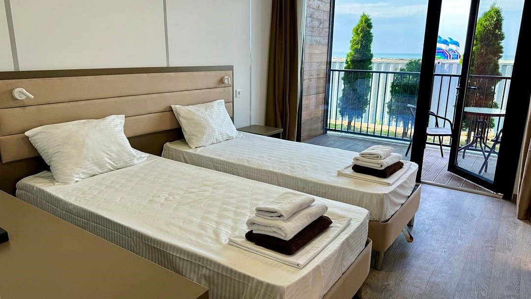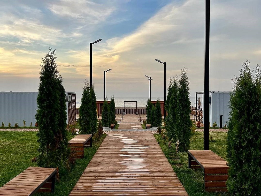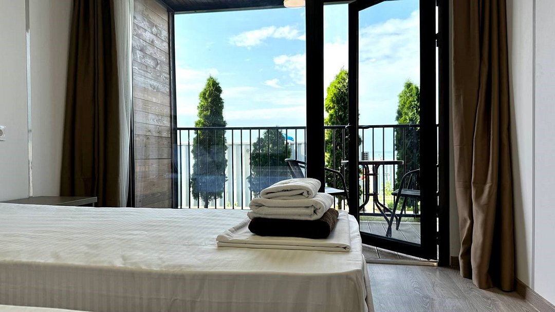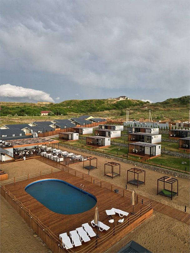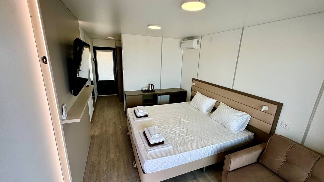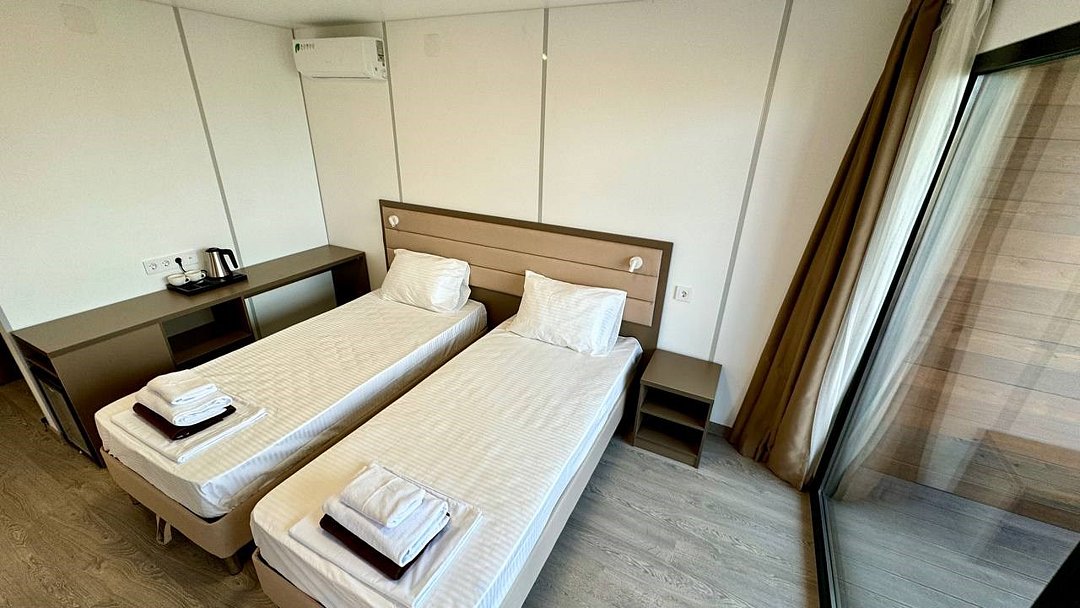 Путешествие с семьейНеожиданно,необычно, современно!Выбрали этот отель случайно и не пожалели! Современная концепция размещения в модулях на любую компанию от 2-9 человек .На рецепшине внимательные, доброжелательные девушки !Домики удобные, в каждой комнате кондиционер, белье белоснежное, полотенца для всего: лица, ног, банное, для пляжа. 👍Все очень часто меняют, убираются, каждое утро убирают мусор, и оставляют минеральную воду в бутылках на количество людей в домике! 🔥Это было неожиданно приятно!В домике есть современная миникухня, холодильник, микроволновка , набор посуды, очень хорошего качества, чайник. 👍В душевой есть прекрасно работающий фен!!, гель для душа, шампунь, мыло, даже есть зубные щетки одноразовые для забывчатых😂Территория под круглосуточной охраной, для машин парковка на территории отеля. Сам отель очень красиво спланирован, везде подсветка ночью, это доставляет эстетическое удовольствие!Море в 100 метрах от домиков! На пляже постоянно убирают мусор, лежаки новенькие, берег держут тоже в чистоте, постоянно убирают водоросли,🔥 С утра работа кипит: моют дорожки из палубной доски, поливают газон,! На территории есть душевые, чтобы смыть песок с пляжа, есть волейбольная площадка, городок для детей Есть прокат сапов, есть магазинчик, в котором можно купить сигареты, пиво, мороженное и многое другое!На территории есть бассейн, тоже оснащённый грибками и лежаками. Отдельная похвала ресторану на территории отеля:готовят просто изумительно!!!!🔥Завтраки входили в стоимость . На завтрак всегда есть 2 вида каш, мюсли, хлопья, 4-6 видов сыров, творог, йогурты, молоко, соки, домашний лимонад, молоко, овощи, Яйца в разных вариантах, блинчики, сырники, сосиски, и очень неплохой вареный кофе!!!🔥🔥Мы перепробовали всю национальную кухню! Ооочень вкусно, готовят быстро, обслуживание тоже очень приветливое, вежливое!Платить можно картой, Q-кодом, наличными, как вам угодно!!