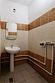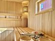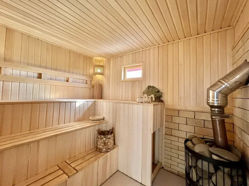 На первом этаже: комфортабельный диван во входной зоне, просторная кухня с гостиной, сауна, душ, и санузел с душевой кабиной.