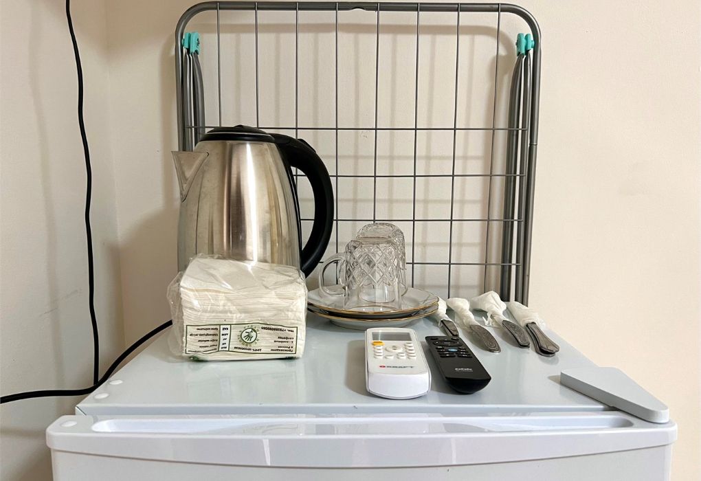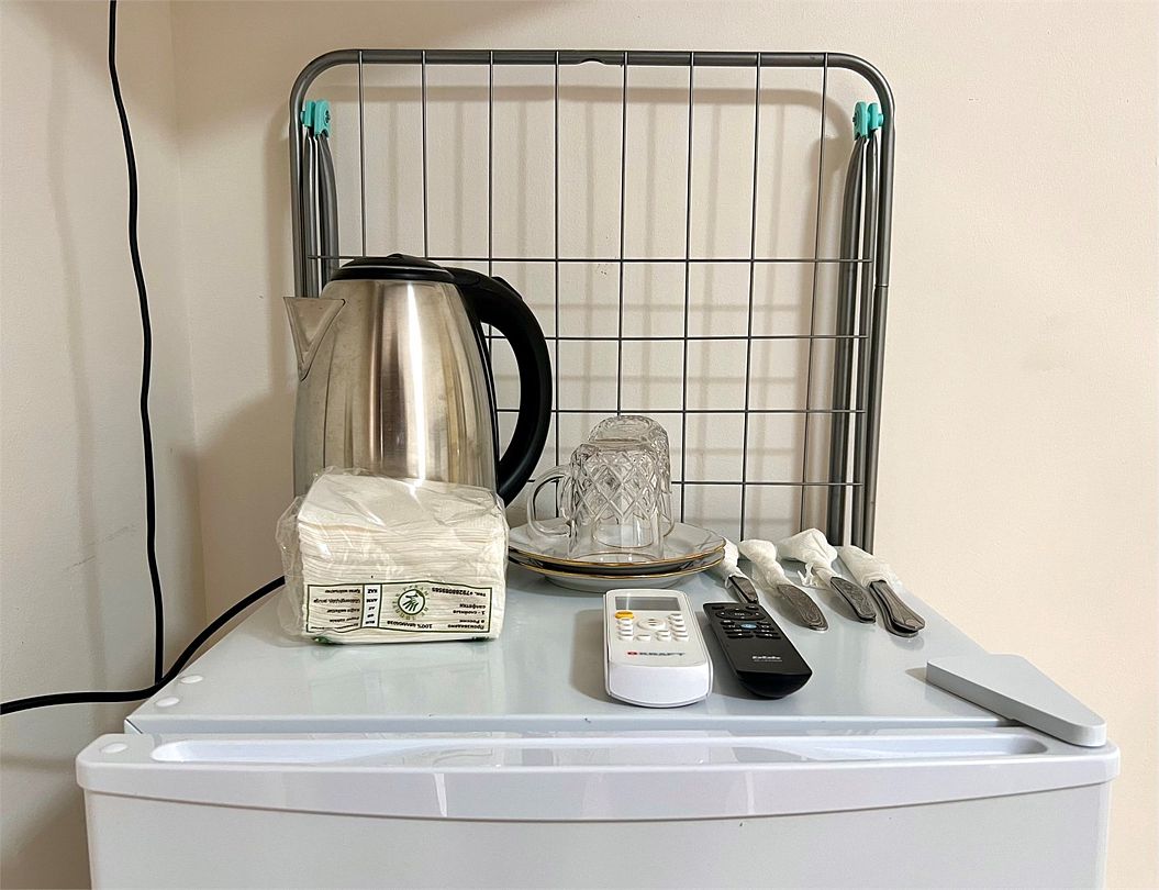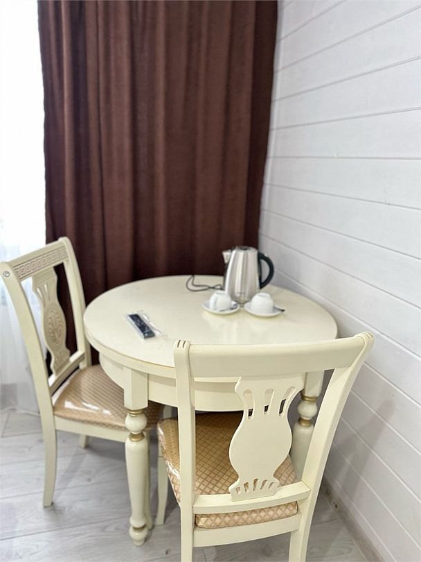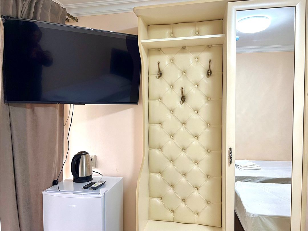 В номере: 2 кровати (90х190 см), тумбочка, шкаф, стол, стулья, санузел с душевой кабиной, телевизор, чайник.