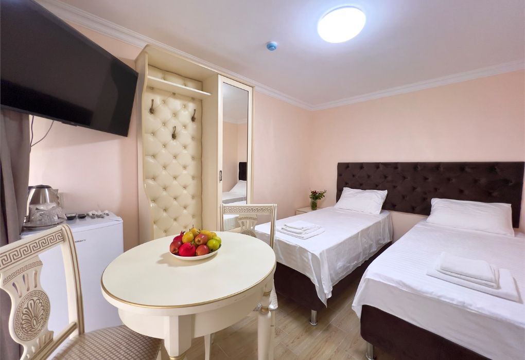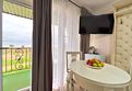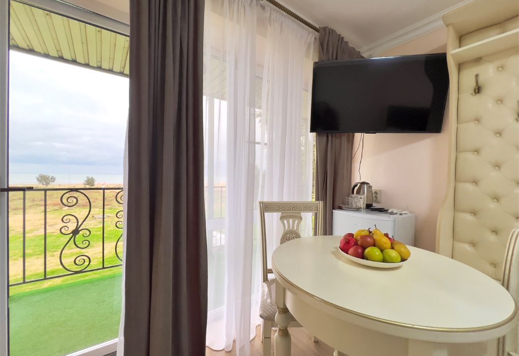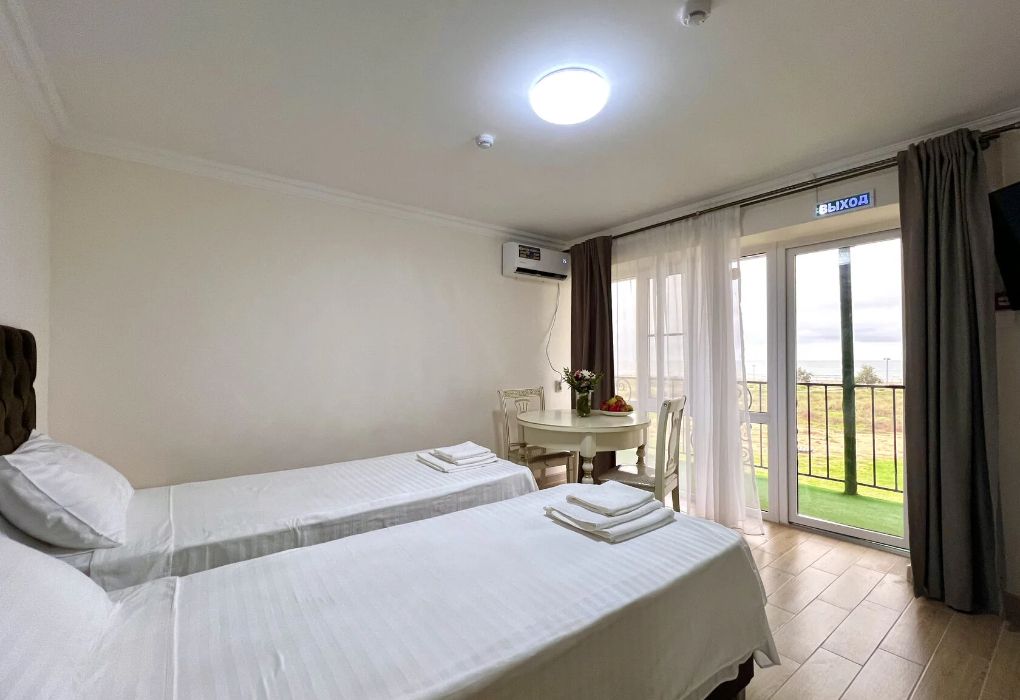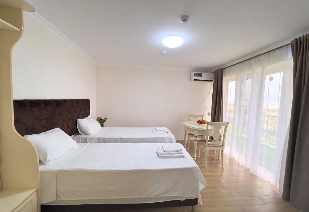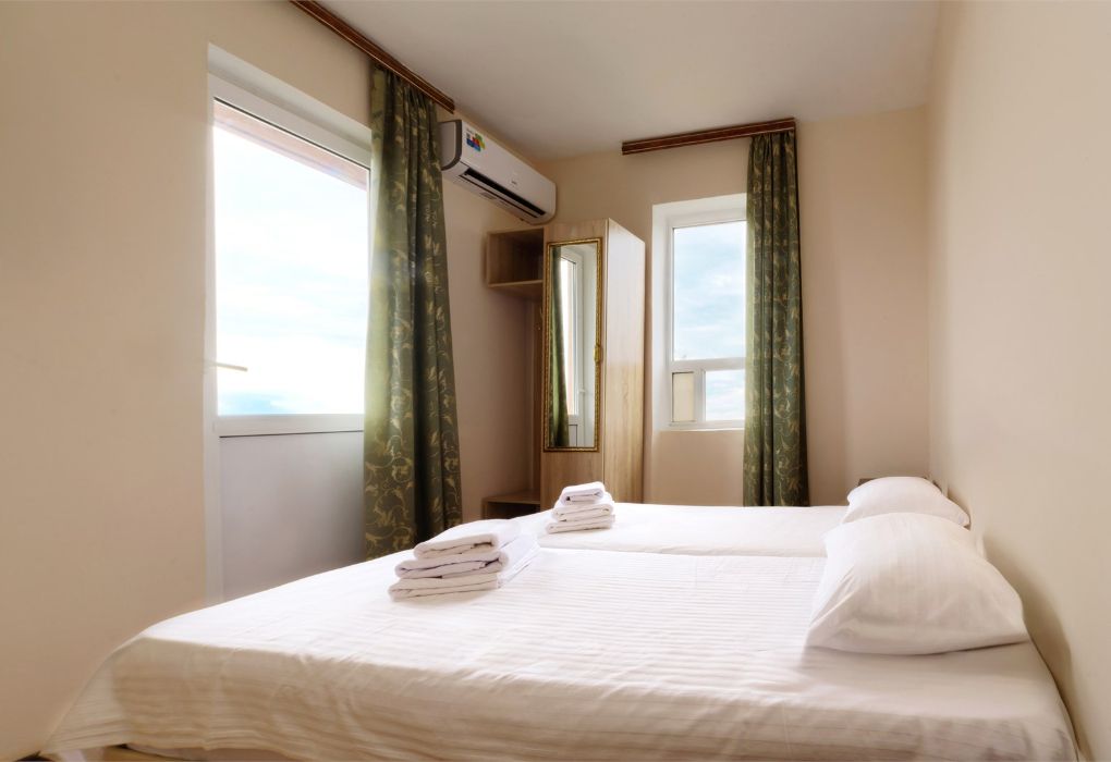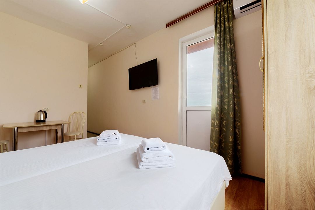 Комфортабельный семейный 2-х комнатный номер с балконом с видом на море с собственной душевой комнатой и санузлом, спальные места оборудованы высокими ортопедическими матрацами, белоснежное белье, гипоаллергенные подушки и одеяла. Кондиционер в каждой комнате. Телевизор смарт ТВ. Холодильник. Чайник. Фен. Банные полотенца и полотенца для лица.