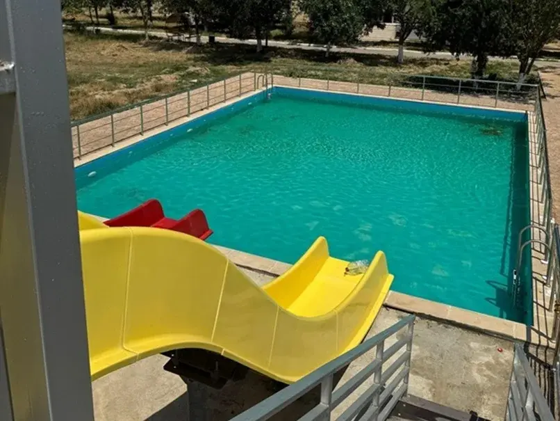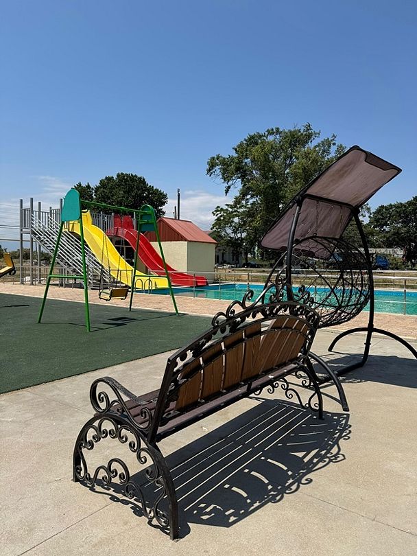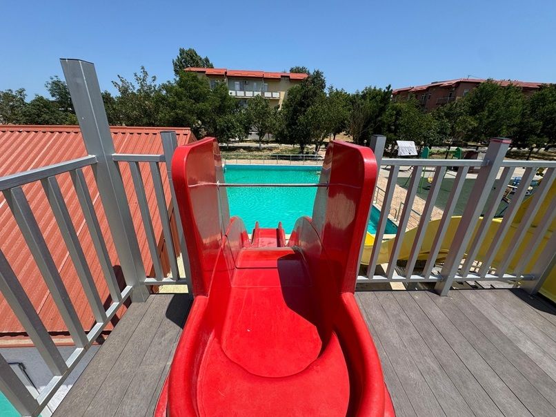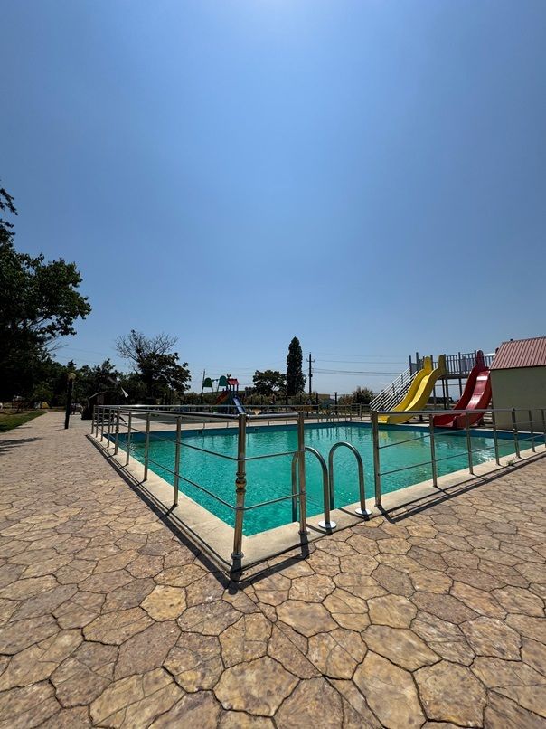 Для семейного досуга имеется детская безопасная площадка и бассейн с водными горками, которые понравятся как детям, так и взрослым.