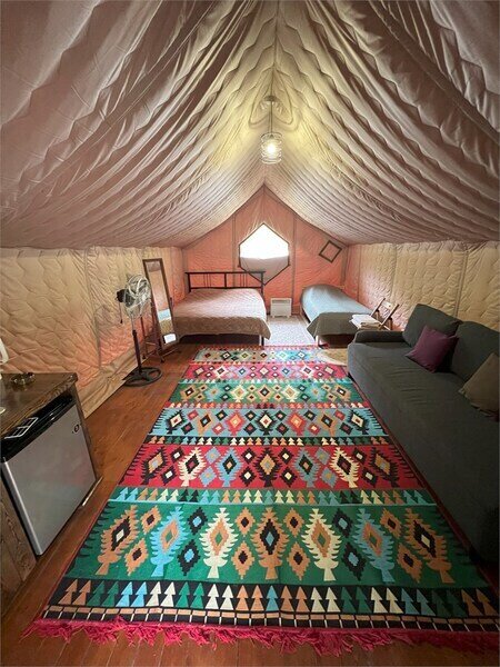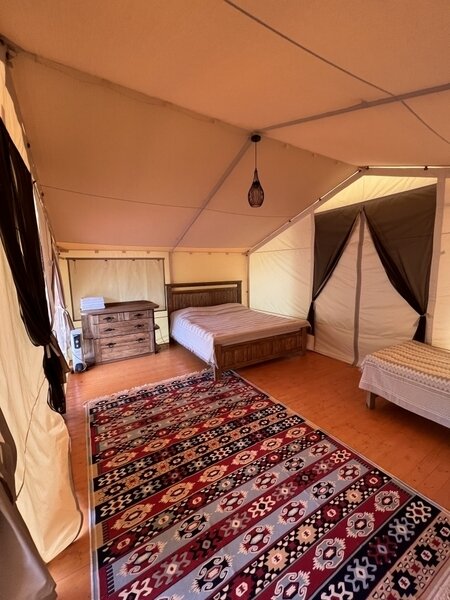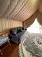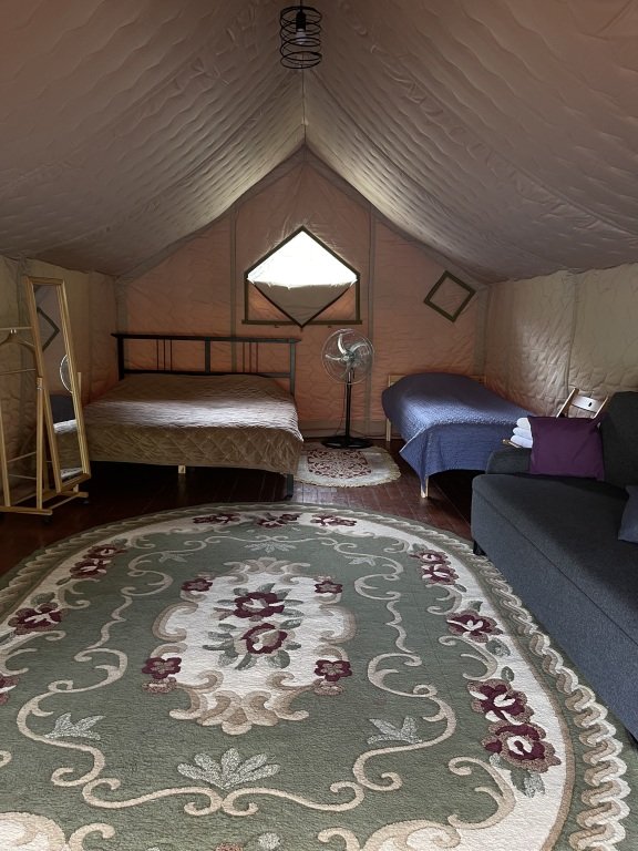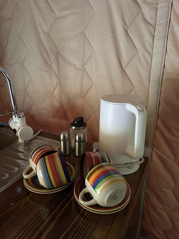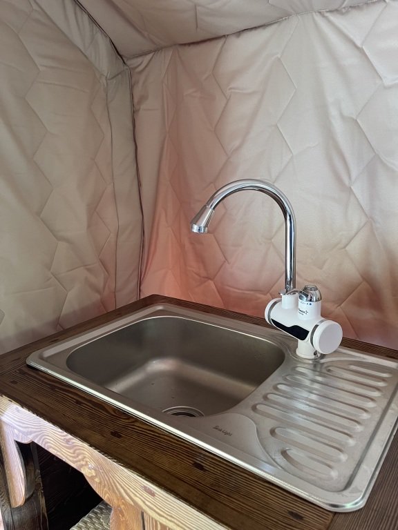 Комфортабельный глэмпинг вместимостью до 5 человек. С удобствами внутри. В глэмпинге: двуспальная , односпальная кровати с ортопедическими матрасами, раскладной диван. Все необходимое для комфортного проживания: набор посуды на пять персон, минибар, электрический чайник, полотенца, банные принадлежности