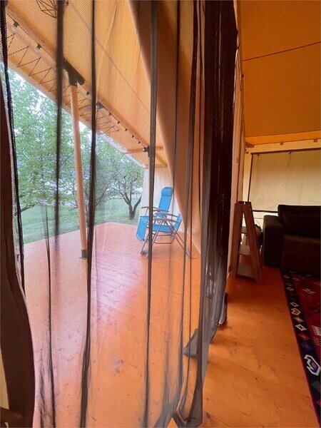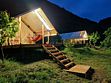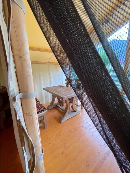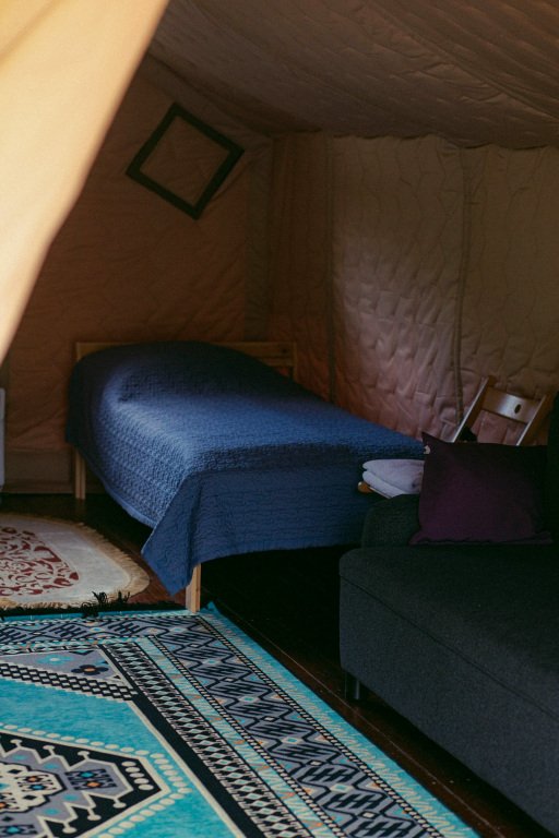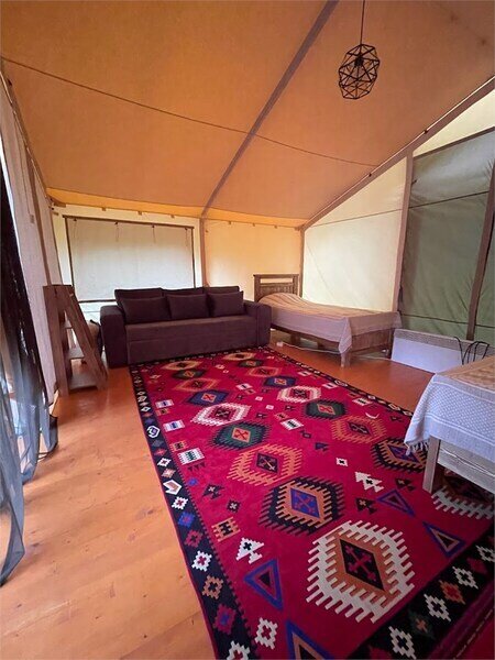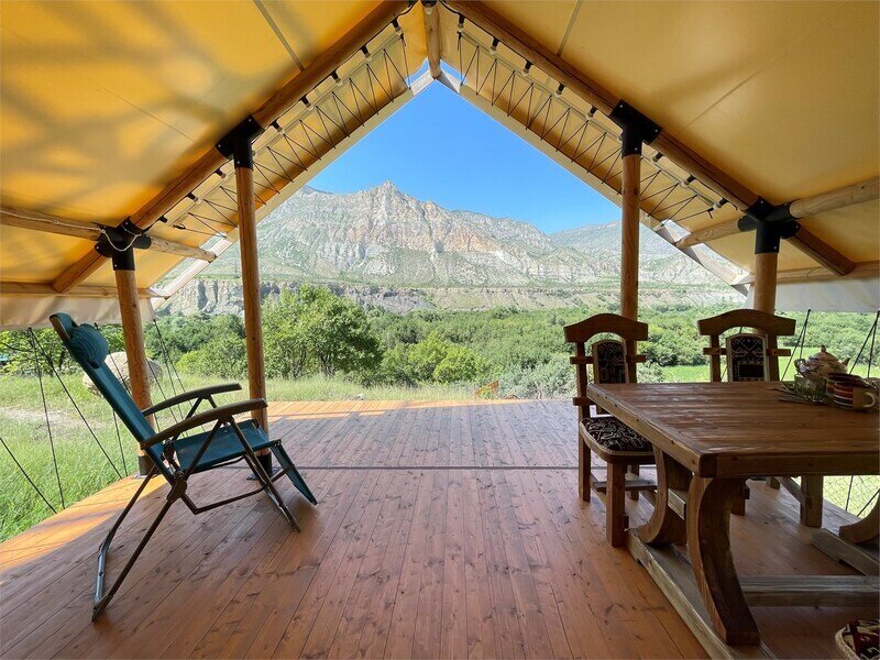Комфортабельный глэмпинг вместимостью до 5 человек. С удобствами внутри. В глэмпинге: двуспальная , односпальная кровати с ортопедическими матрасами, раскладной диван. Все необходимое для комфортного проживания: набор посуды на пять персон, минибар, электрический чайник, полотенца, банные принадлежности Просторная веранда с обеденным столом и зоной отдыха.