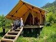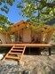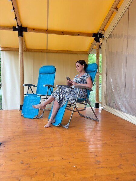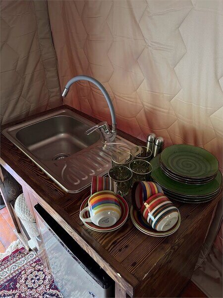 Комфортабельный глэмпинг вместимостью до 5 человек. Душевая, санузел расположена отдельным блоком . В глэмпинге: двуспальная , односпальная кровати с ортопедическими матрасами, раскладной диван. Все необходимое для комфортного проживания: миникухня с раковиной и электроплитой, набор посуды на пять персон, минибар, электрический чайник, полотенца, банные принадлежности. Есть веранда с обеденным столом и зоной отдыха.