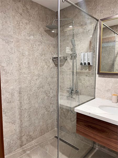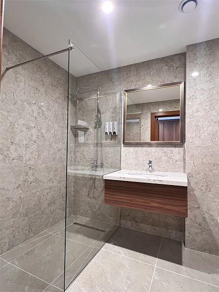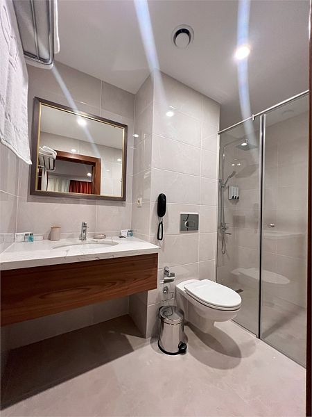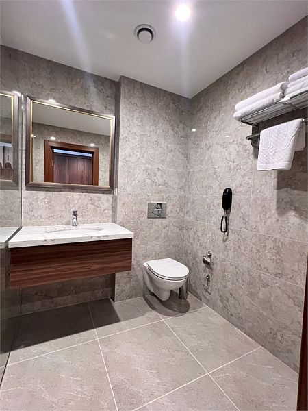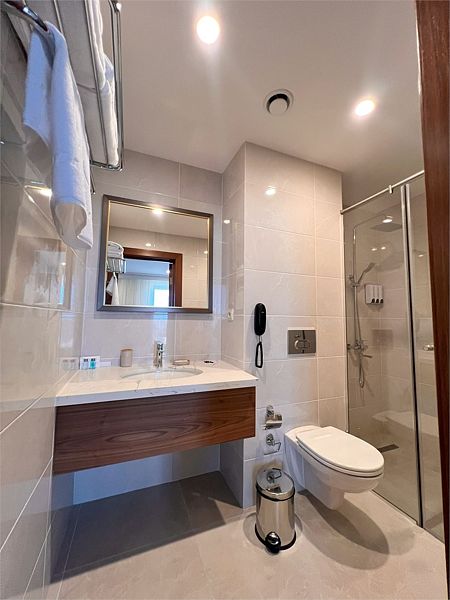 Возле кровати расположены две прикроватные тумбочки, на которых гости найдут настольные лампы и розетки для зарядки своих гаджетов. В номере также имеется вместительный шкаф для одежды, зеркало и стул. В ванной комнате находится душевая кабина, умывальник и унитаз, а также все необходимые туалетные принадлежности и фен.