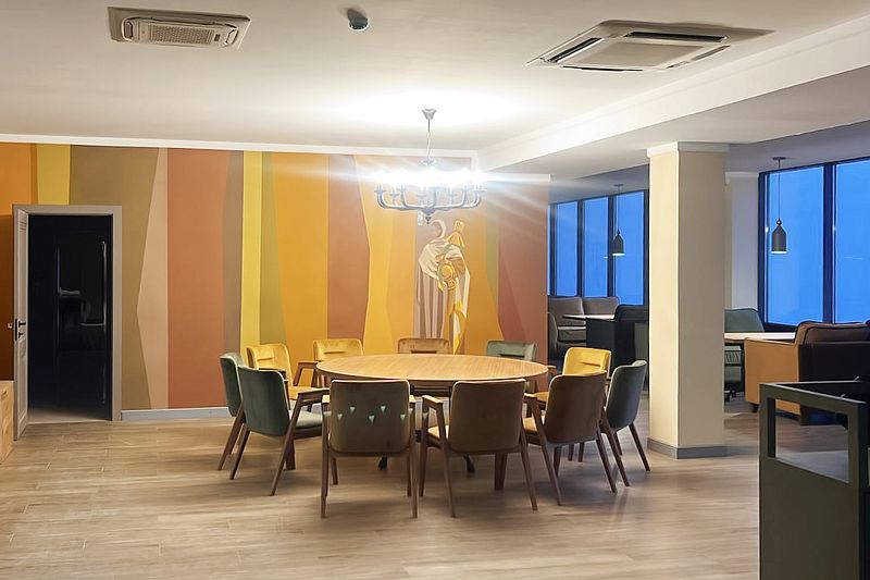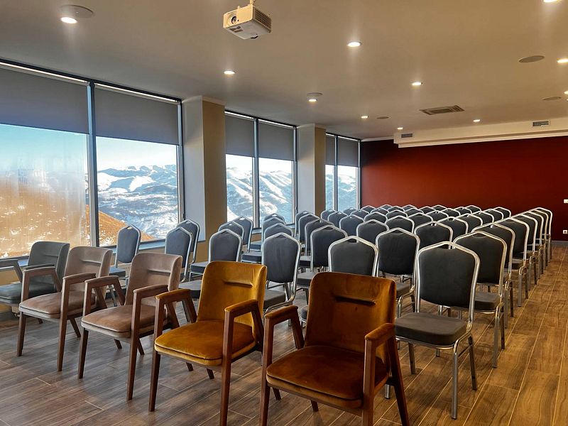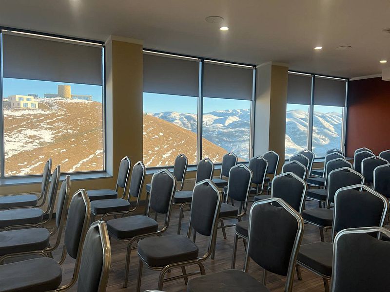 Конференц-зал отеля «Кубачи» — это идеальная площадка для проведения корпоративных мероприятий любого формата. Здесь можно организовать бизнес-встречи, конференции, семинары и тренинги, а также уютные кофе-брейки. Просторное помещение, вмещающее до 70 человек, оснащено всем необходимым для комфортной и продуктивной работы: от автономной климат-контрольной системы до современного оборудования.