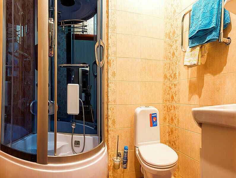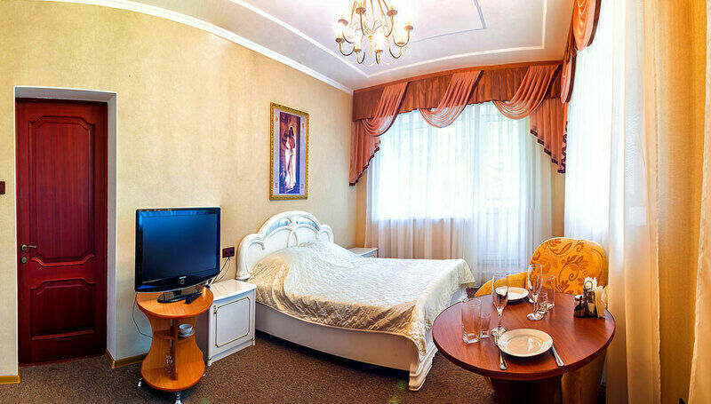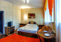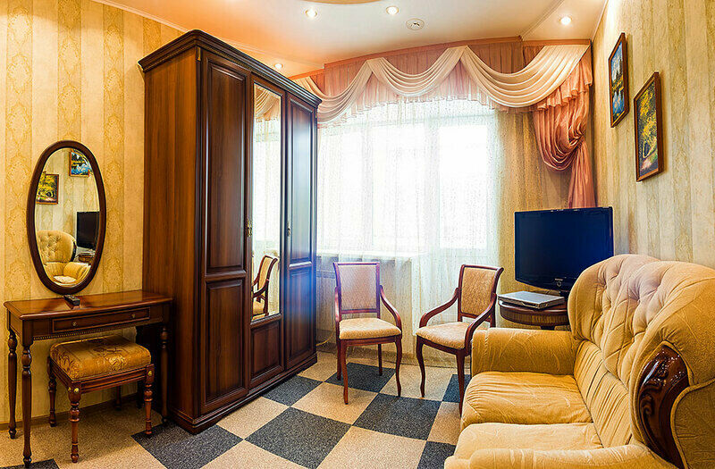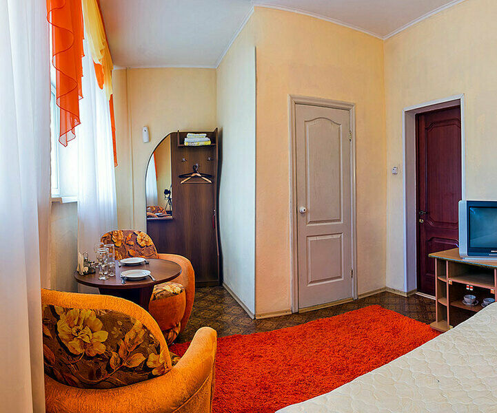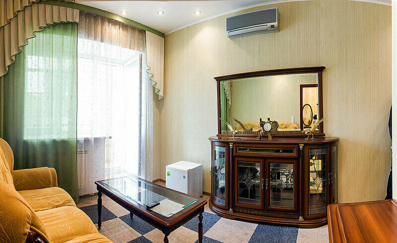 Двуспальная кровать, зона отдыха (стол, два кресла), телевизор, холодильник, чайник, кондиционер, санузел (туалет, раковина, душевая кабина, холодная и горячая вода), выход на балкон. Улучшенный набор мебели.
