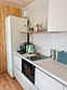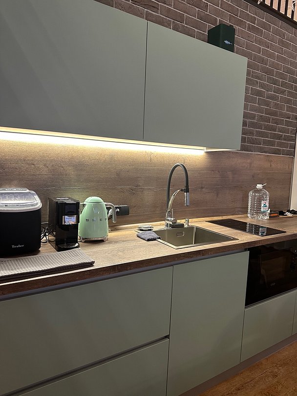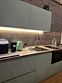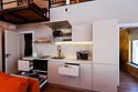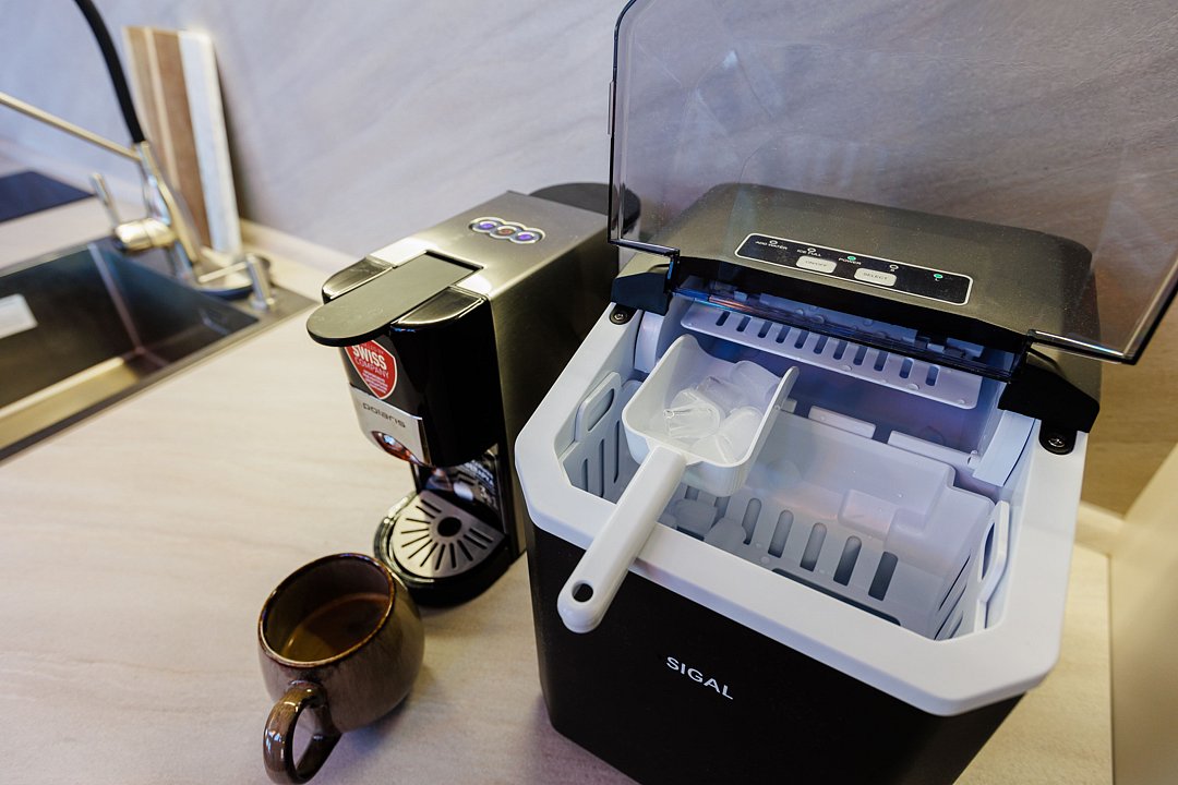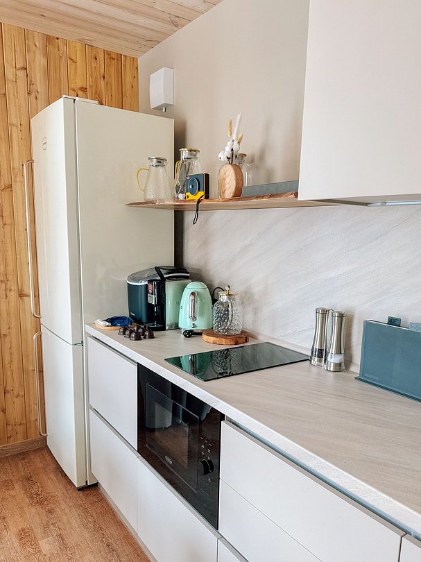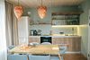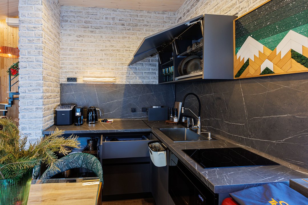 Стильная встроенная кухня оснащена всем необходимым: индукционная плита, микроволновка, чайник, кофемашина, ледогенератор. Обеденную зону украшает стол из натурального дерева.