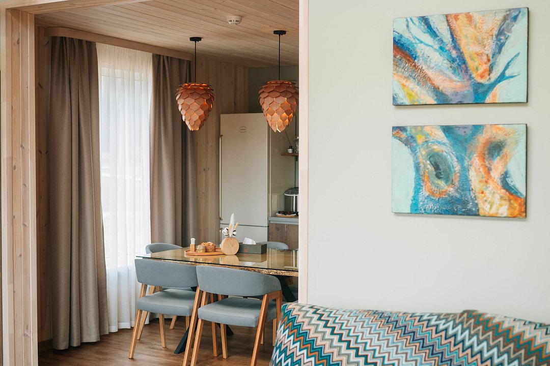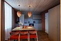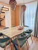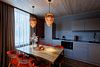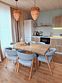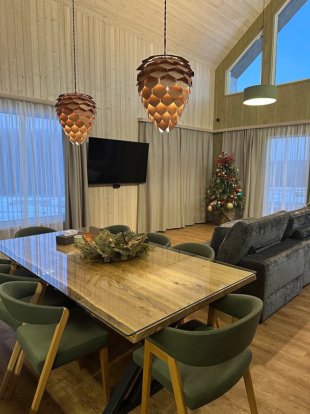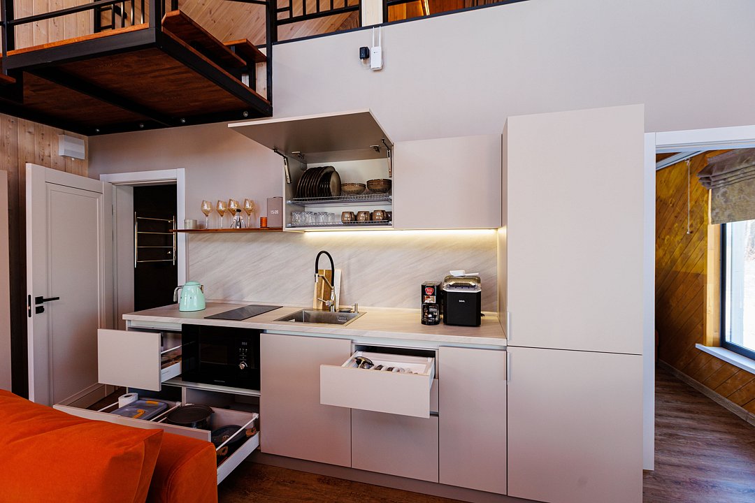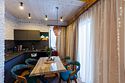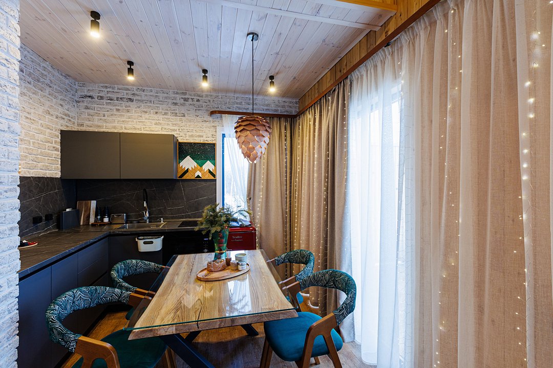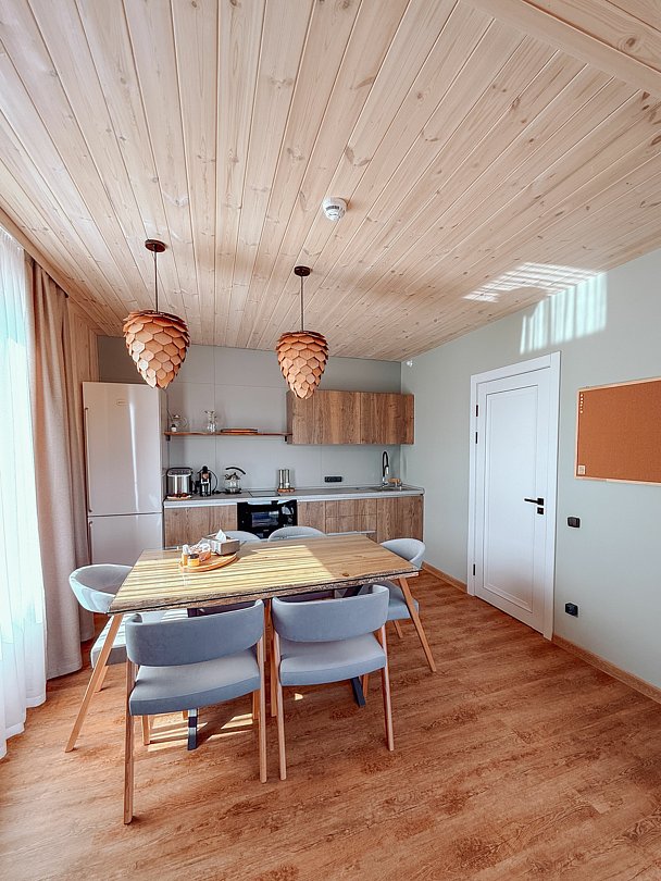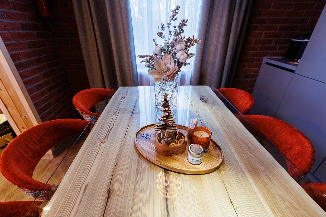 Стильная встроенная кухня оснащена всем необходимым: индукционная плита, микроволновка, чайник, кофемашина, ледогенератор. А за большим столом из натурального дерева сможет разместиться большая компания.