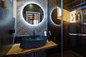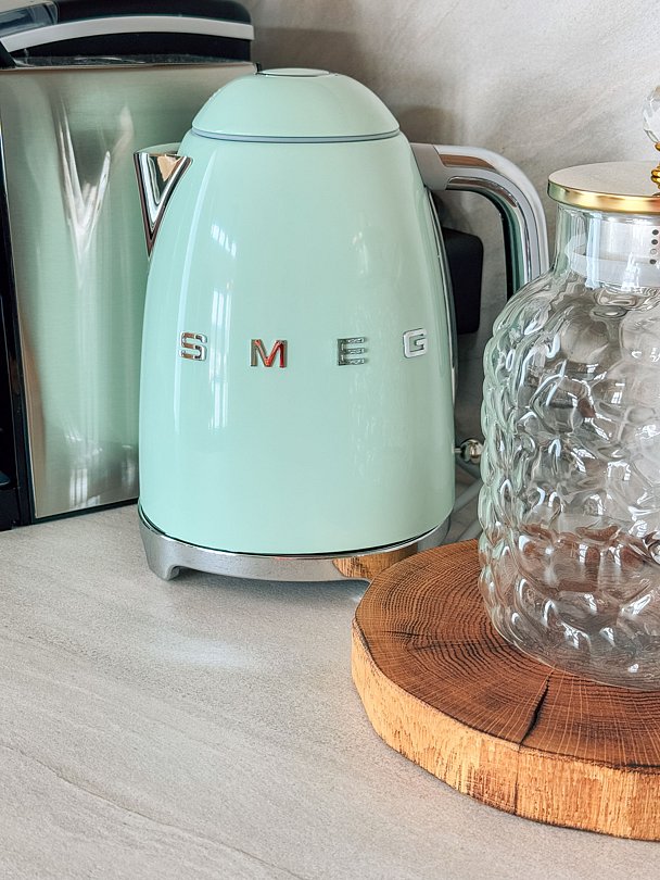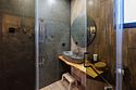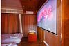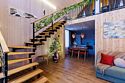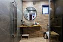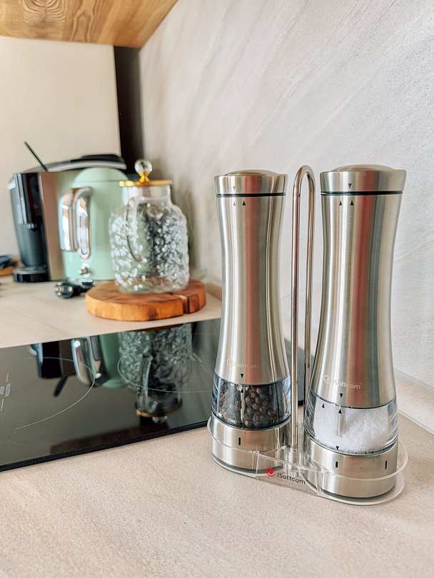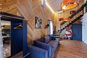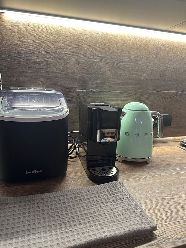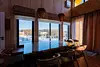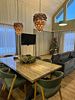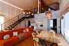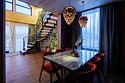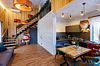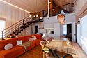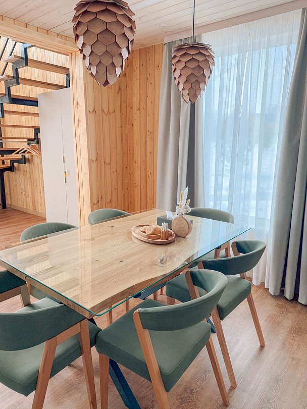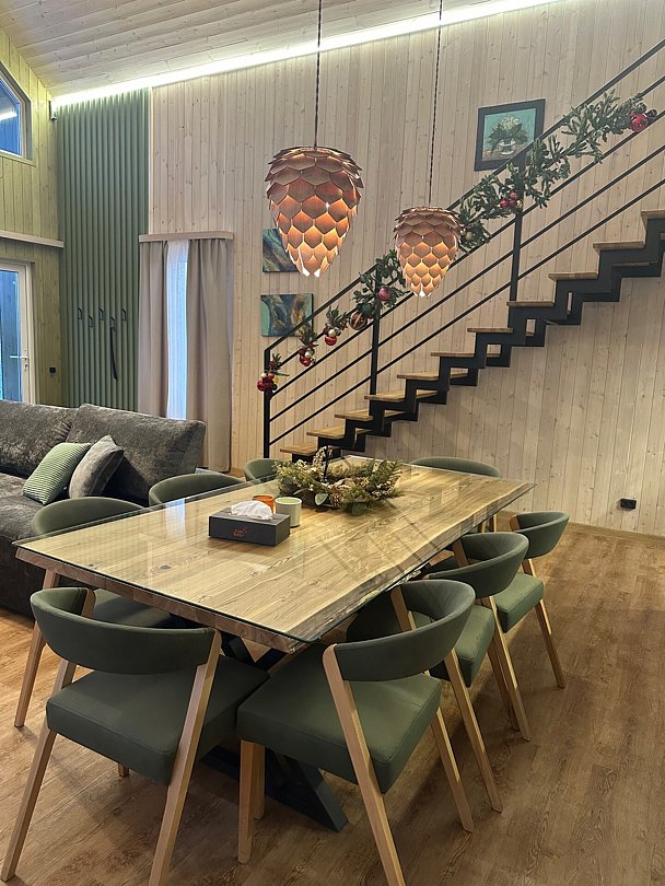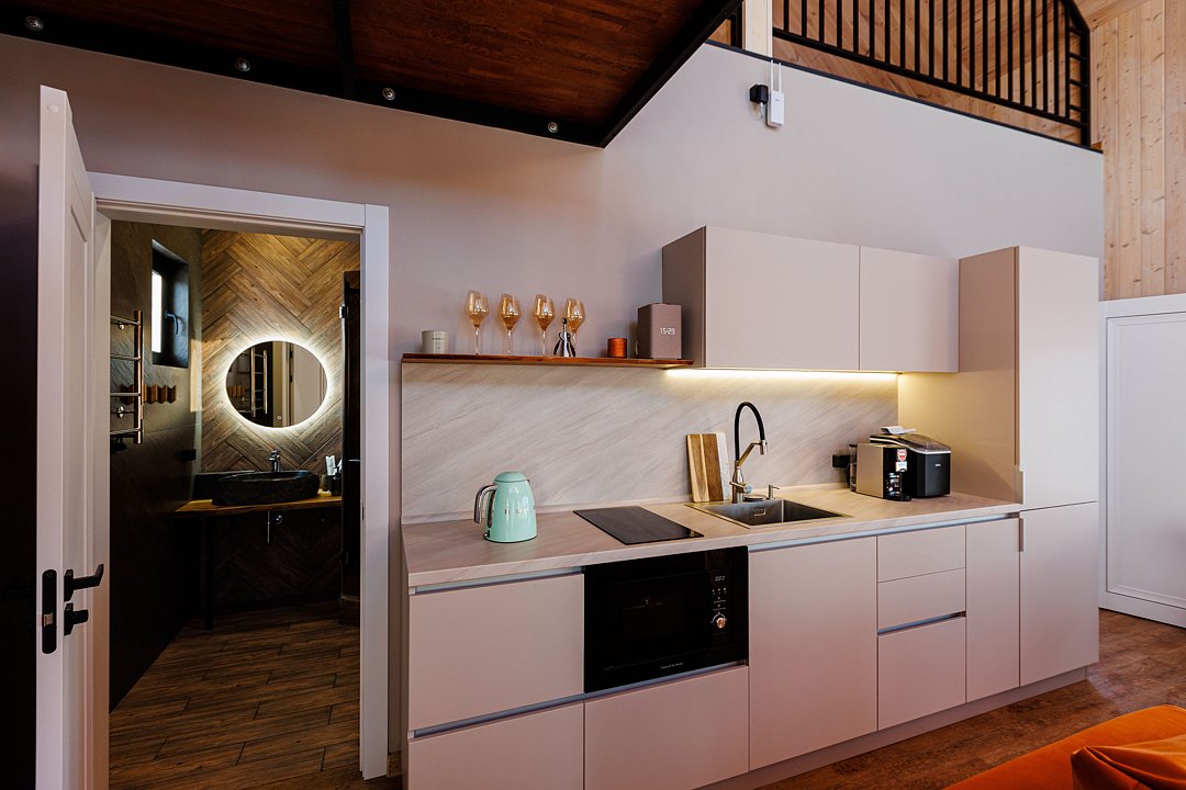Стильная встроенная кухня оснащена всем необходимым: индукционная плита, микроволновка, чайник, кофемашина, ледогенератор. А за большим столом из натурального дерева сможет разместиться большая компания.