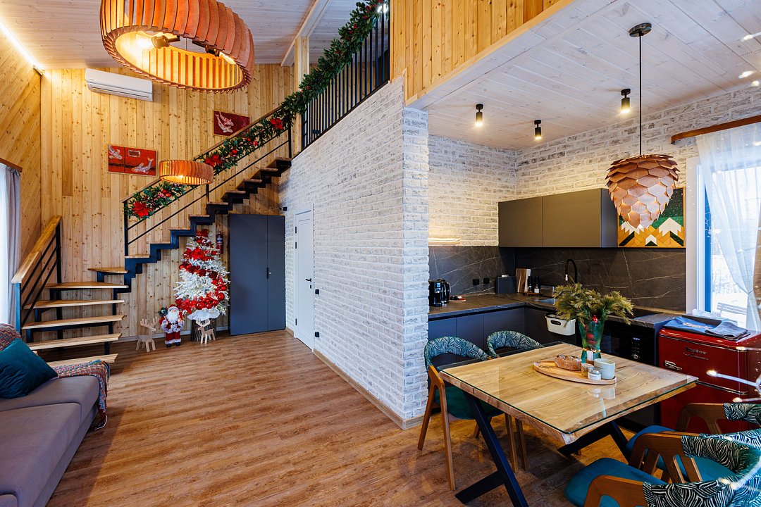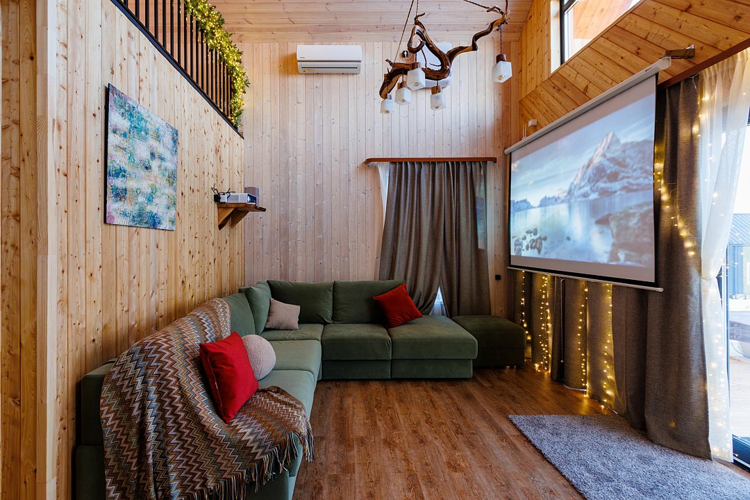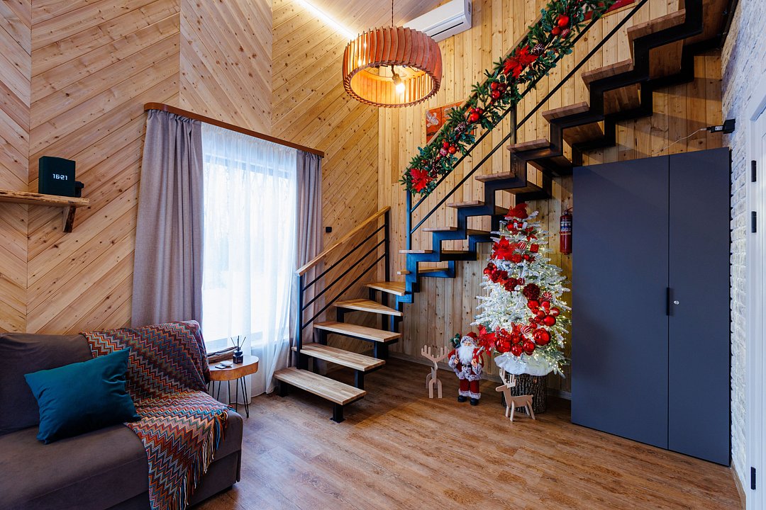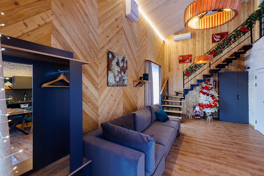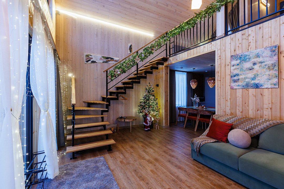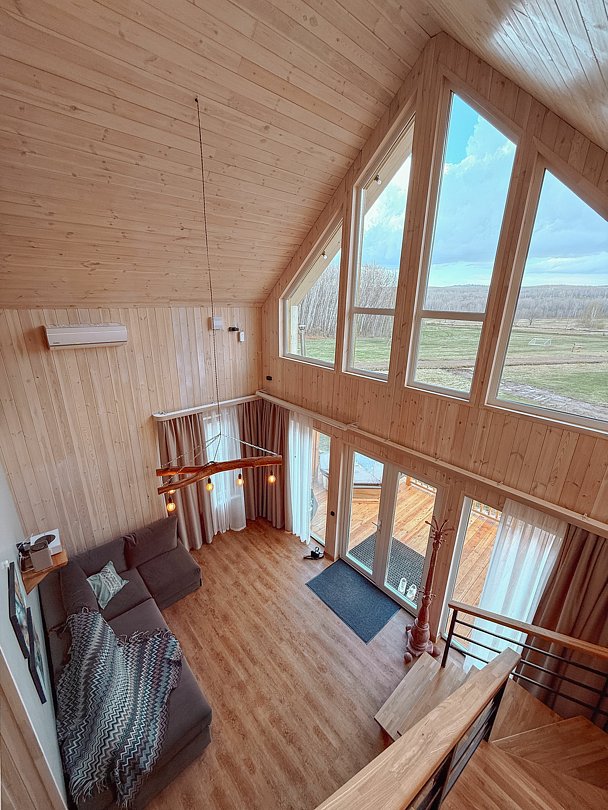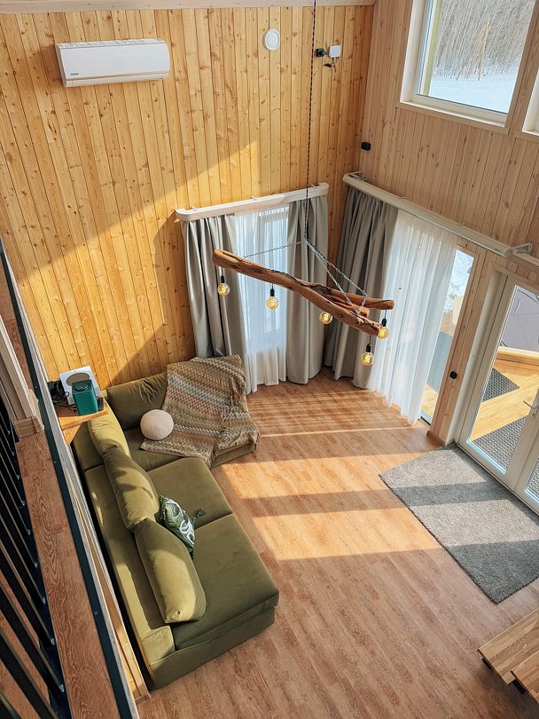 В доме просторная гостиная с большим диваном, одна спальня, санузел, высокие потолки, удобная безопасная лестница, теплый пол, Wi-fi, умная колонка с Алисой, книги, настольные игры, видеопроектор с большим экраном.