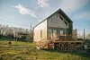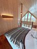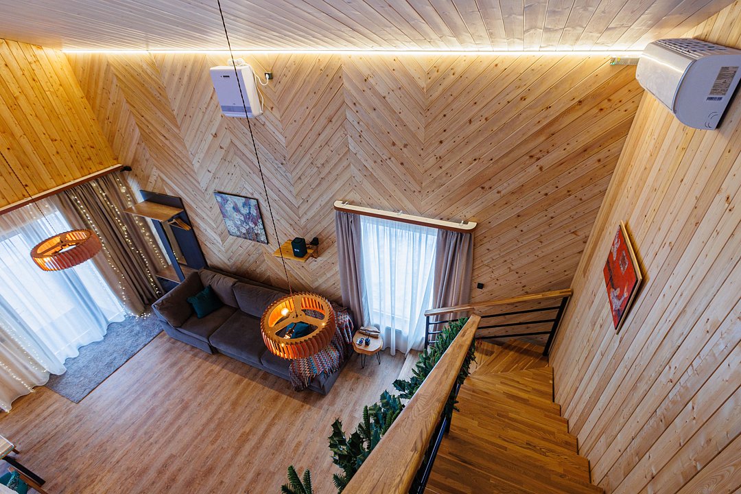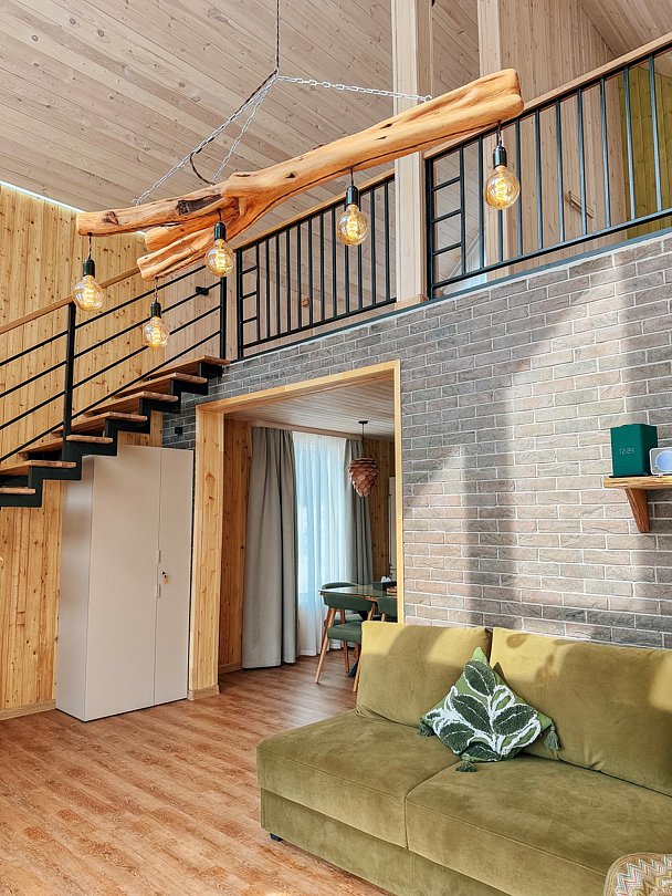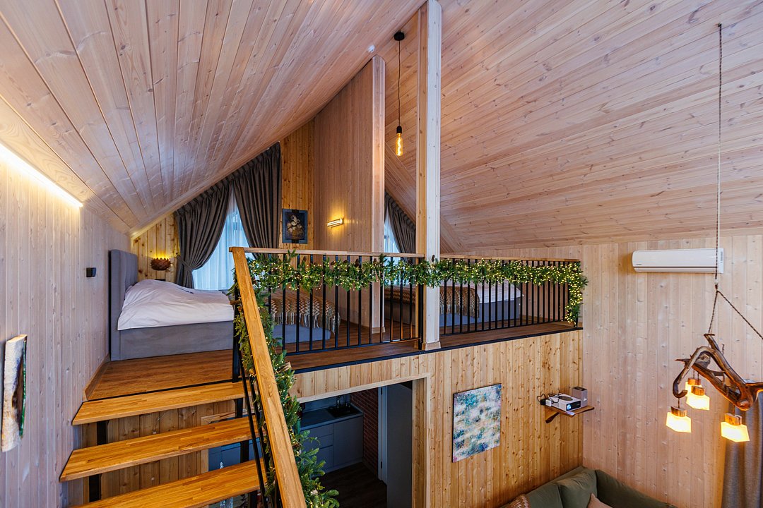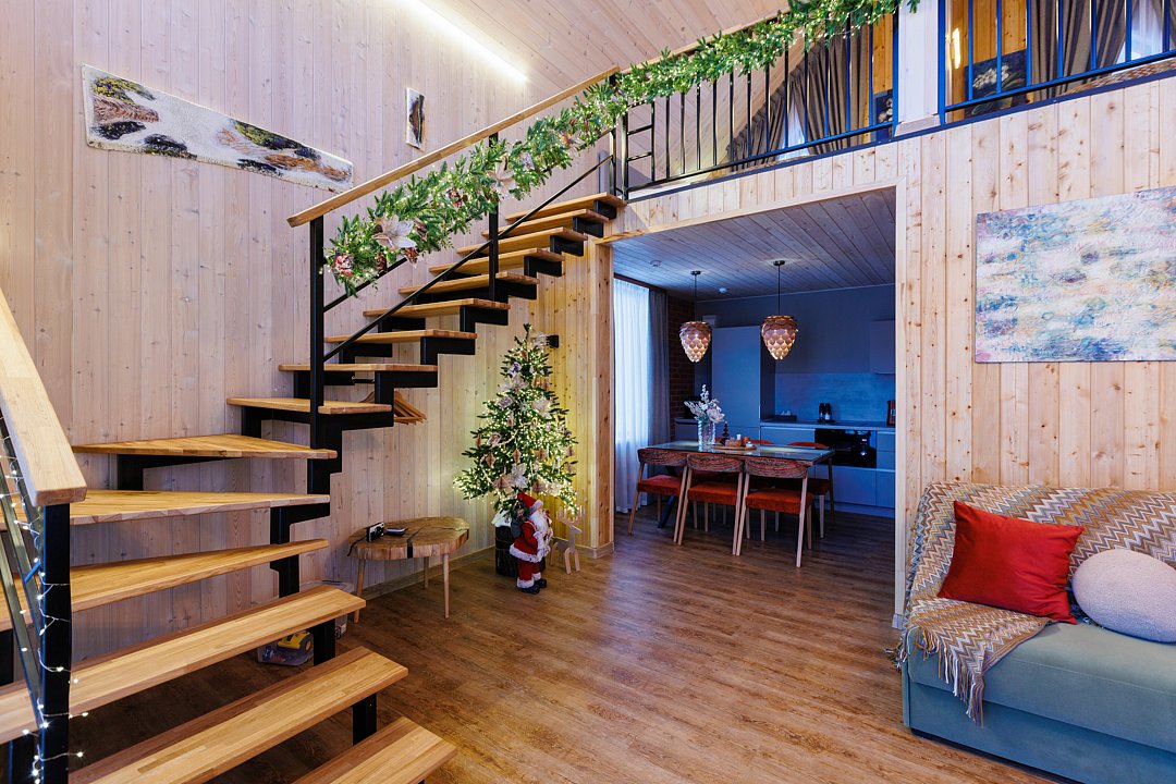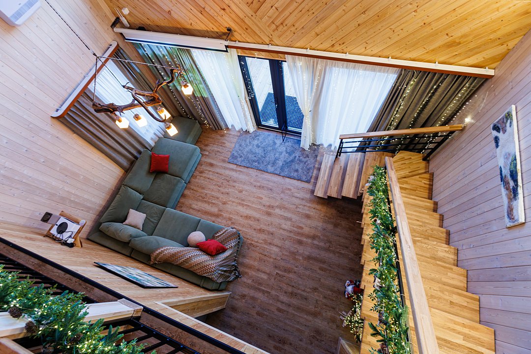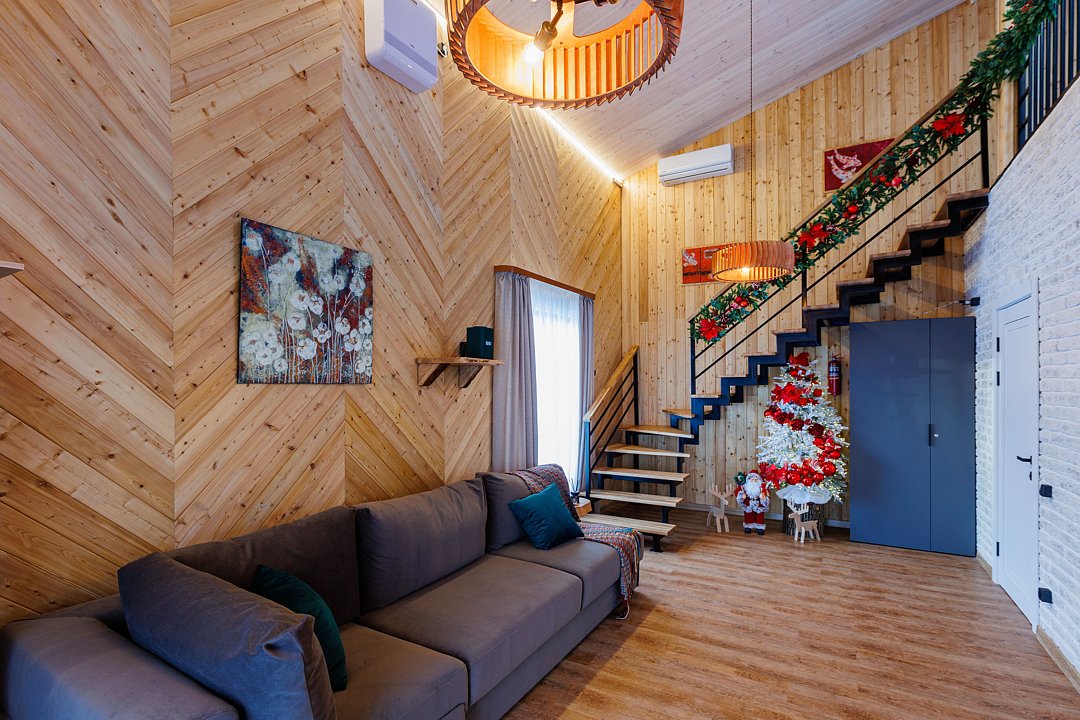 В доме просторная гостиная с большим диваном, одна спальня, санузел, высокие потолки, удобная безопасная лестница, теплый пол, Wi-fi, умная колонка с Алисой, книги, настольные игры, видеопроектор с большим экраном.